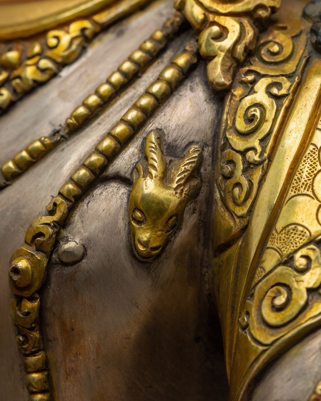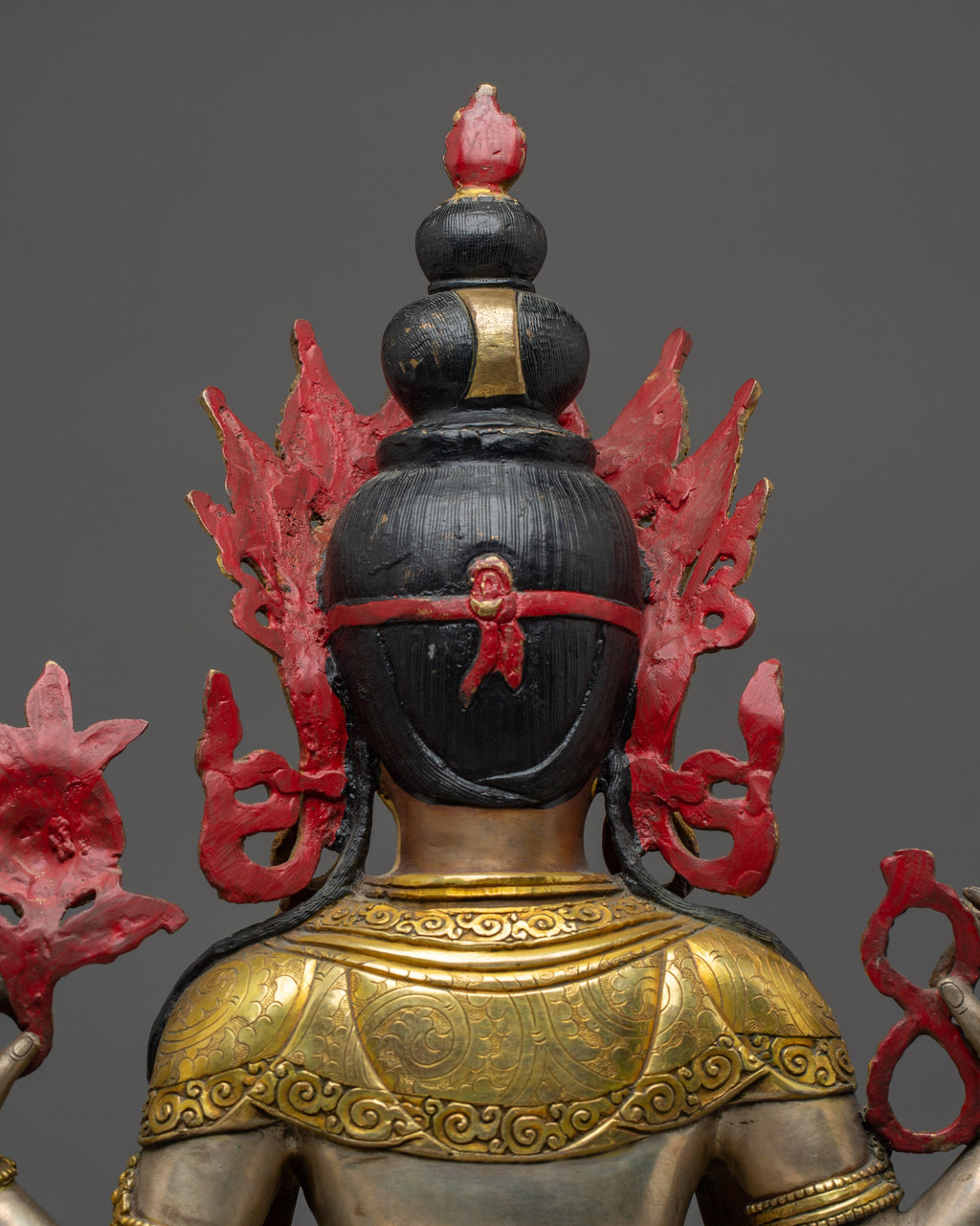 This statue of Avalokiteshvara, the Bodhisattva of Compassion, is a strong and calm representation of the Bodhisattva of Compassion. It is 19.1 inches in height and is made of silver-plated and gold-gilded copper. In Nepal, this stunning item is made by hand from copper. It is gilded with 24K gold and plated with silver, and it exemplifies the harmonic combination of dazzling light and reflected quiet. A wish-fulfilling jewel at the heart and a lotus are the traditional utensils that are carried by Chenrezig's four arms. Each of them represents a different symbol. This statue, which exudes grace and inspires devotion, is seated on a base that is shaped like a double lotus and weighs 9.51 kg.