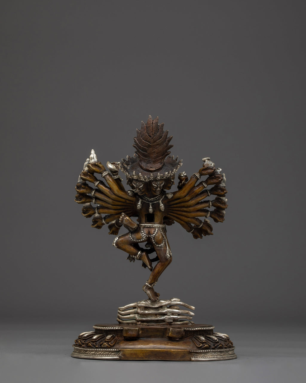 The contrast between the dark oxidized copper and the bright silver highlights lifts every detail, from the skull-cup decorations to the expressive movement frozen in heavenly dance. This statue sends powerful ceremonial energy into every spot it occupies.