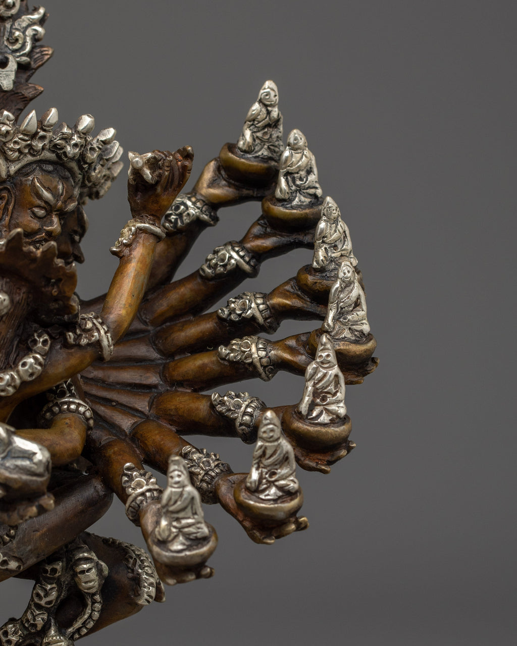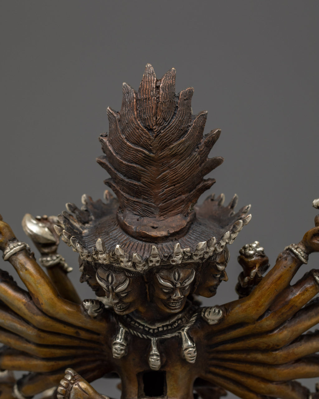 This 13.4-inch silver-plated Hevajra with Consort statue is a stunning representation of one of Vajrayana Buddhism's most significant and powerful deities. The statue, handmade in Nepal from oxidized copper and silver-plated, represents the agony and transcendence of the Hevajra Tantra. Hevajra, shown in Yab-Yum beside his wife Nairatmya, has numerous arms and enraged feelings, each bearing symbolic sacrifices to defeated deities.
