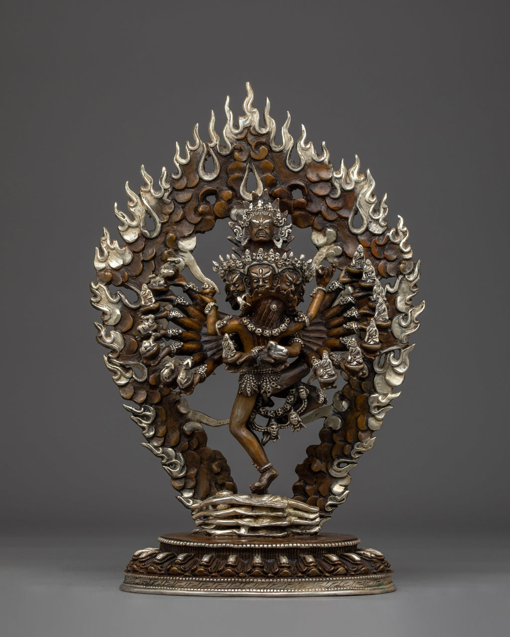 This religious sculpture, surrounded by a burning aureole symbolizing the fire of change, represents the destruction of the ego and the dance of enlightened consciousness. High-level Vajrayana practitioners, complex shrine structures, and serious collectors of Buddhist ritual art will appreciate this uncommon and powerful sculpture.