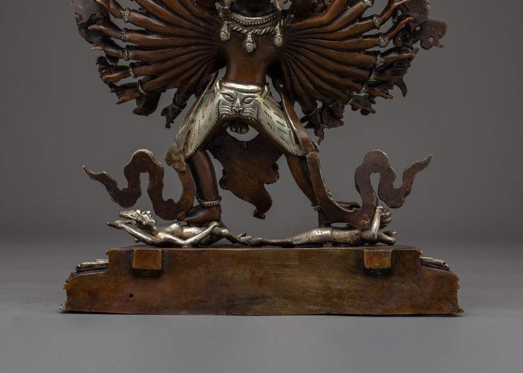 This sculpture, a blend of strong force and specific craftsmanship, is ideal for serious Vajrayana practitioners, rituals, and advanced meditation. The natural patina of copper lends gravity, while silver accents highlight the minute details, creating a sacred focal point for shrine spaces or high-level spiritual collections.