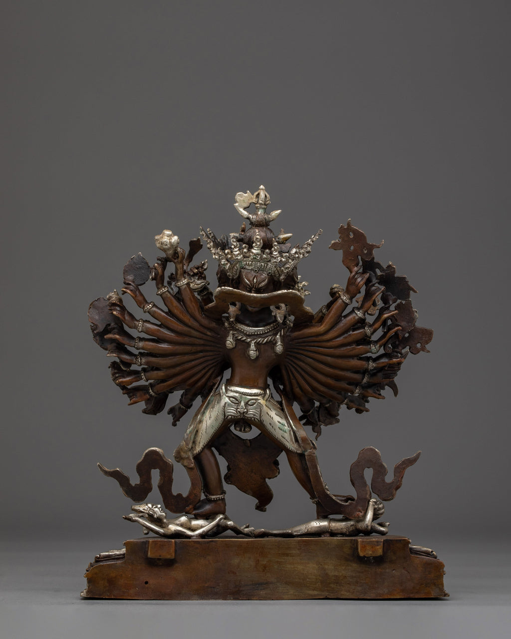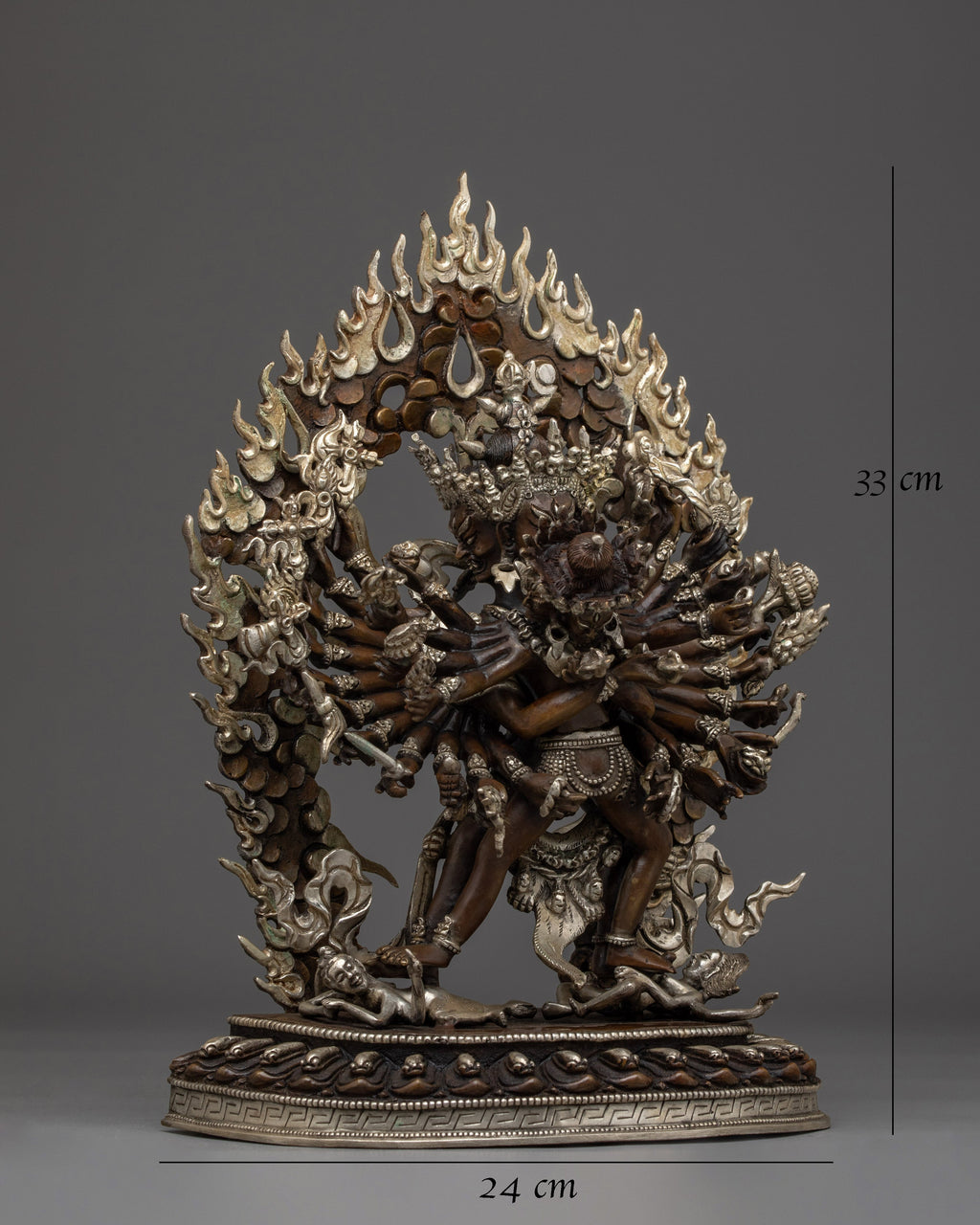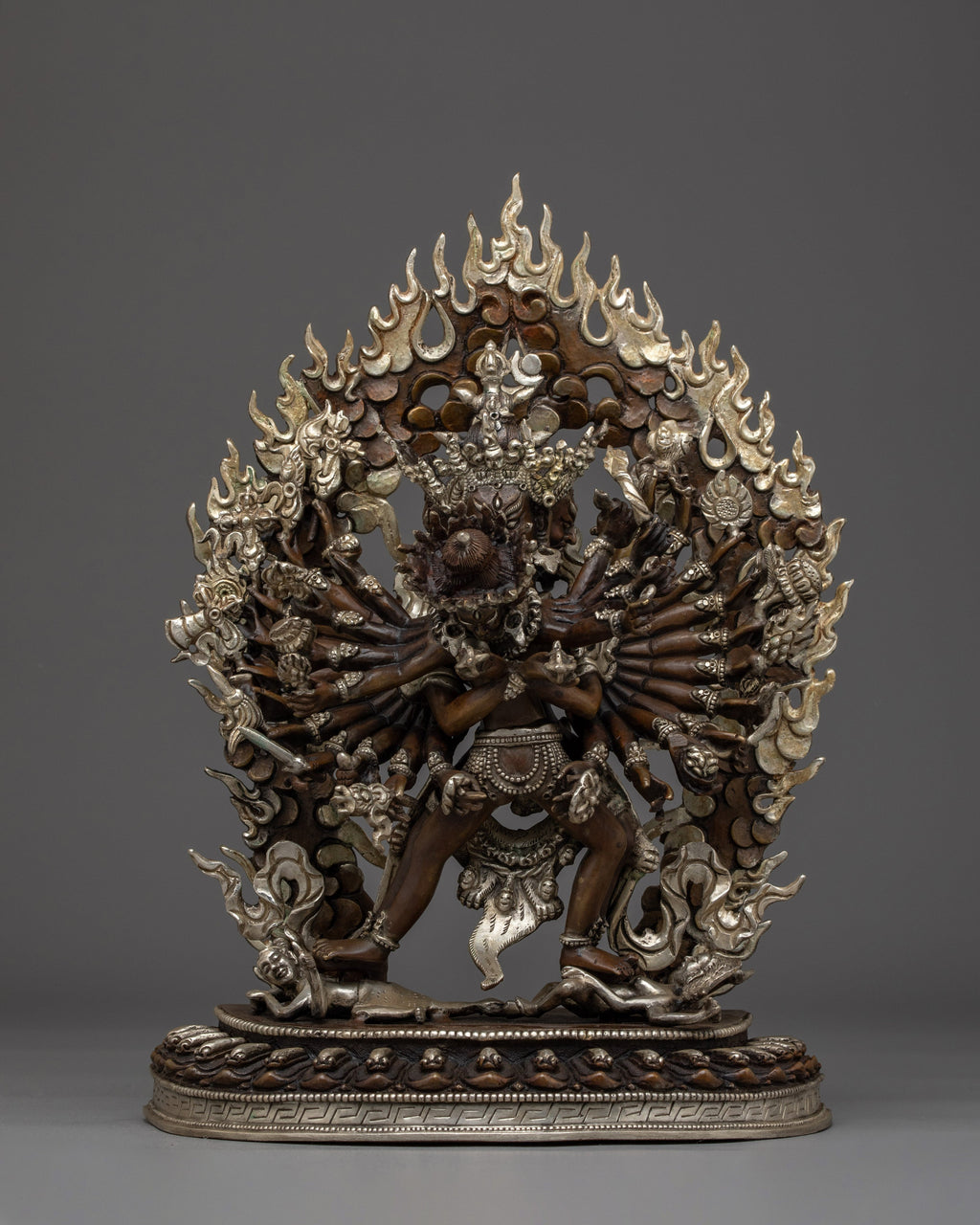 This 13-inch silver-plated Kalachakra statue in oxidized copper is a stunning representation of the Tantric deity known as the "Wheel of Time." The statue is expertly created in Nepal from oxidized copper with exquisite silver plating and symbolizes the intricate significance of time, cosmic balance, and enlightened action. The dynamic Yab-Yum with Vishvamata displays the god radiating transforming force through twenty-four wrathful arms and piercing expressions—all covered by a burning aureole filled with wisdom fires.