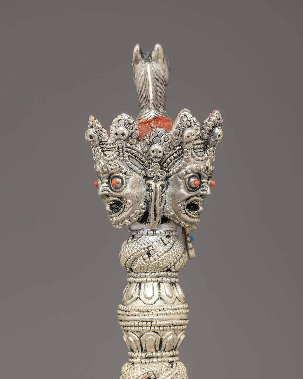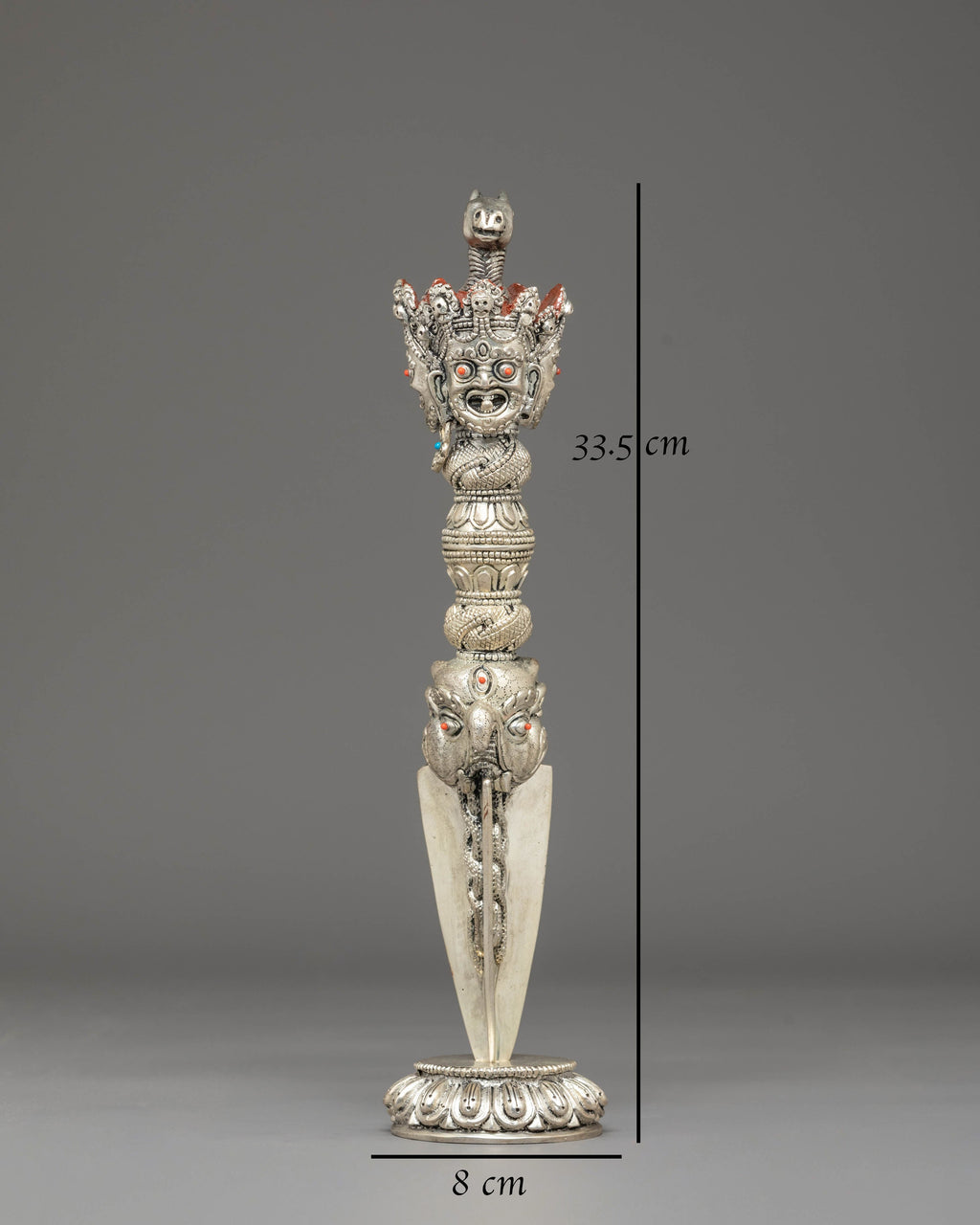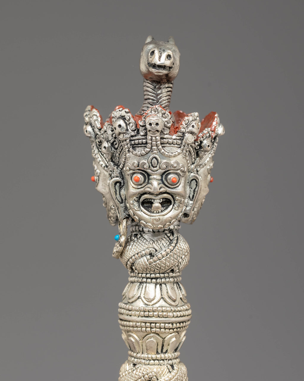 The handle features a wrathful deity head—symbolizing protection, transformation, and the power to subdue hostile forces. Surrounding the central figure are elaborate motifs of serpents and traditional ritual symbols, each meticulously carved to reflect ancient Tibetan iconography. Beneath the deity, three fierce animal heads form the base of the handle, representing mastery over inner and outer obstacles. The phurba’s lower section reveals the iconic three-edged blade, symbolizing the cutting through of ignorance, attachment, and aversion. The silver plating brings out every intricate detail, giving the piece a luminous, sacred presence.