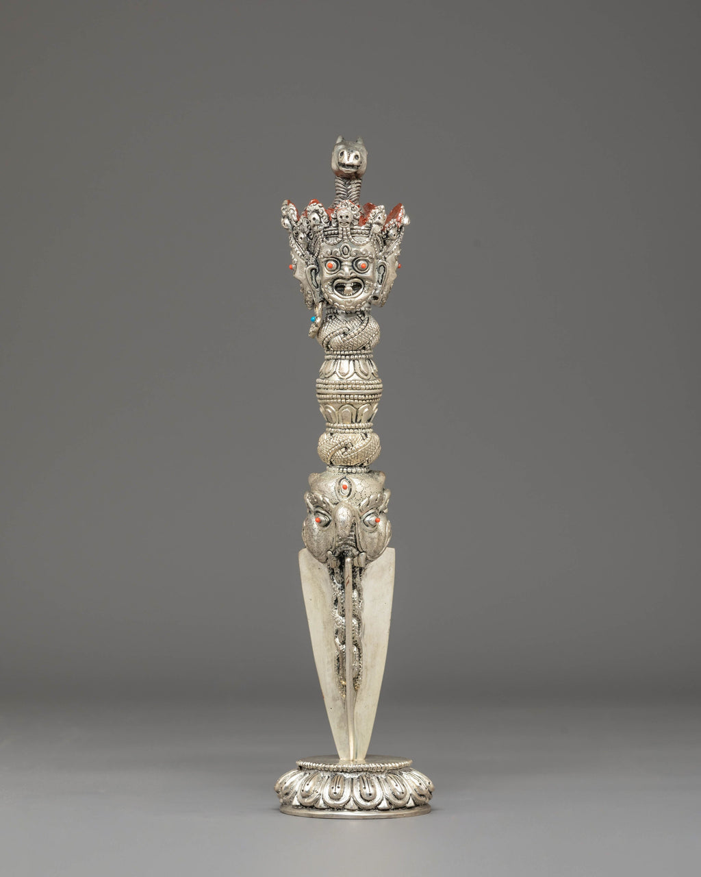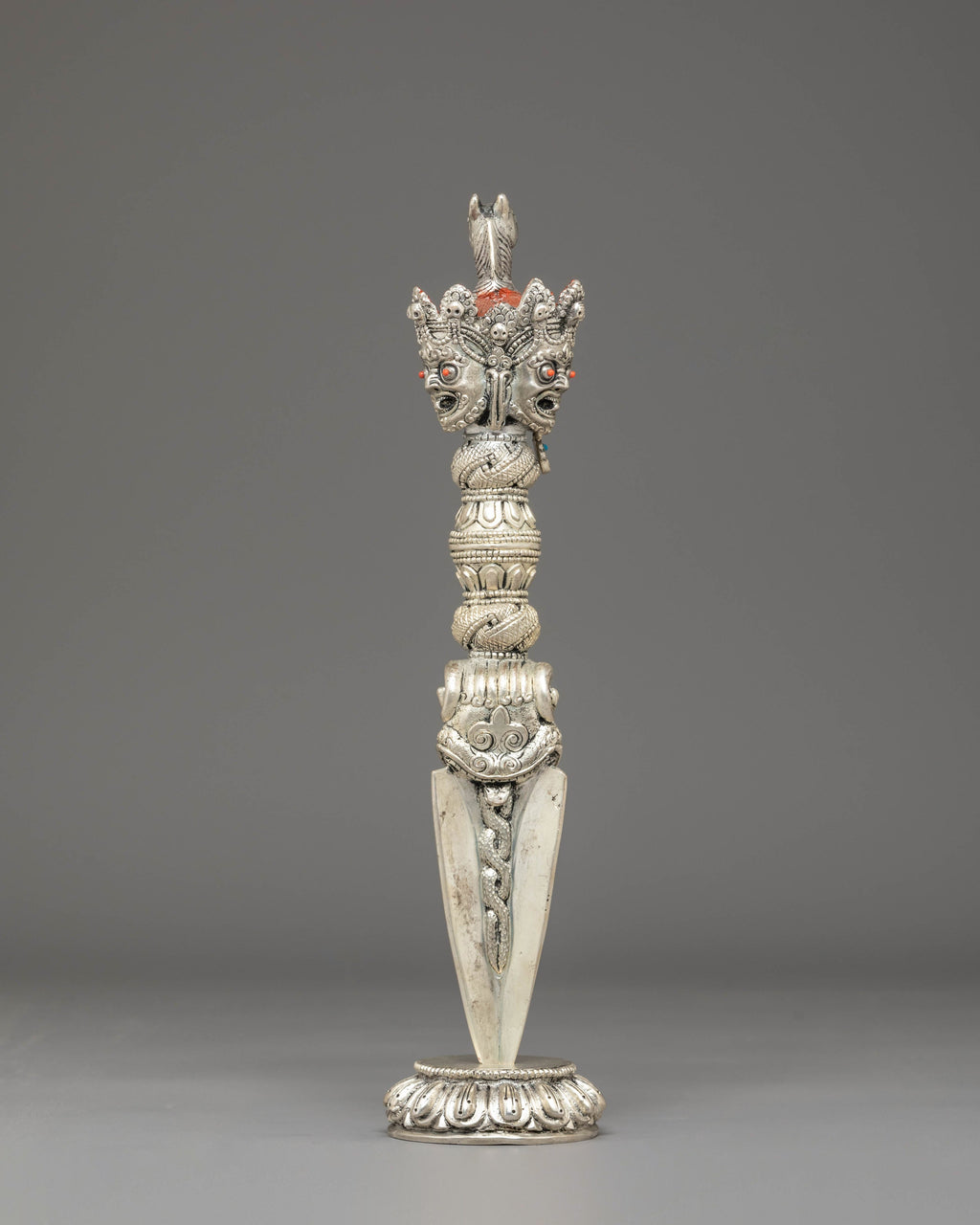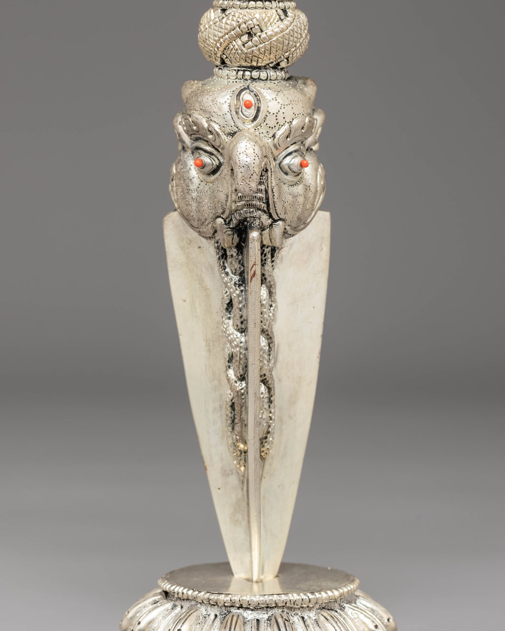 The handle features a wrathful deity head—symbolizing protection, transformation, and the power to subdue hostile forces. Surrounding the central figure are elaborate motifs of serpents and traditional ritual symbols, each meticulously carved to reflect ancient Tibetan iconography. Beneath the deity, three fierce animal heads form the base of the handle, representing mastery over inner and outer obstacles. The phurba’s lower section reveals the iconic three-edged blade, symbolizing the cutting through of ignorance, attachment, and aversion. The silver plating brings out every intricate detail, giving the piece a luminous, sacred presence.