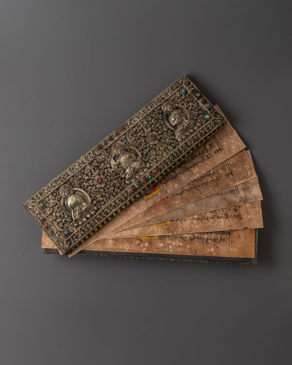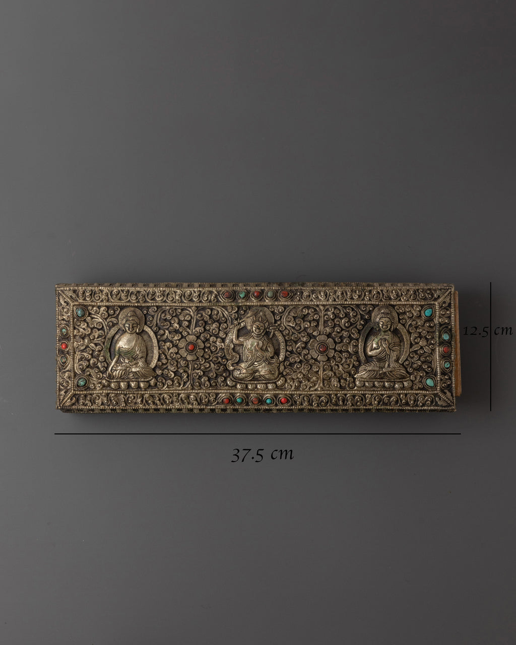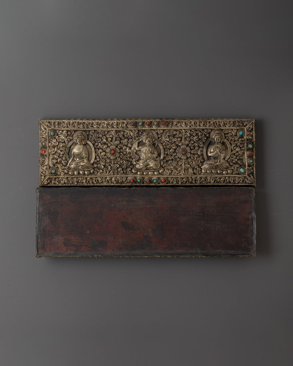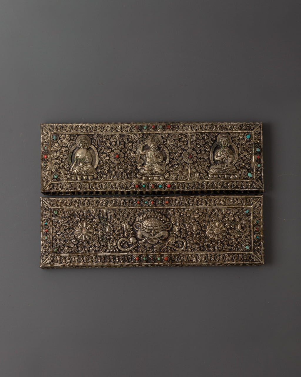 The coral inlay enhances the piece with spiritual vitality and protection, while the silver radiates purity and clarity. Each carved deity holds profound meaning: Vairochana, the embodiment of ultimate truth and universal wisdom; Ratnasambhava, symbolizing abundance and generosity; and Manjushri, the Bodhisattva of wisdom, cutting through ignorance with clarity. This sacred book is more than an altar ornament; it is a spiritual treasure that embodies knowledge, compassion, and enlightenment.