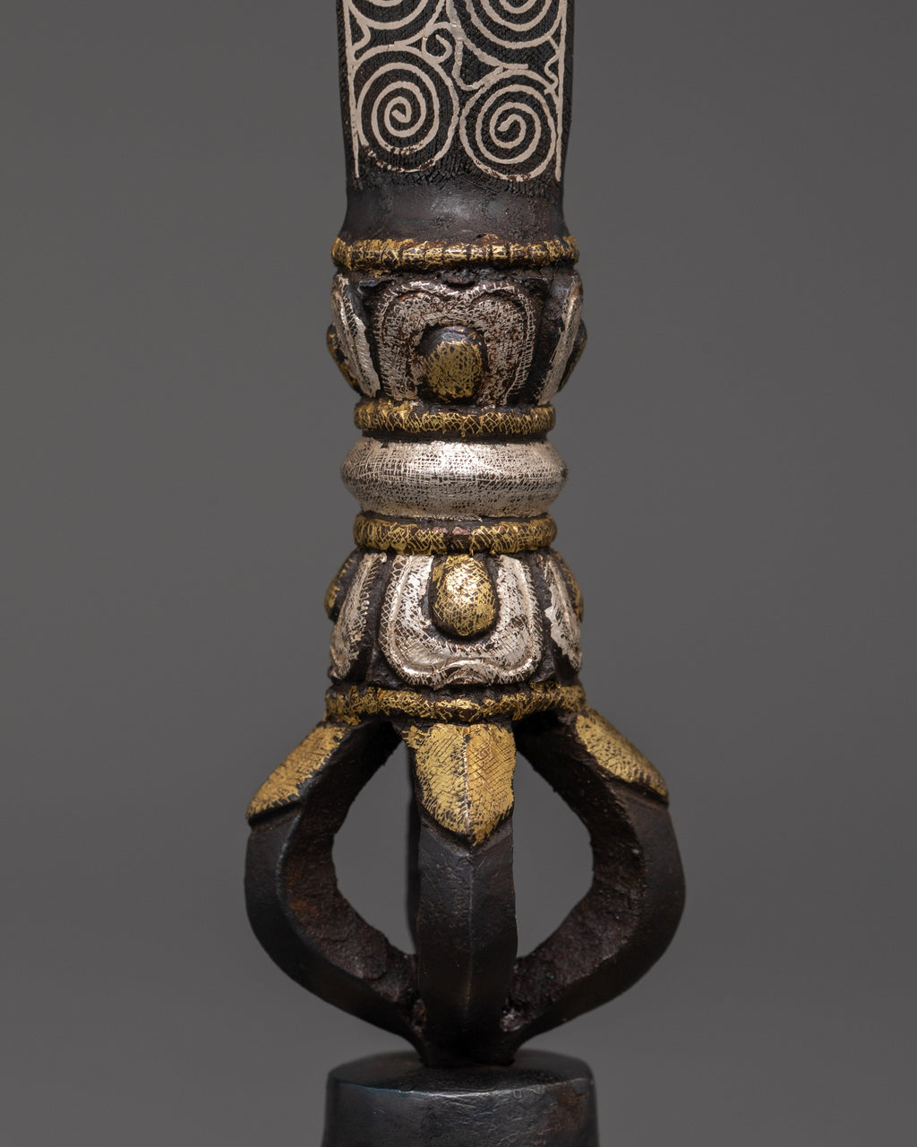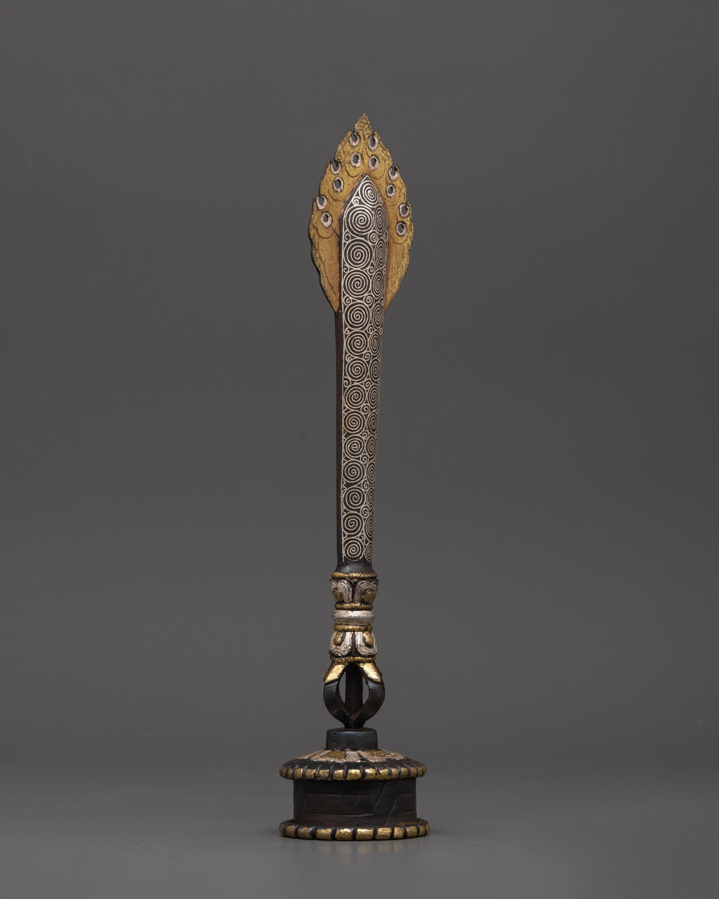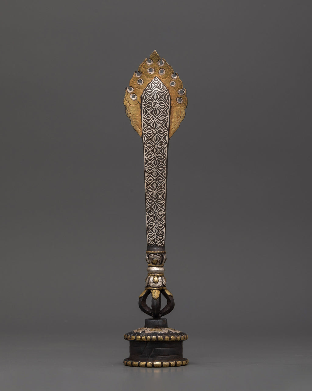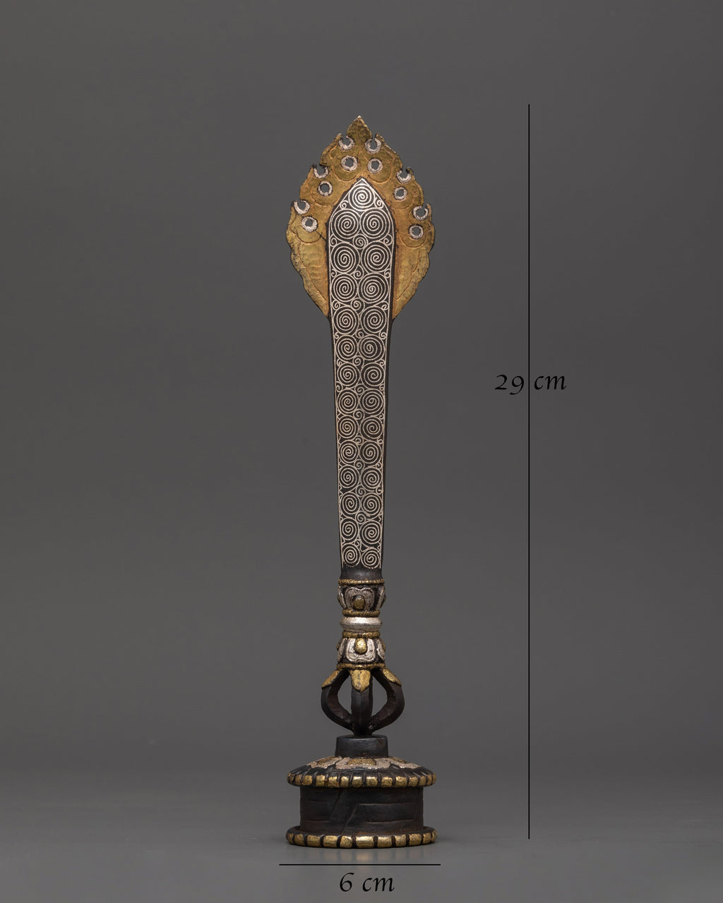 This silver-plated ritual dagger with a stand is meticulously crafted from inlaid iron and finished with a silver plating. This ceremonial sword, measuring 29 cm in height and 6 cm in width, is both visually appealing and immensely significant. The dagger features elaborate decorations, including a half Vajra at the base, which represents the unbreakable nature of truth, and a flame design at the top, symbolizing spiritual illumination and divine strength. This dagger is a sacred tool for protection and energy purification, making it an ideal addition for individuals seeking an exceptional and authentic element for their Tibetan altar or ritual area.