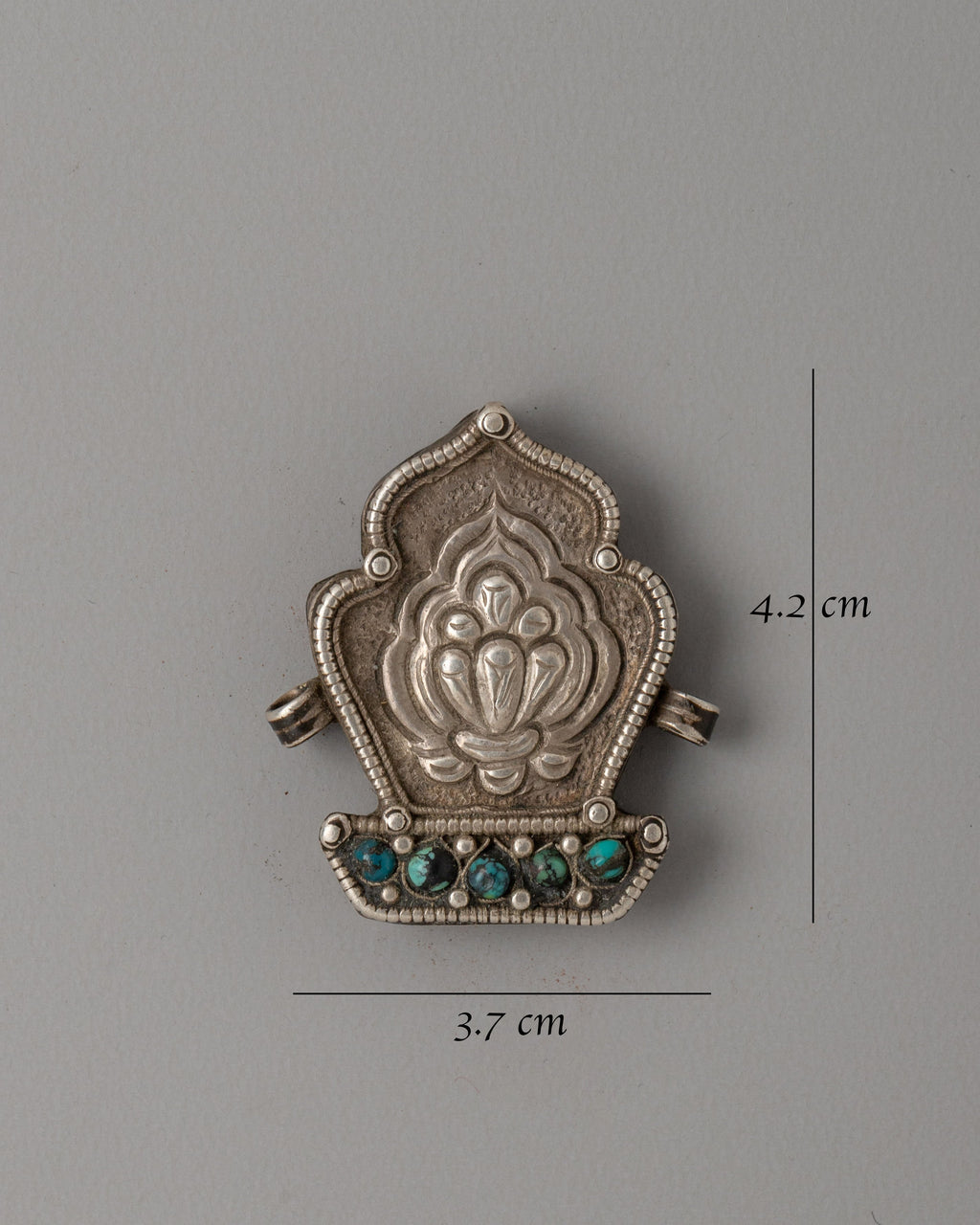 This stunning Silver-Plated Tibetan Ghau Box Pendant, measuring 4.2 cm in height and 3.7 cm in width, is a little and essential piece of spiritual jewelry. It weighs only 0.014 kg and is composed of copper with silver plating and turquoise. This Ghau, traditionally used as a portable prayer box, is ideal for transporting sacred mantras, relics, or modest sacrifices, making it an essential addition to meditation or spiritual practice.