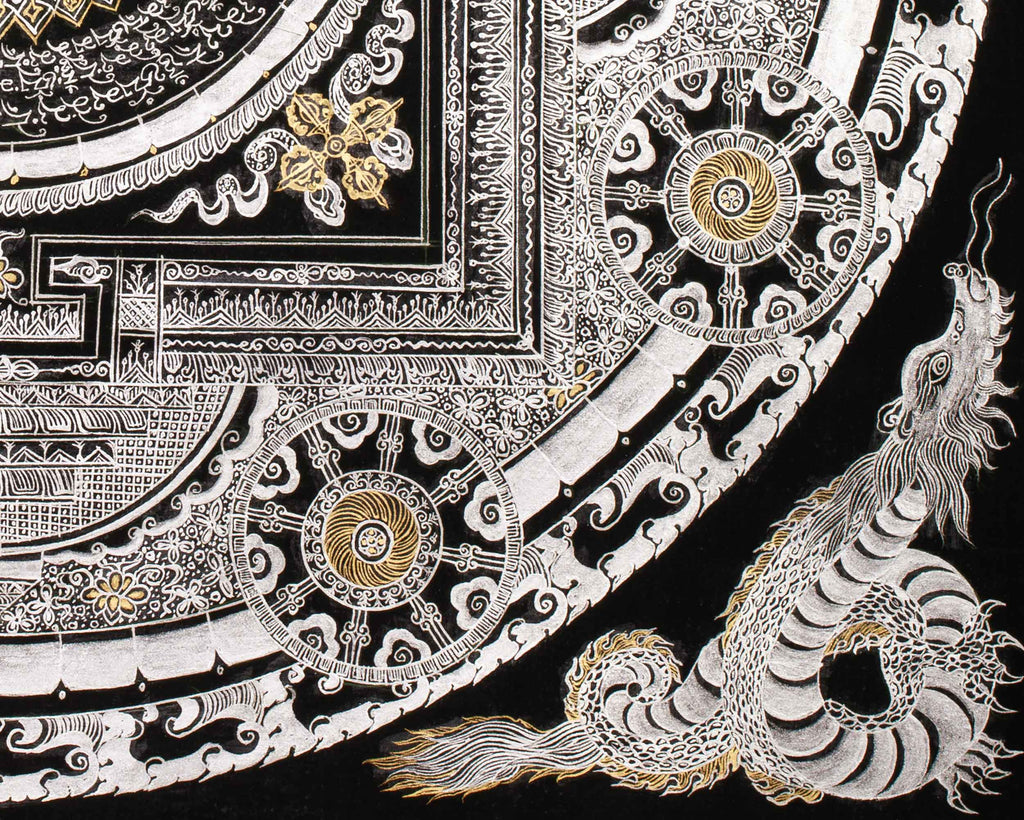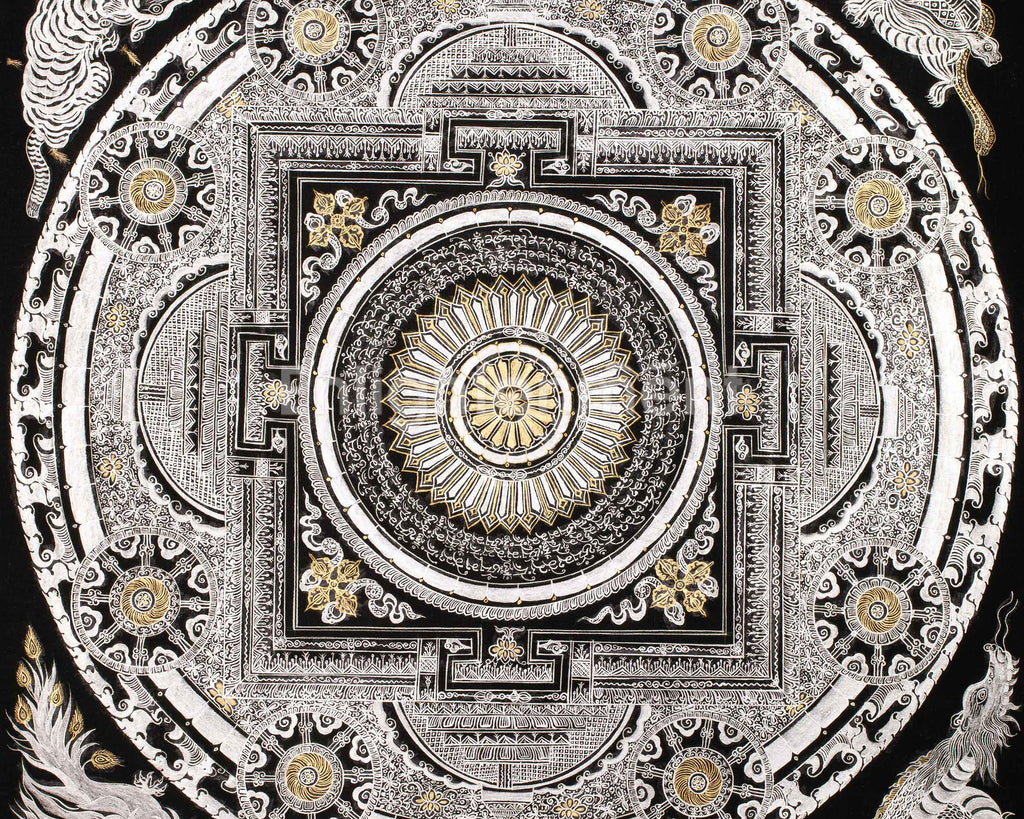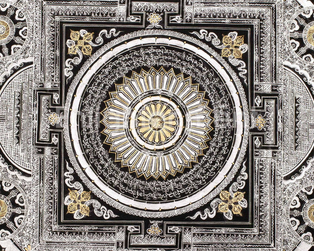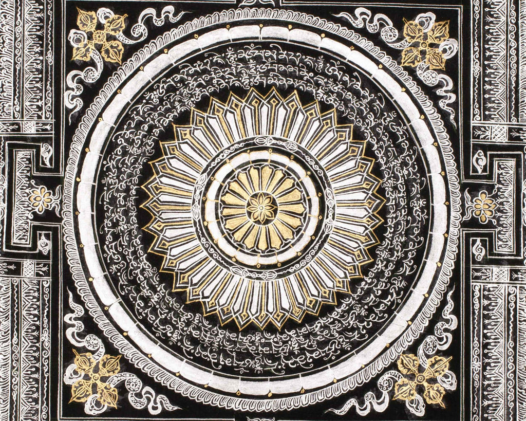 The mandala features a square palace at its core, surrounded by concentric circles that represent the universe's ideal state. This pattern fosters reflection, balance, and spiritual focus. Sacred inscriptions found in specific circular bands around the center depict mantras—visual prayers that extend intention outward, cleansing both space and mind. The outer rings feature protective syllables, while the inner circles draw the viewer's eye toward the tranquil focus point at the center.