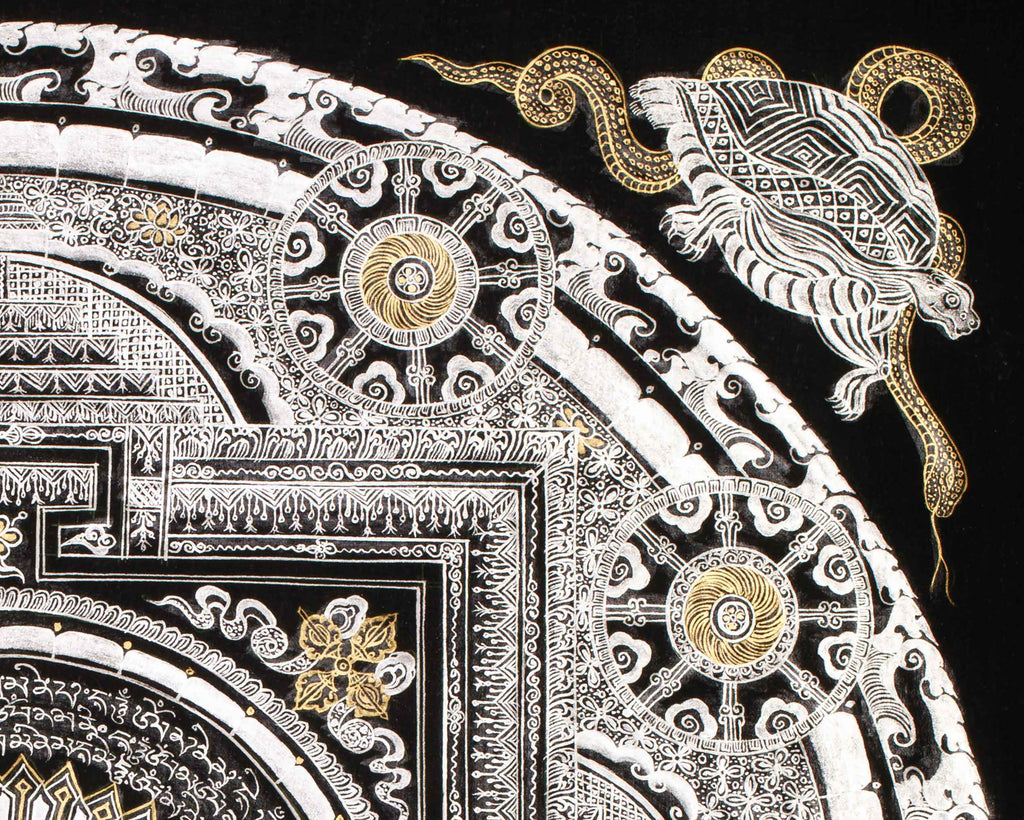 Additionally, mythical creatures anchor the four corners: a tiger symbolizing power, a turtle for stability, a dragon embodying transformation, and a bird denoting freedom. Together, these elements create a dynamic, protective energetic field that preserves the sacred geometry and amplifies its harmony.