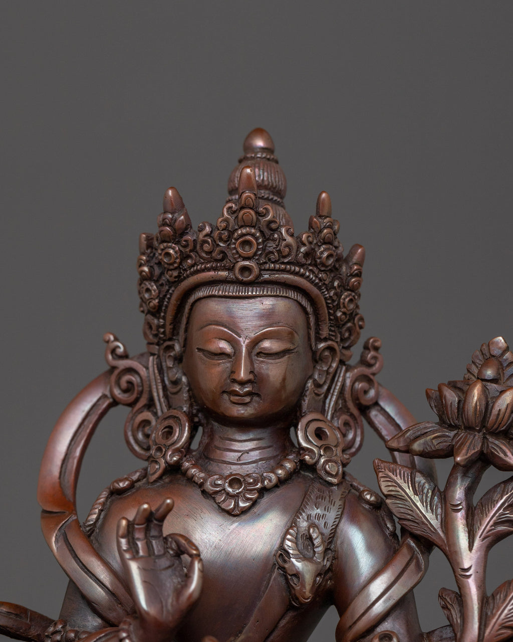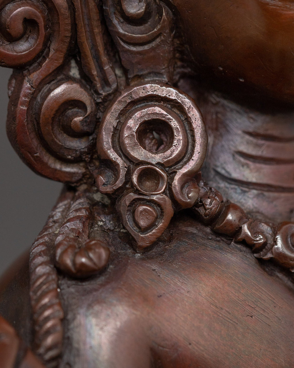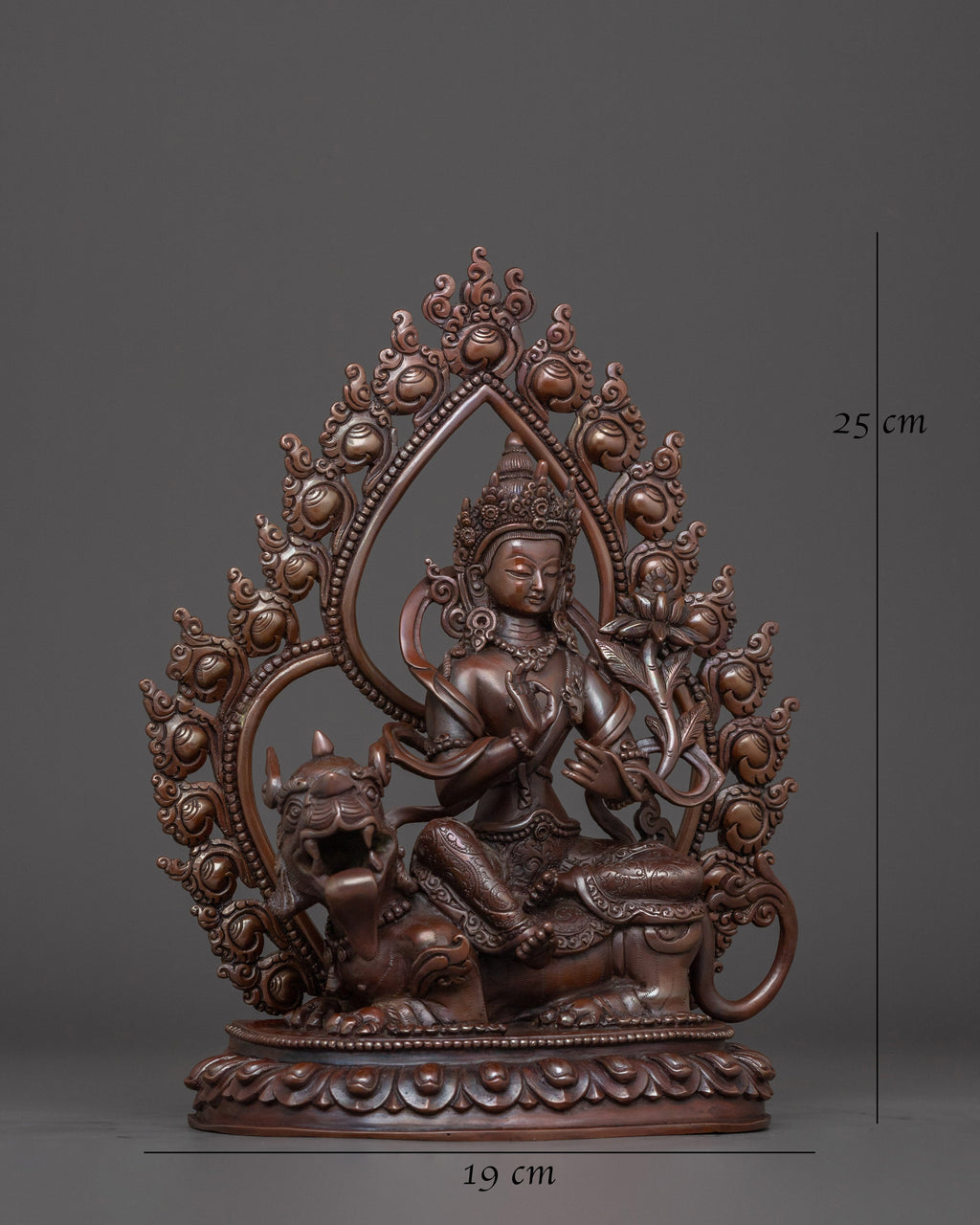 The Simhanada Avalokiteshvara Statue, also known as the Compassionate One, stands at 9.8 inches (25 cm) in height, with a 7.5-inch (19 cm) base. Made of oxidized copper, its weight of 2.59 kg adds to its durability and stability. Admire its intricate design and feel a sense of peace as it radiates its compassionate energy.
