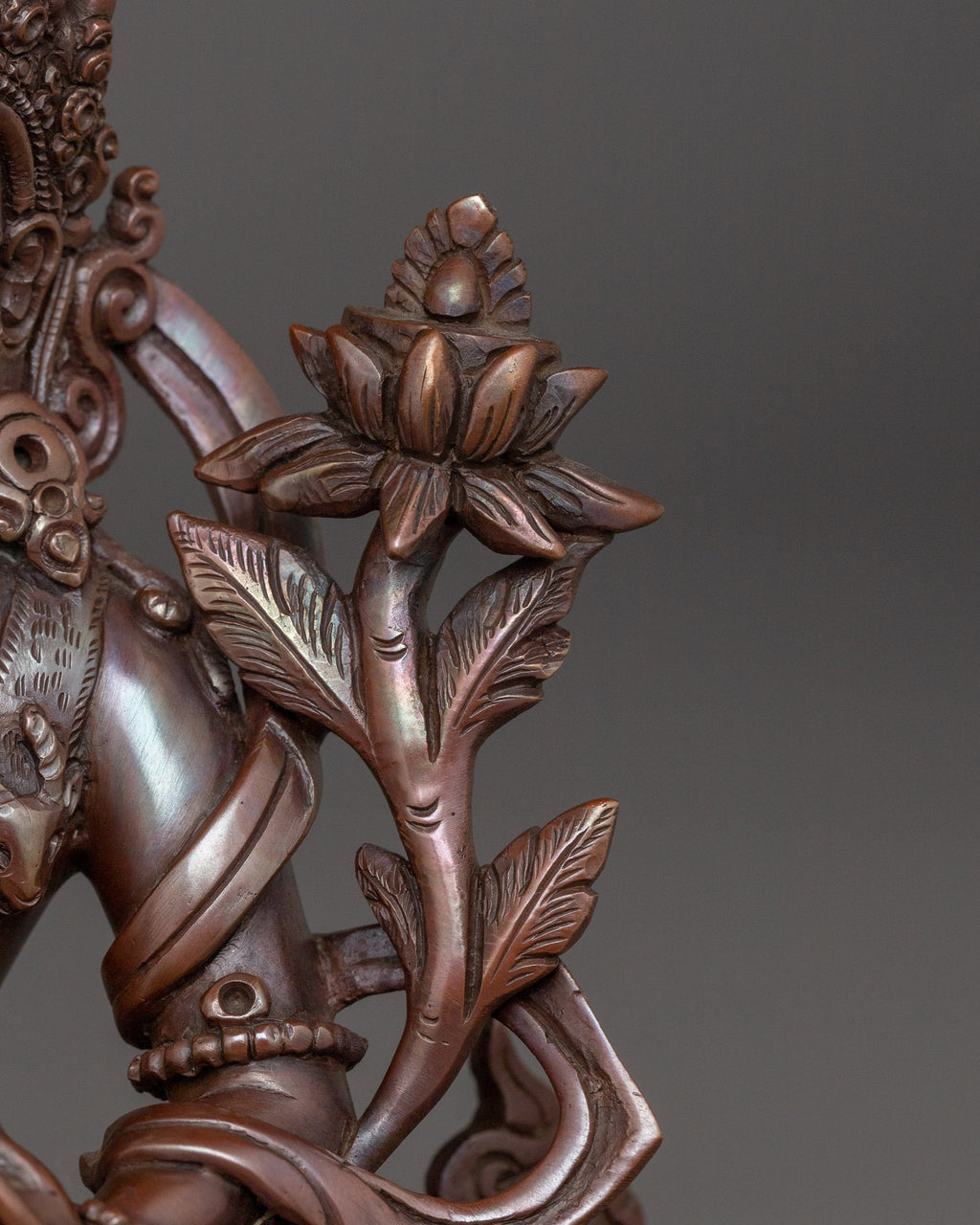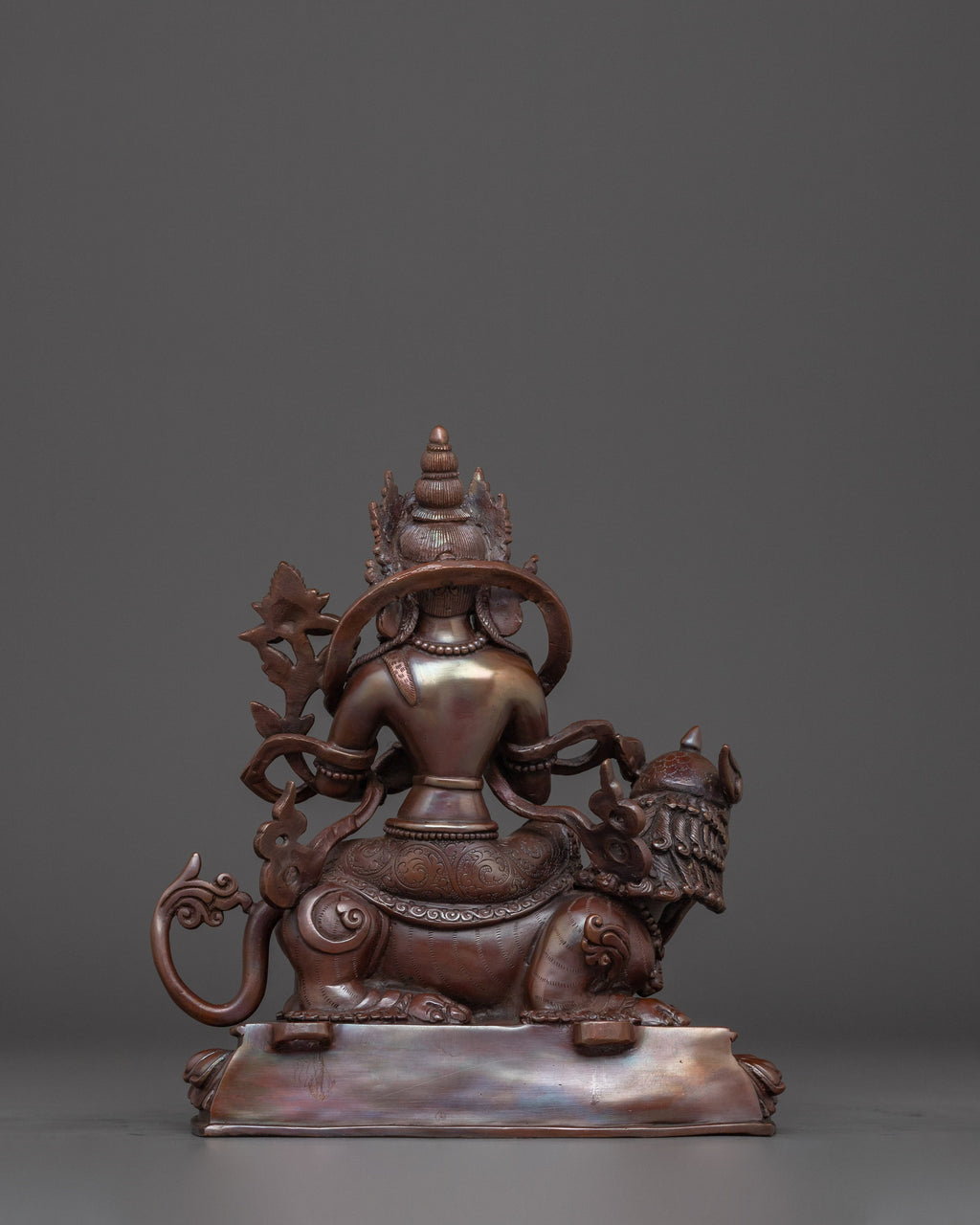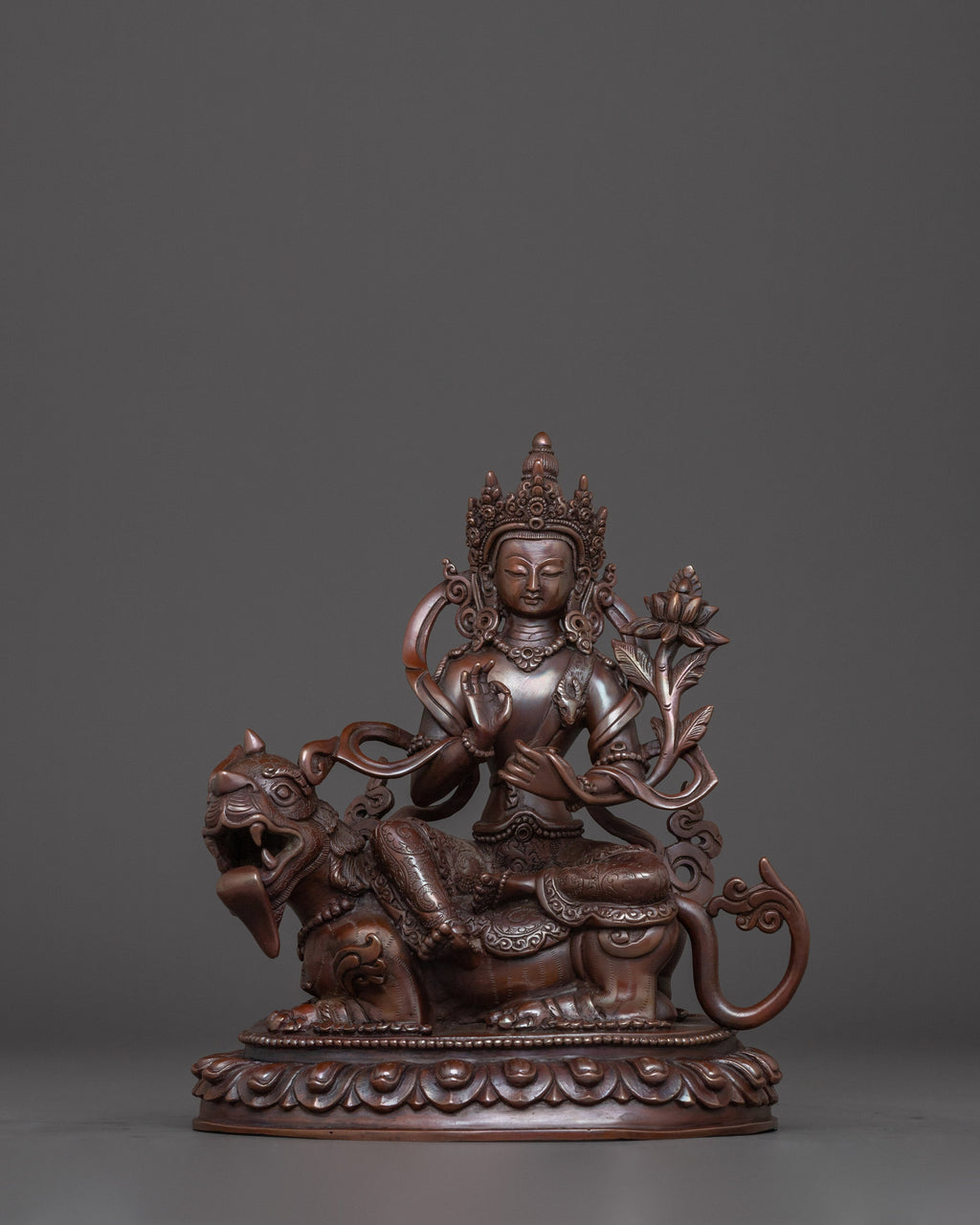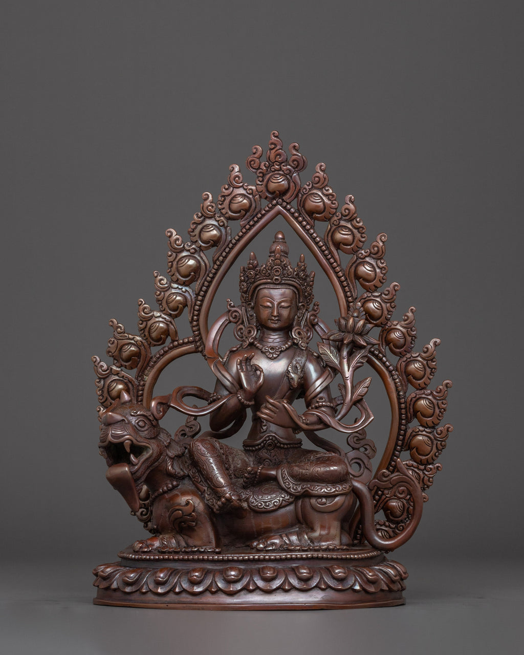 The statue is shown seated majestically on a lion, symbolizing fearlessness, power, and the ability to dispel evil and ignorance. The lion is also a symbol of royalty and wisdom. One hand is raised in vitarka mudra. Another hand holds alotus flower(padma), symbolizing purity and spiritual awakening. Halo behind the figure represents spiritual radiance and the Bodhisattva’s enlightened nature. Simhanada Avalokiteshvara is adorned with a crown and rich jewelry, signifying his royal, enlightened status.