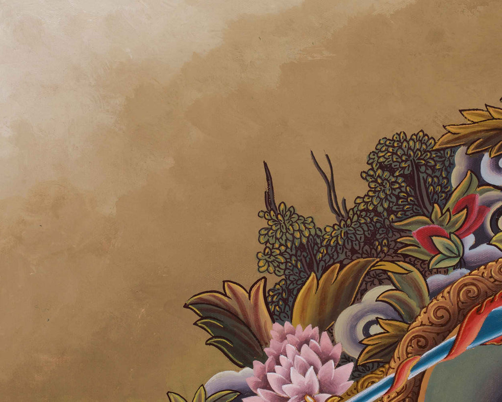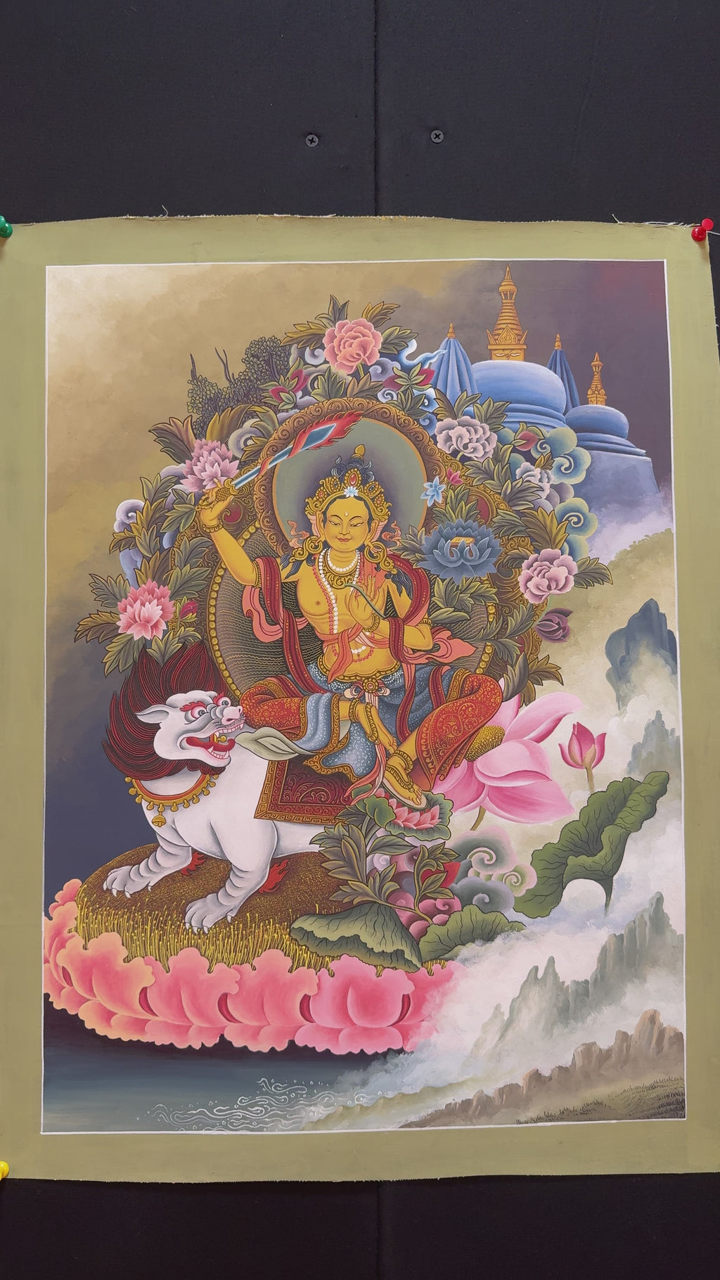 In this thangka, Manjushri is depicted riding a lion, which symbolizes strength, courage, and the ability of wisdom to conquer ignorance. In one hand, he holds his iconic flaming sword, representing the cutting away of delusion and the illumination of the path to enlightenment. The vibrant lion beneath him emphasizes the fearless nature of wisdom. Surrounding him are lush flowers, a stupa, and a serene landscape that creates a peaceful balance, reflecting the harmony between power and peace in Manjushri’s teachings.