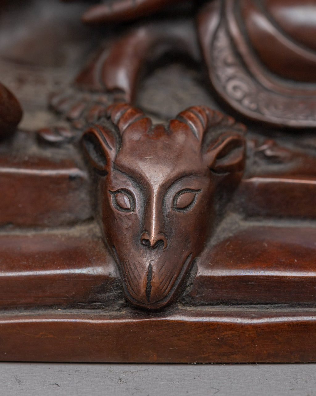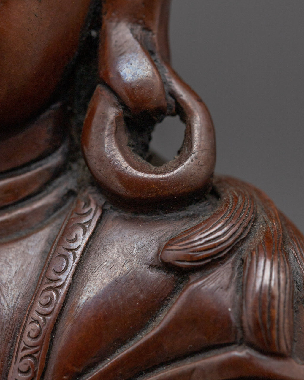 Milarepa is depicted with long earrings, symbolizing his renunciation and spiritual attainment. In his right hand, he holds a kapala (skull cup), representing transformation and the impermanence of life. His left hand is cupped to his ear, signifying his deep listening to the teachings and the sounds of truth. He sits on a deer skin placed on a pedestal, a traditional seat associated with ascetics and monks during meditation. This use of deer skin reflects a close connection to nature, simplicity, and a life of renunciation. His simple robe further emphasizes his ascetic lifestyle and devotion to spiritual practice.