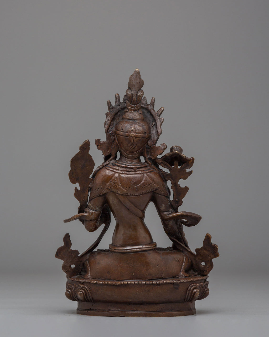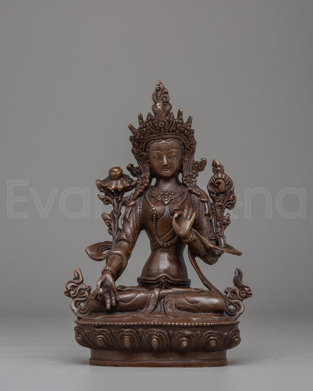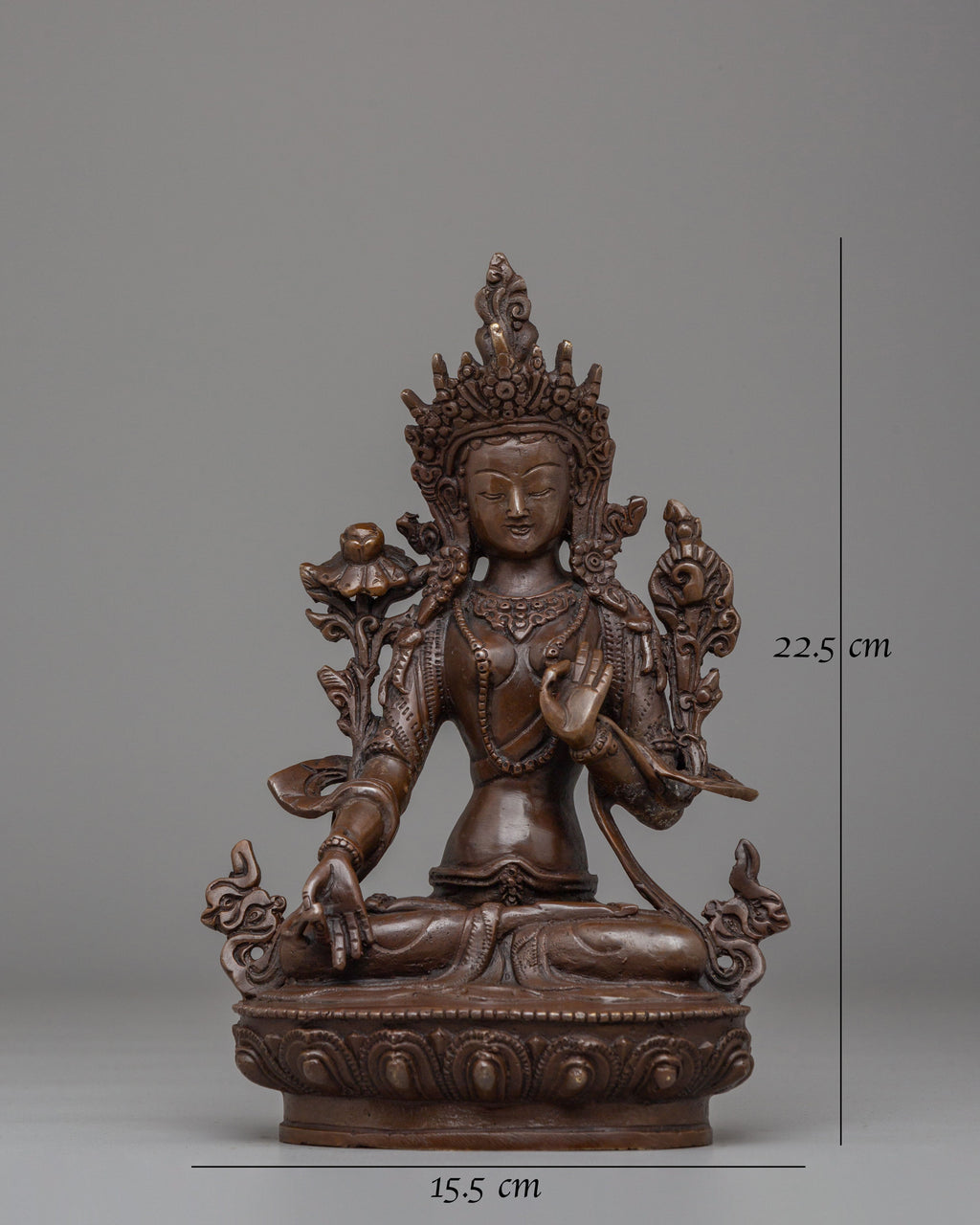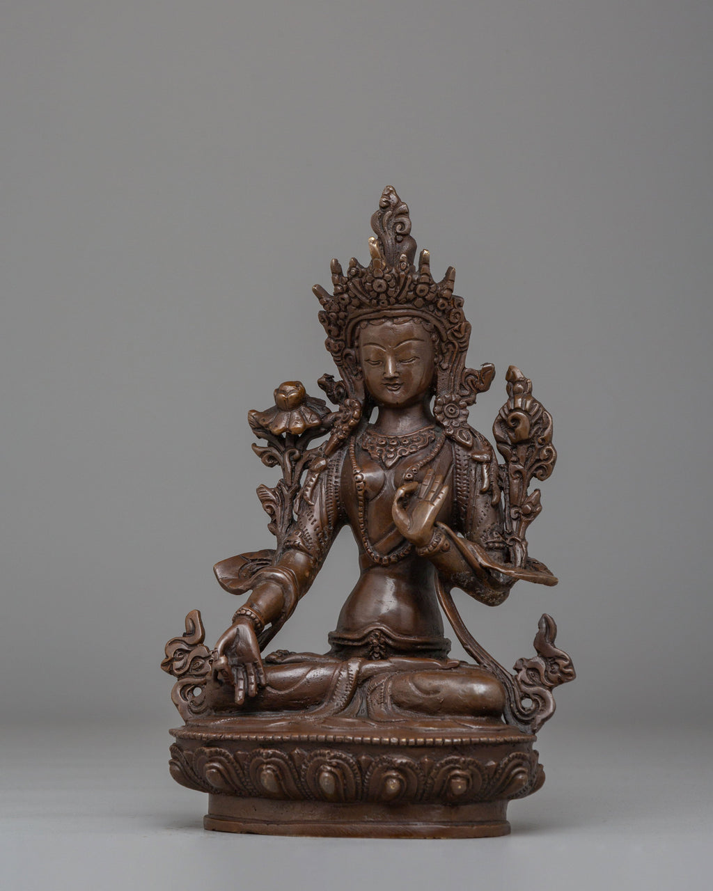 Sita Tara, revered as the Goddess of Compassion, Healing, and Longevity, represents peace, nurturing energy, and spiritual protection. She is often associated with healing and long life, offering comfort and guidance to practitioners. Her gentle expression reflects calm awareness and kindness, while the lotus symbolizes purity rising above worldly attachments. The oxidized copper surface enhances the carved details, giving the statue a grounded and authentic Himalayan character aligned with Buddhist tradition.