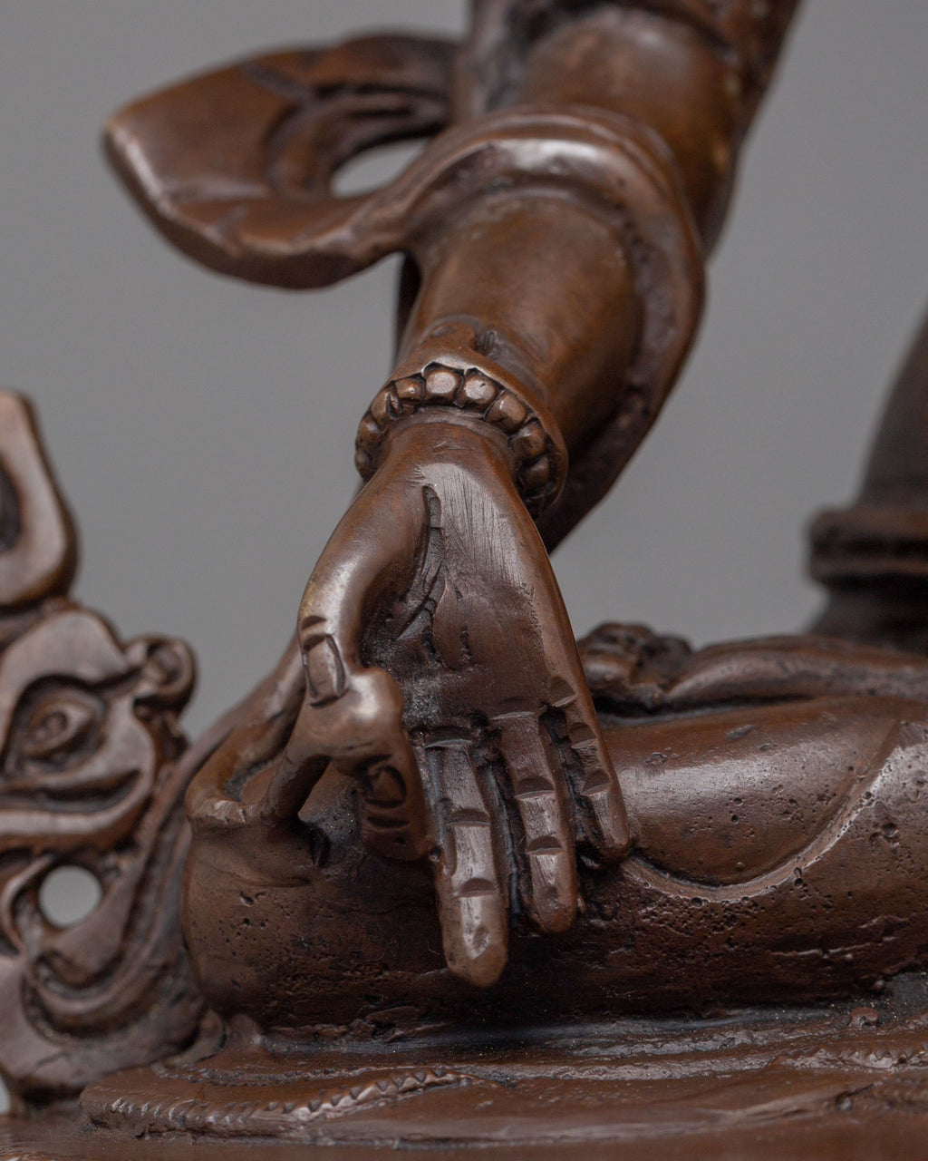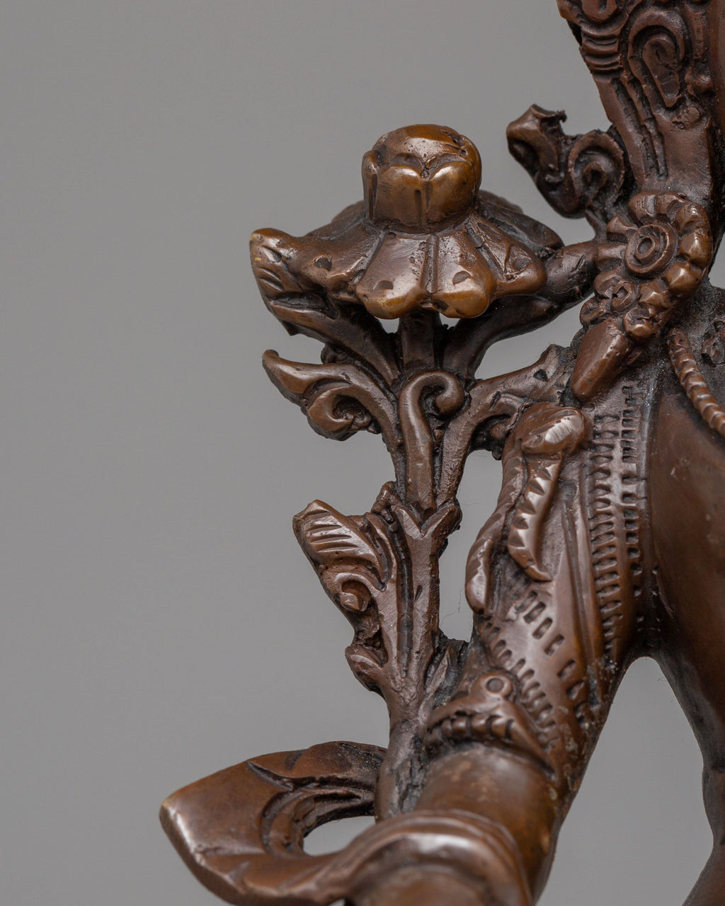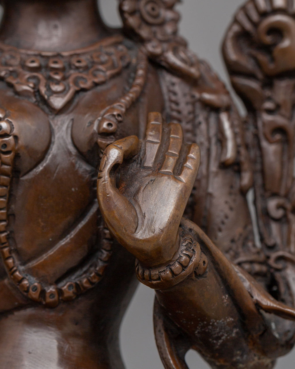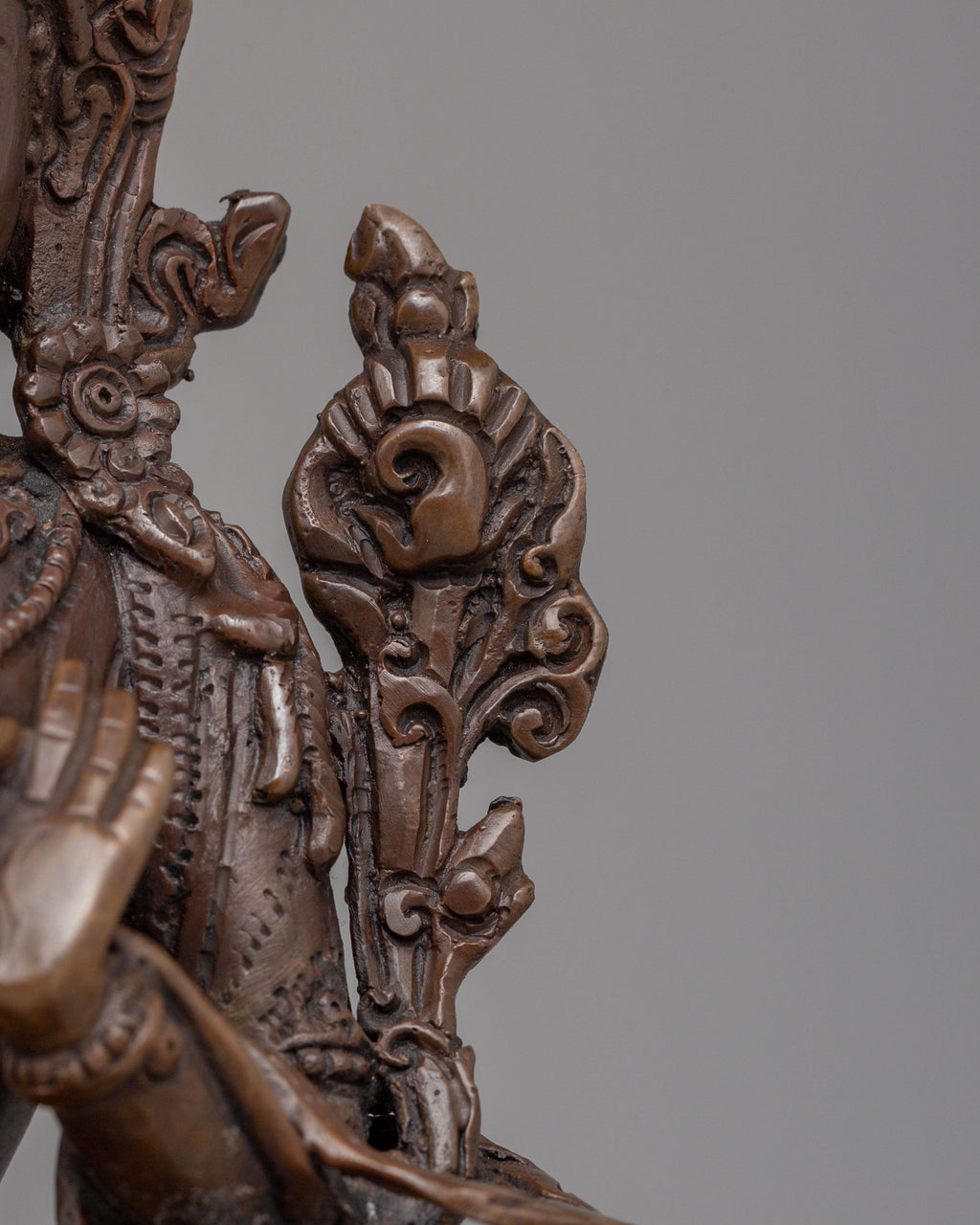 Sita Tara, revered as the Goddess of Compassion, Healing, and Longevity, represents peace, nurturing energy, and spiritual protection. She is often associated with healing and long life, offering comfort and guidance to practitioners. Her gentle expression reflects calm awareness and kindness, while the lotus symbolizes purity rising above worldly attachments. The oxidized copper surface enhances the carved details, giving the statue a grounded and authentic Himalayan character aligned with Buddhist tradition.