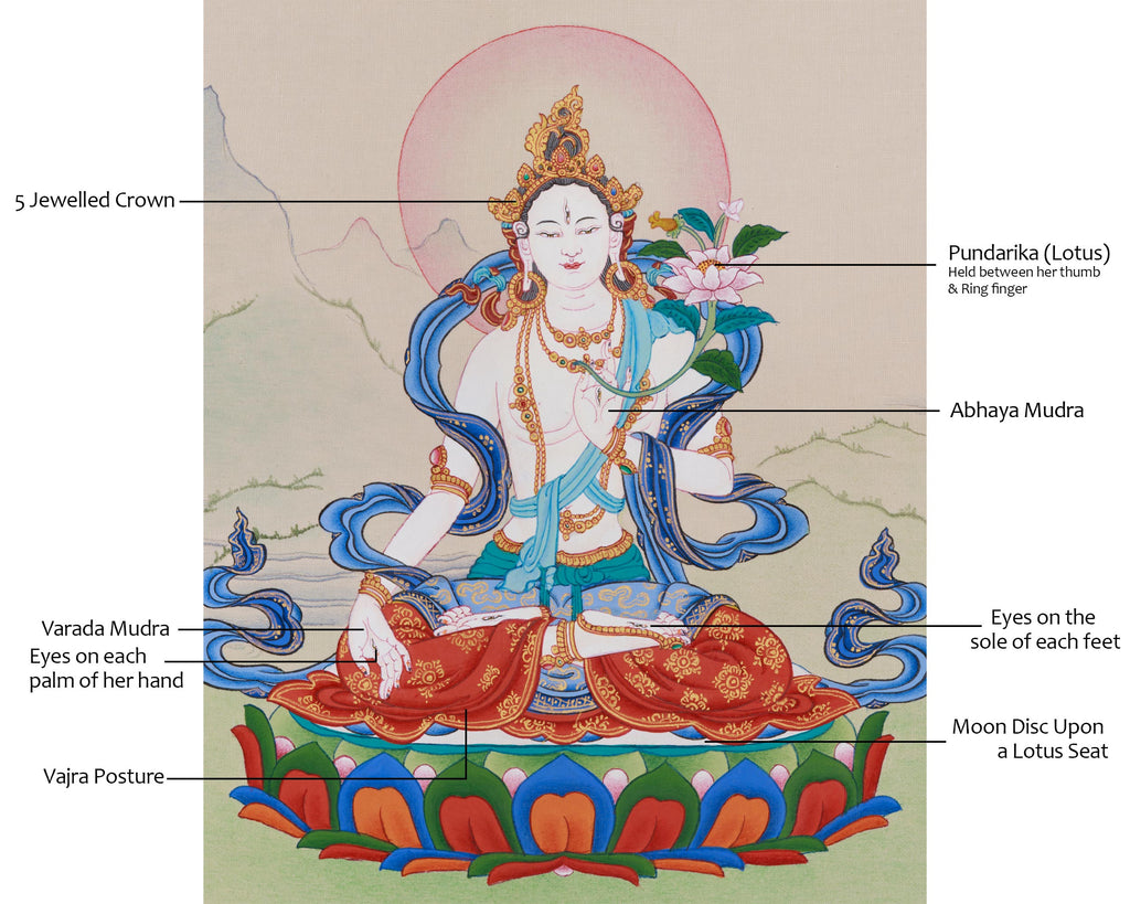 The goddess of longevity and kindness, White Tara, is a well-known figure in Tibetan Buddhism. She is believed to have arisen from Avalokiteshvara's tears, signifying his profound empathy for sentient beings' suffering. White Tara's purpose is to grant long life, healing, and protection. Sita Tara is shown sitting in this thangka, surrounded by wise and protective symbols. Her five-jeweled crown, which symbolizes purity; the Pundarika (lotus), which represents spiritual purity; and the Varada Mudra, which denotes her ability to guide and protect, are essential characteristics.