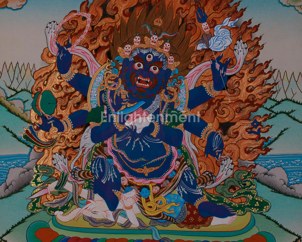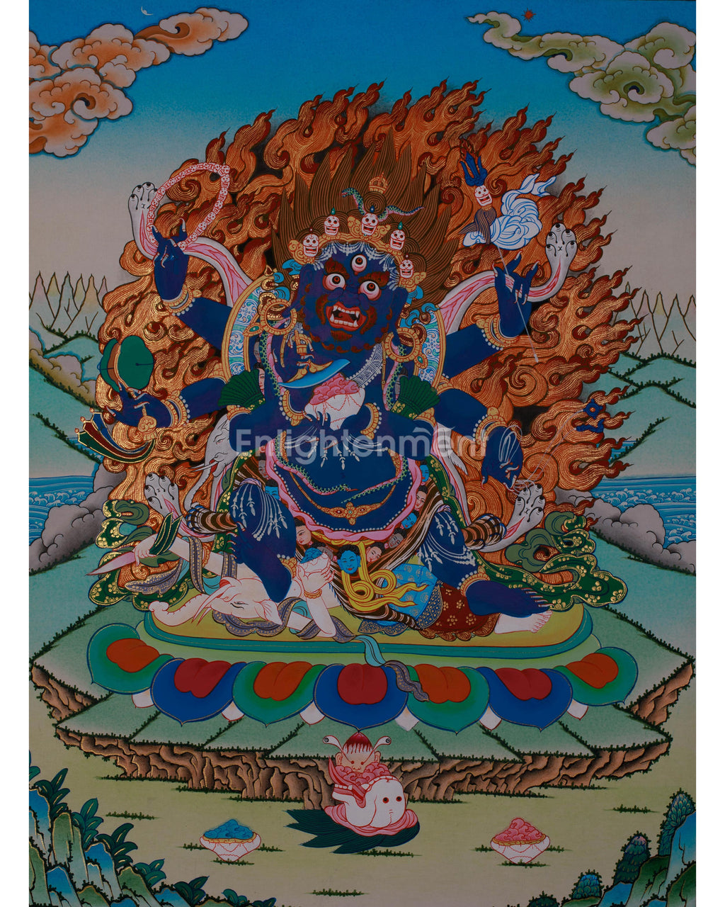 With a mighty lunge, eyes wide with rage, and roaring from his fang-studded mouth, the deity Six-Armed Mahakala radiates his wrathful strength throughout this Thangka. As the supreme defender of the Dharma, Mahakala represents the wisdom and fierceness essential for protecting the Buddha’s teachings. With six mighty arms, each wielding sacred implements such as the skull rosary, damaru drum, kartika knife, trident, lasso, and a skull cup filled with blood, Mahakala eradicates obstacles, ignorance, and spiritual defilements, making him a compelling symbol of protection and transformation. His blazing aura and fierce demeanor illustrate his role in eliminating the elements that hinder enlightenment.