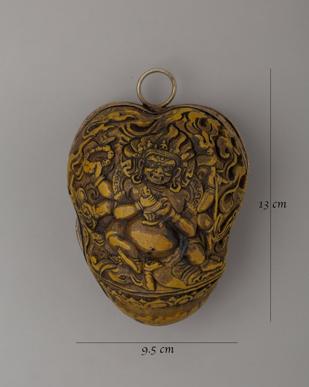 The Six-Armed Mahakala is represented in a wrathful form in the center of the locket, indicating his position as a strong guardian and obstacle remover. Each of his six arms reflects his ability to protect the six realms of existence, while his impassioned expression symbolizes the transformational force of wisdom and compassion. The Kapala-shaped locket, inspired by ritual skull cups, emphasizes the transience of life and the annihilation of harmful energies. The backside features a majestic dragon intricately decorated with flower motifs, representing strength, knowledge, and protection. This Tibetan Buddhist amulet is a very effective spiritual talisman for protection, meditation, and personal empowerment.