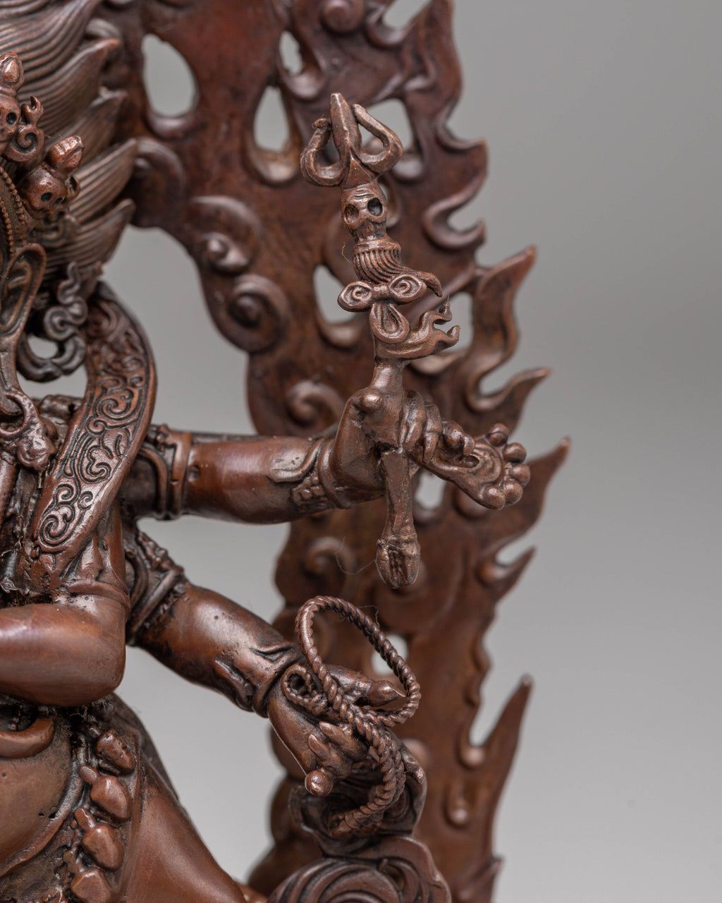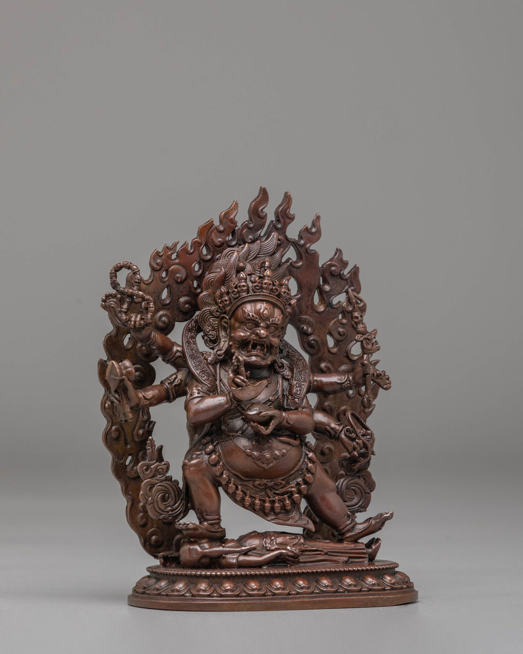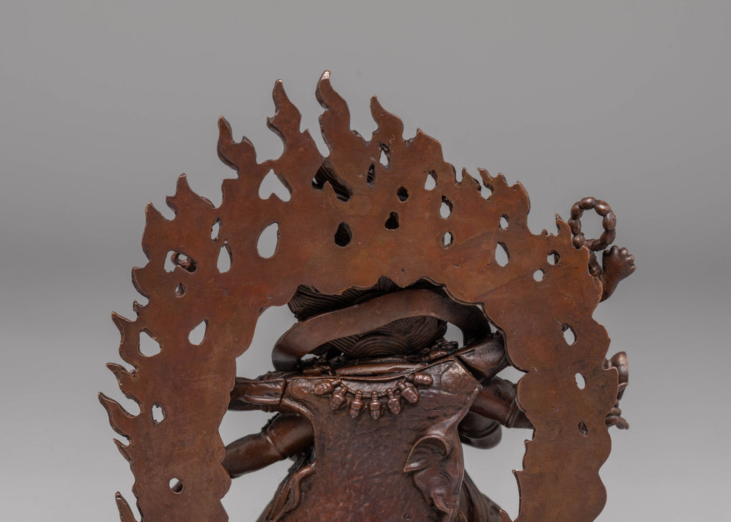 The Six-Armed Mahakala Statue is an awe-inspiring representation of Mahakala, one of the most revered deities in Tibetan Buddhism. Known as the protector of the Dharma, Mahakala is often depicted as a fierce deity who wards off negative energies and protects practitioners. This statue, crafted from oxidized copper, depicts Mahakala in a dynamic, powerful stance, with six arms holding various symbolic objects. His fearsome appearance, complete with flames surrounding his body, represents his ability to destroy obstacles and bring spiritual protection to his followers.