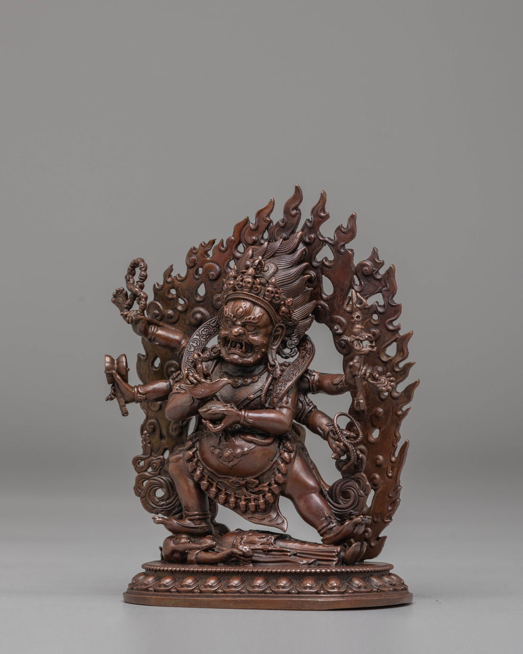 The intricate details of this statue showcase the powerful energy of Mahakala, with his multiple arms symbolizing his ability to act in different ways to protect the Dharma and devotees. His fierce expression, surrounded by swirling flames, highlights his nature as a defender of truth and a destroyer of ignorance and evil. The oxidized copper finish enhances the depth and texture of the statue, giving it a timeless, sacred look that is perfect for a home altar, meditation space, or spiritual collection. The statue also features Mahakala’s fierce posture, showing his dominance and strength in protecting the teachings of Buddhism.
