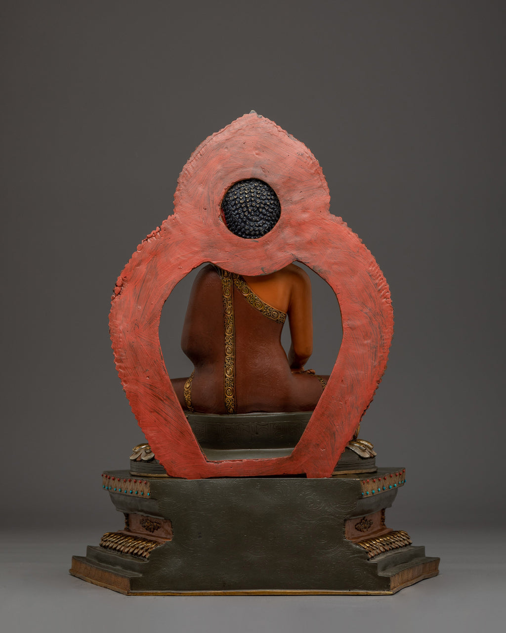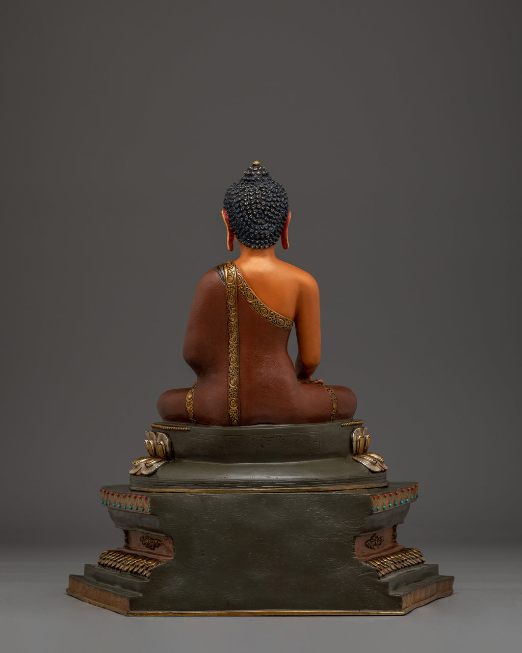 Shakyamuni Buddha is depicted sitting in the lotus pose (padmasana), indicating his steady concentration and mastery over the distractions of the material world. His right hand stretched toward the earth in bhumisparsha mudra, representing his moment of enlightenment, inviting the earth to witness his waking. The left hand, lying gently in his lap in dhyana mudra holding an alms bowl, depicts the profound state of meditation and mindfulness that leads to insight and clarity.