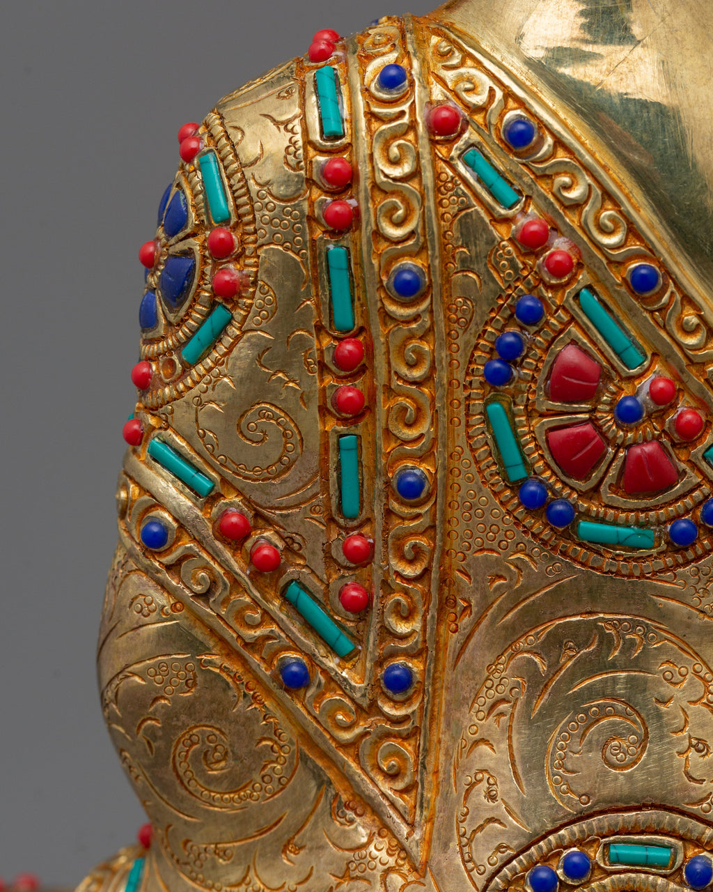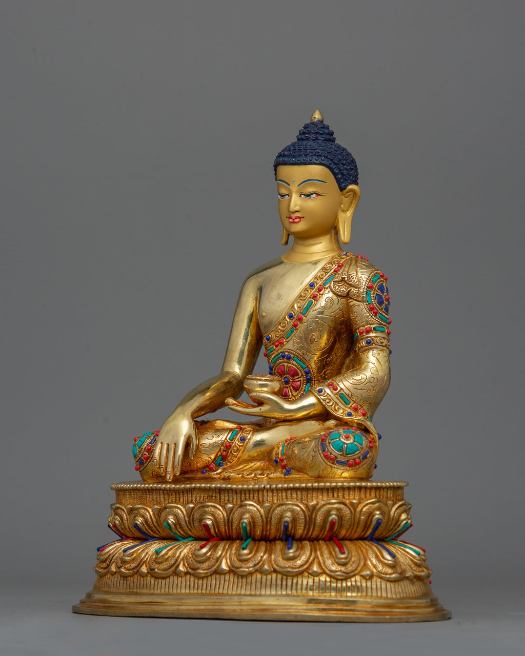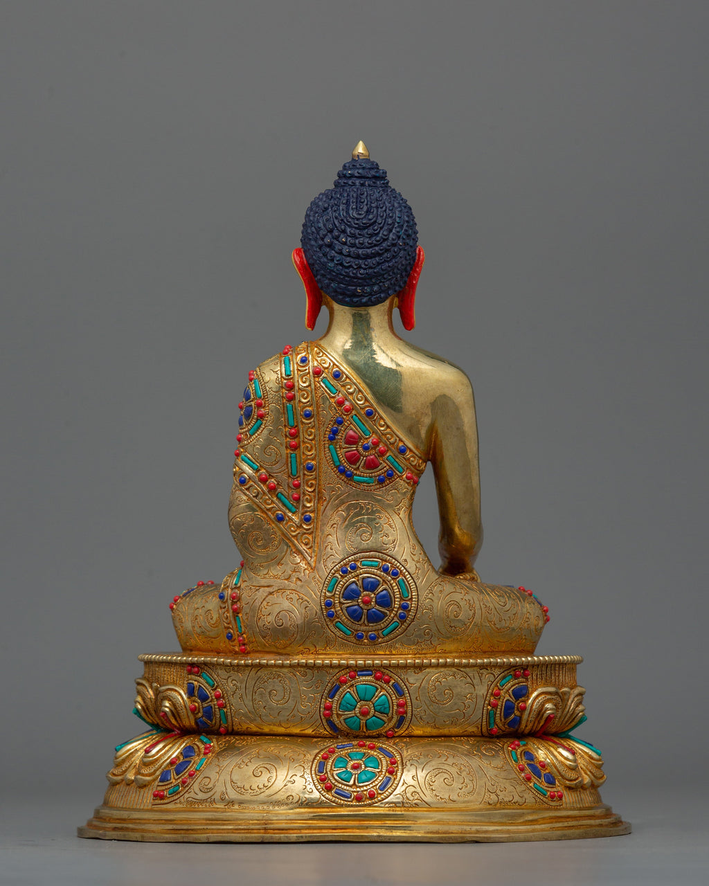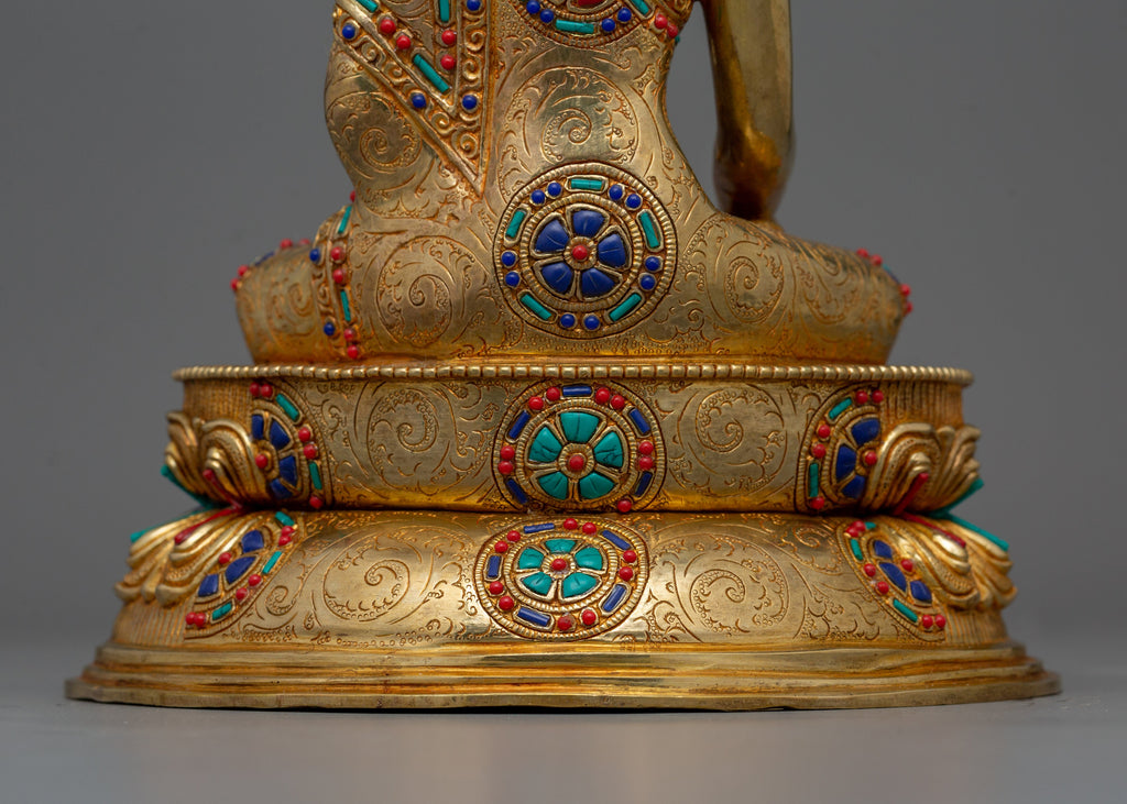 Spiritual Decor Shakyamuni Buddha Statue is seated on a lotus throne embellished with 24K gold gilding, which ensures its longevity as a religious item while also improving its visual appeal. Tibetan workmanship is displayed in the artistic detailing of gold and acrylic paintings, giving the work profound symbolic meaning and spiritual importance. Hand-carved gemstones are also carefully positioned throughout, offering a special touch that emphasizes the outstanding craftsmanship and devotion built into this piece of spiritual decor.