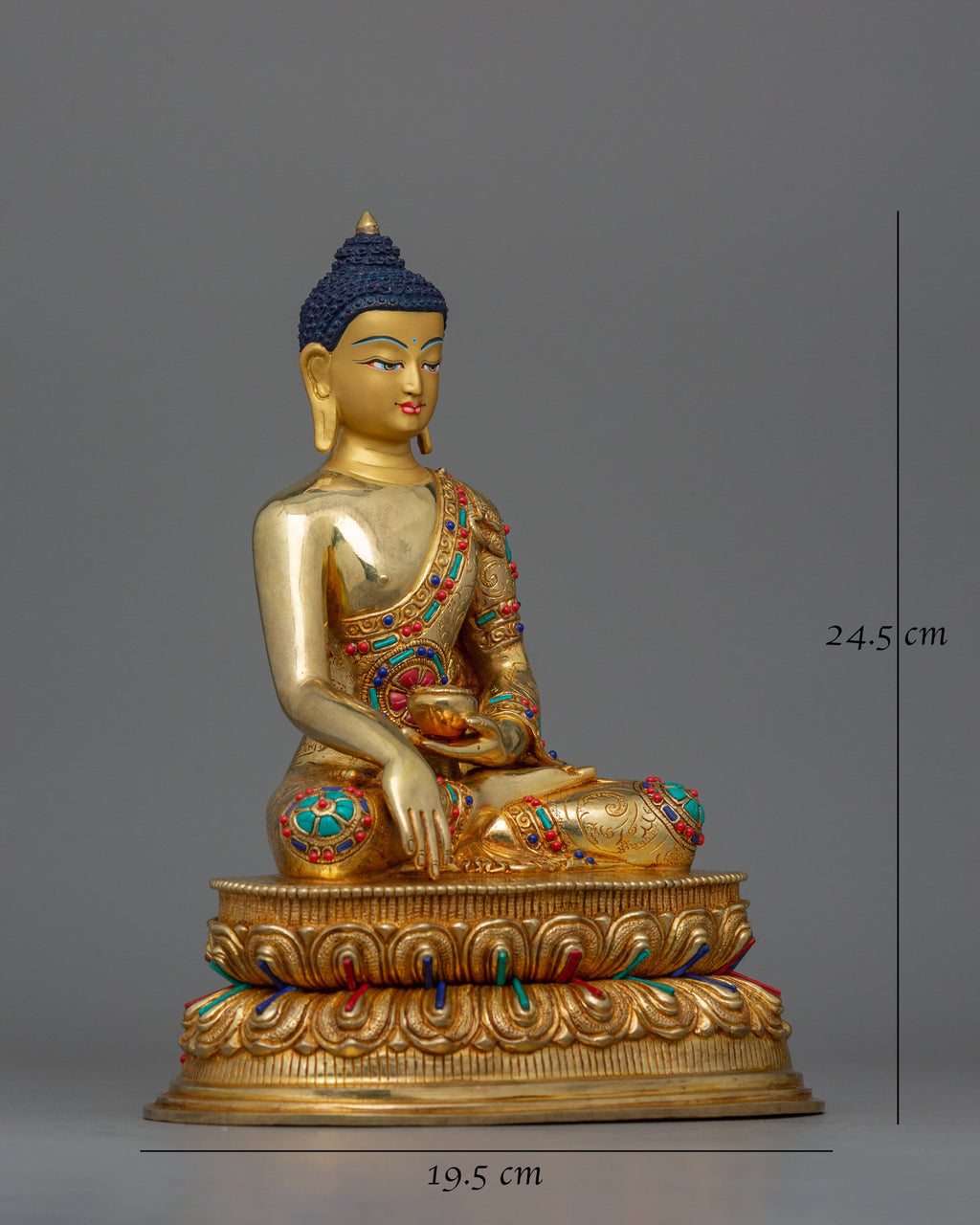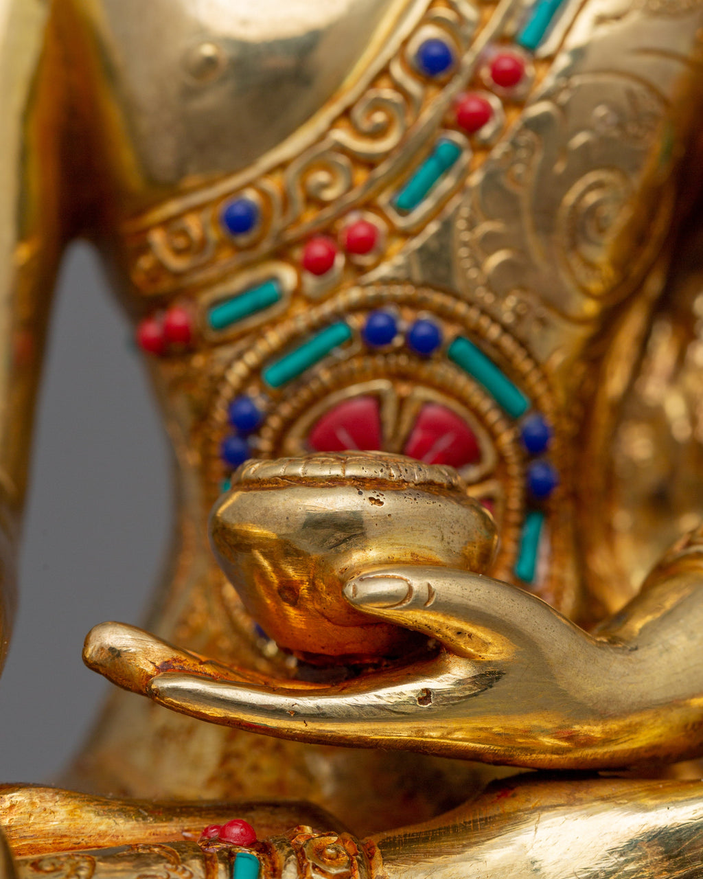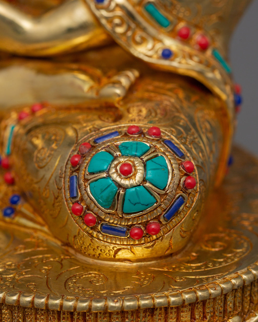 Spiritual Decor Shakyamuni Buddha Statue is seated on a lotus throne embellished with 24K gold gilding, which ensures its longevity as a religious item while also improving its visual appeal. Tibetan workmanship is displayed in the artistic detailing of gold and acrylic paintings, giving the work profound symbolic meaning and spiritual importance. Hand-carved gemstones are also carefully positioned throughout, offering a special touch that emphasizes the outstanding craftsmanship and devotion built into this piece of spiritual decor.