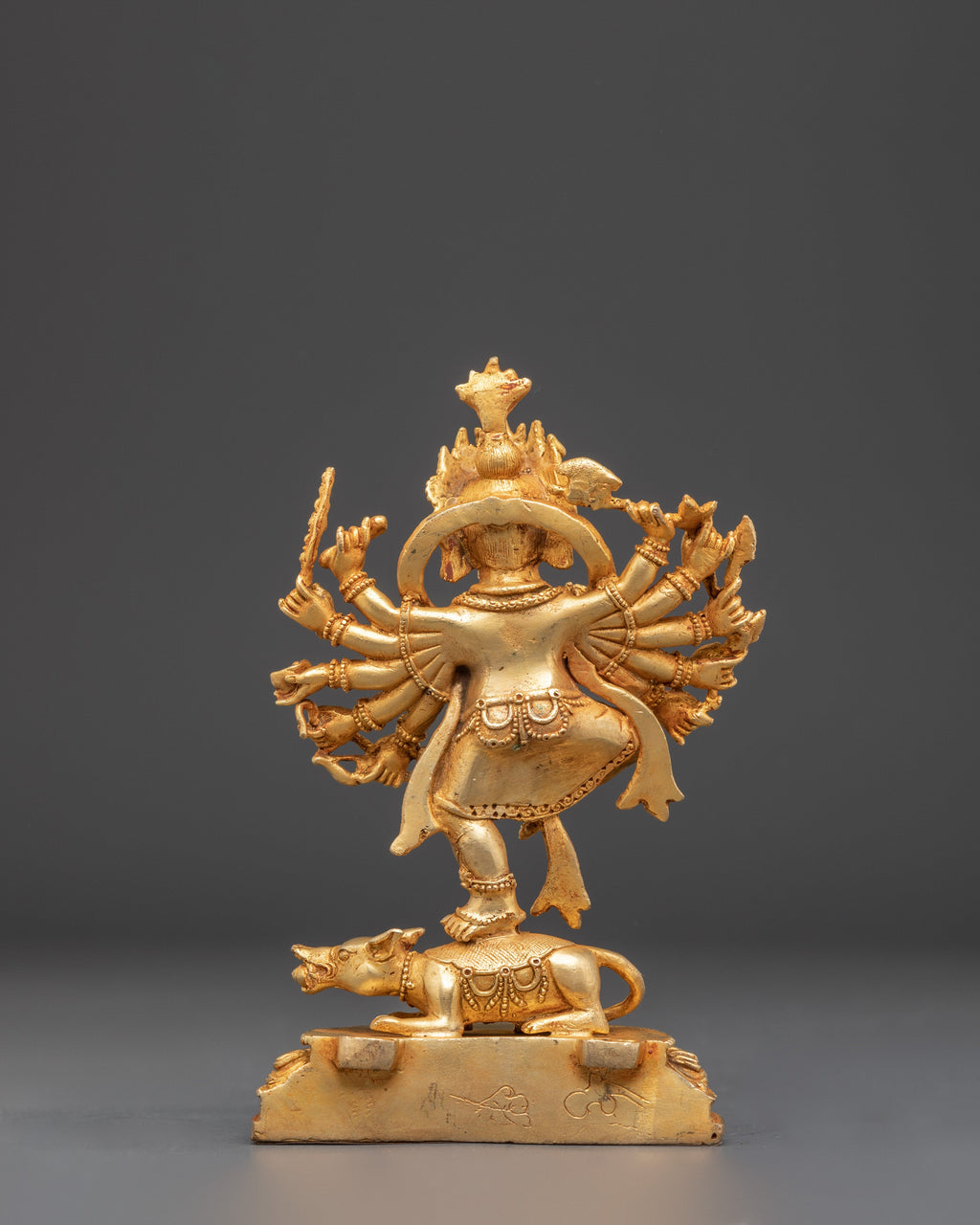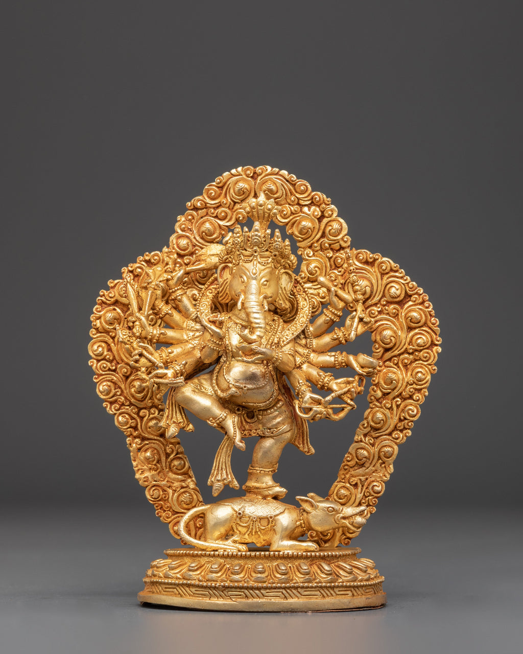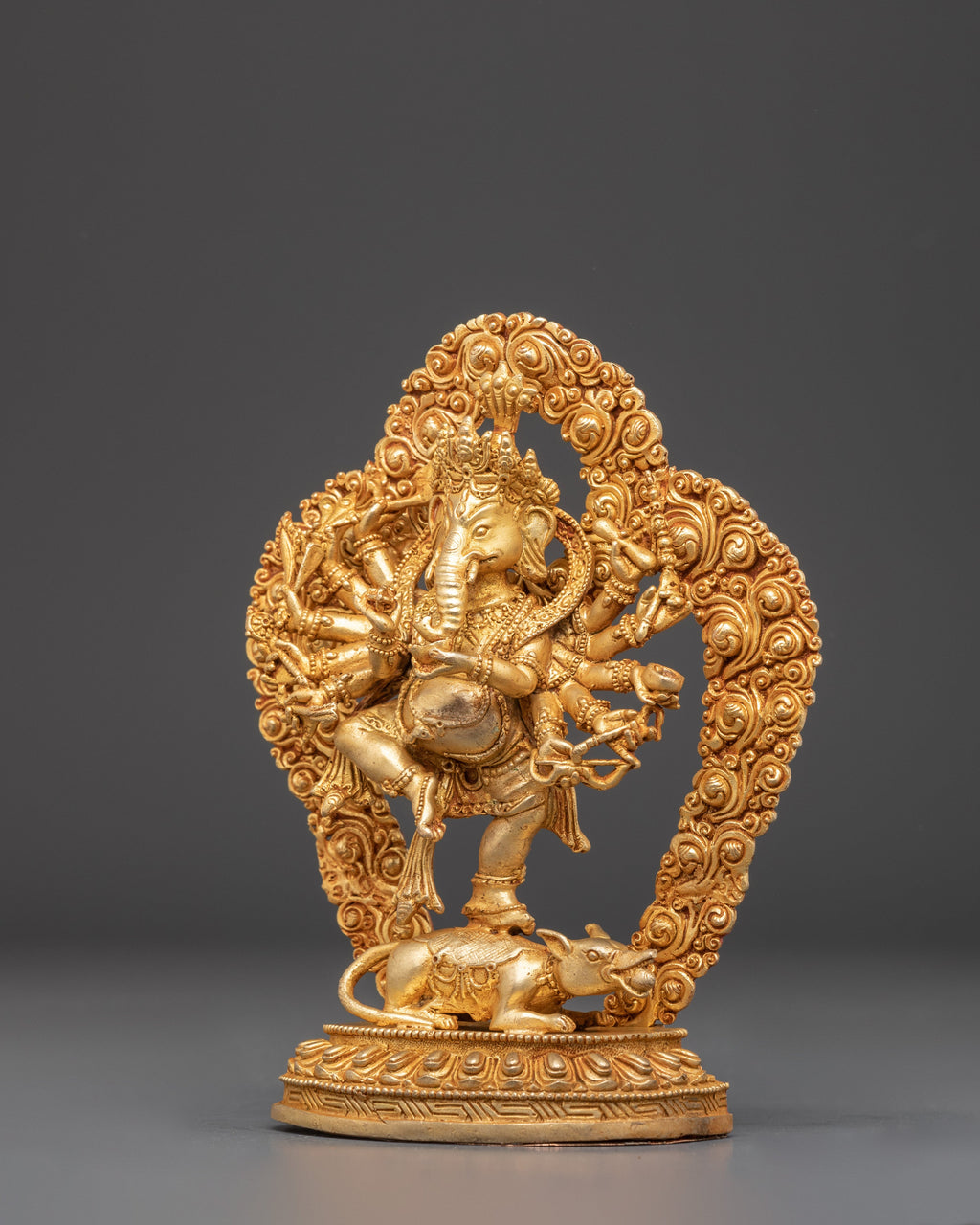 The statue features intricate detailing, highlighting Ganesha’s serene expression, sacred ornaments, and symbolic posture. The gold plating enhances the spiritual presence of the figure, while the copper body ensures authenticity. In Hindu tradition, Lord Ganesha is worshipped as the remover of obstacles and the patron of intellect and success, making this statue both a powerful spiritual artifact and a striking piece of art.