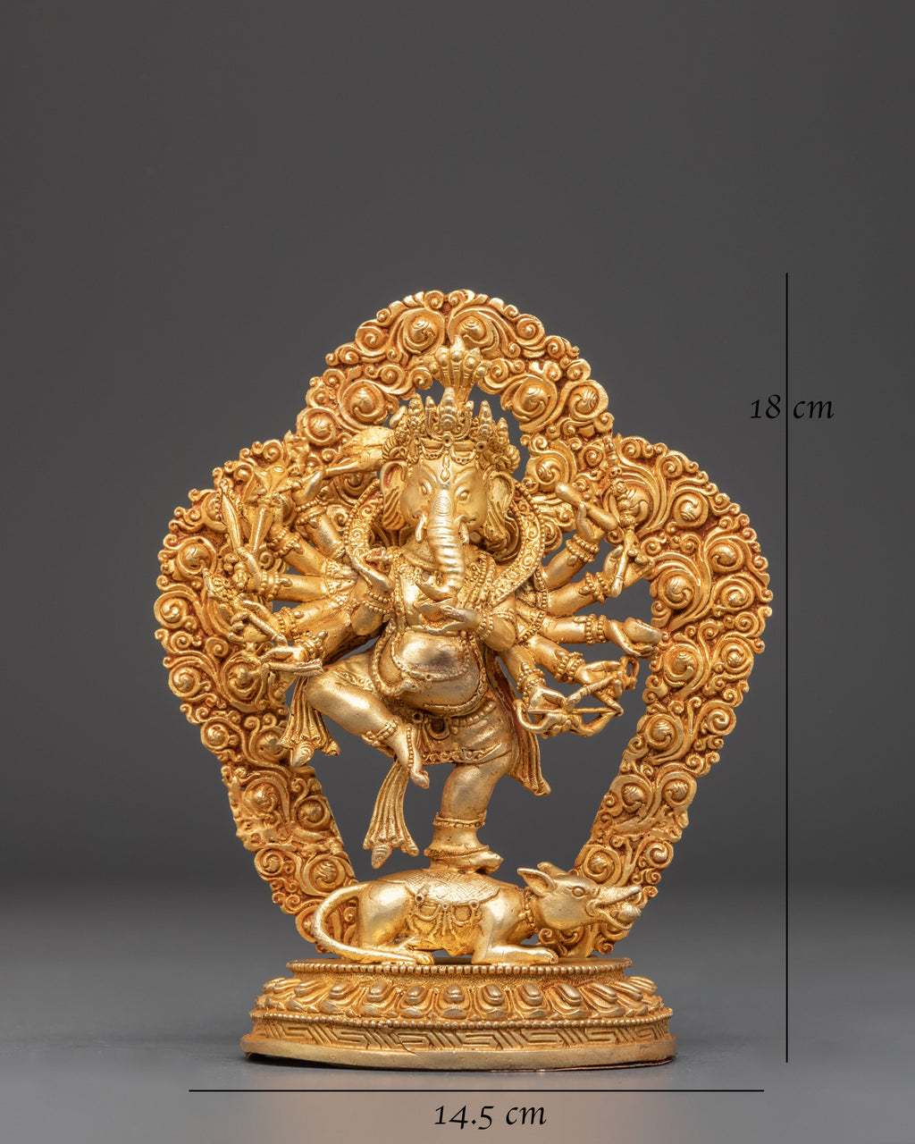 This Spiritual Ganesh Figure is a beautifully handcrafted statue made from copper with a radiant gold-plated finish. Measuring 18cm in height and 14.5cm in width, and weighing 0.82kg, this sacred idol of Lord Ganesha is an auspicious symbol of wisdom, prosperity, and new beginnings. Perfect for home altars, puja rituals, meditation spaces, or as a meaningful gift, it brings positive energy and divine blessings into any environment.