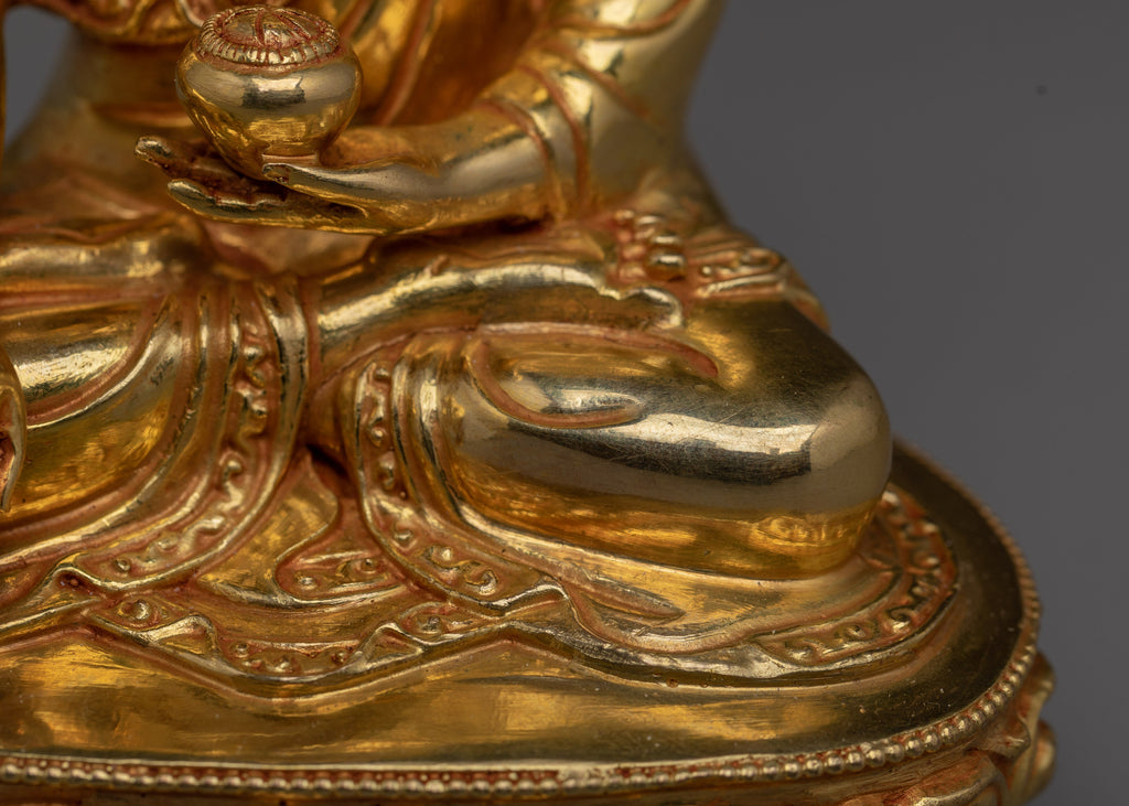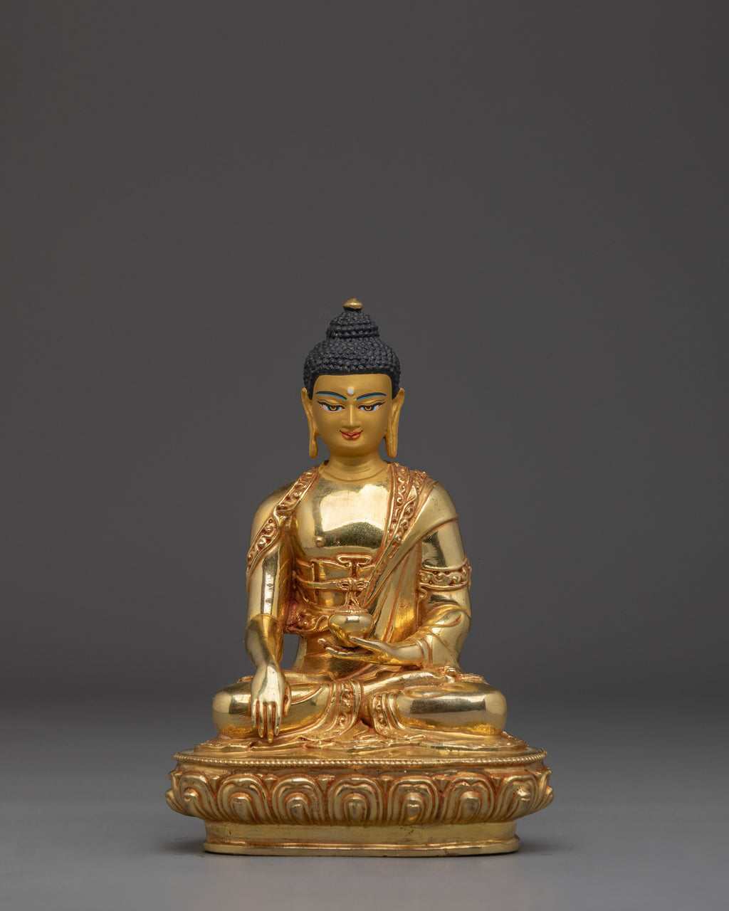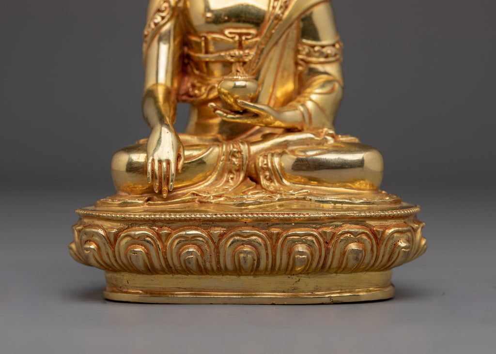 Shakyamuni Buddha is shown in a serene, meditative pose with half-closed eyes, reflecting deep inner calm and enlightened awareness. His right hand performs the bhūmisparśa mudrā (earth-touching gesture), marking the moment he summoned the Earth to bear witness to his awakening. In his left hand, he holds an alms bowl, representing simplicity and the renounced life of a monk. His head features the uṣṇīṣa, a symbol of supreme wisdom, and his hair is styled in distinctive snail-like curls, inspired by the story of snails shielding him from the sun during long meditation sessions. Seated in the vajra posture on a lotus with a moon disc base, he embodies stability, purity, and focused concentration. This elegant iconography pays tribute to the historical Buddha’s calm, dignified, and significant presence.
