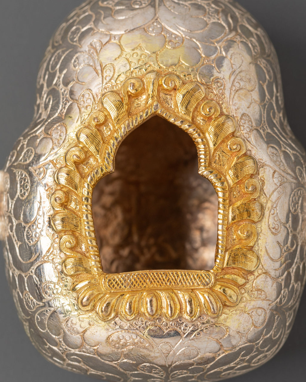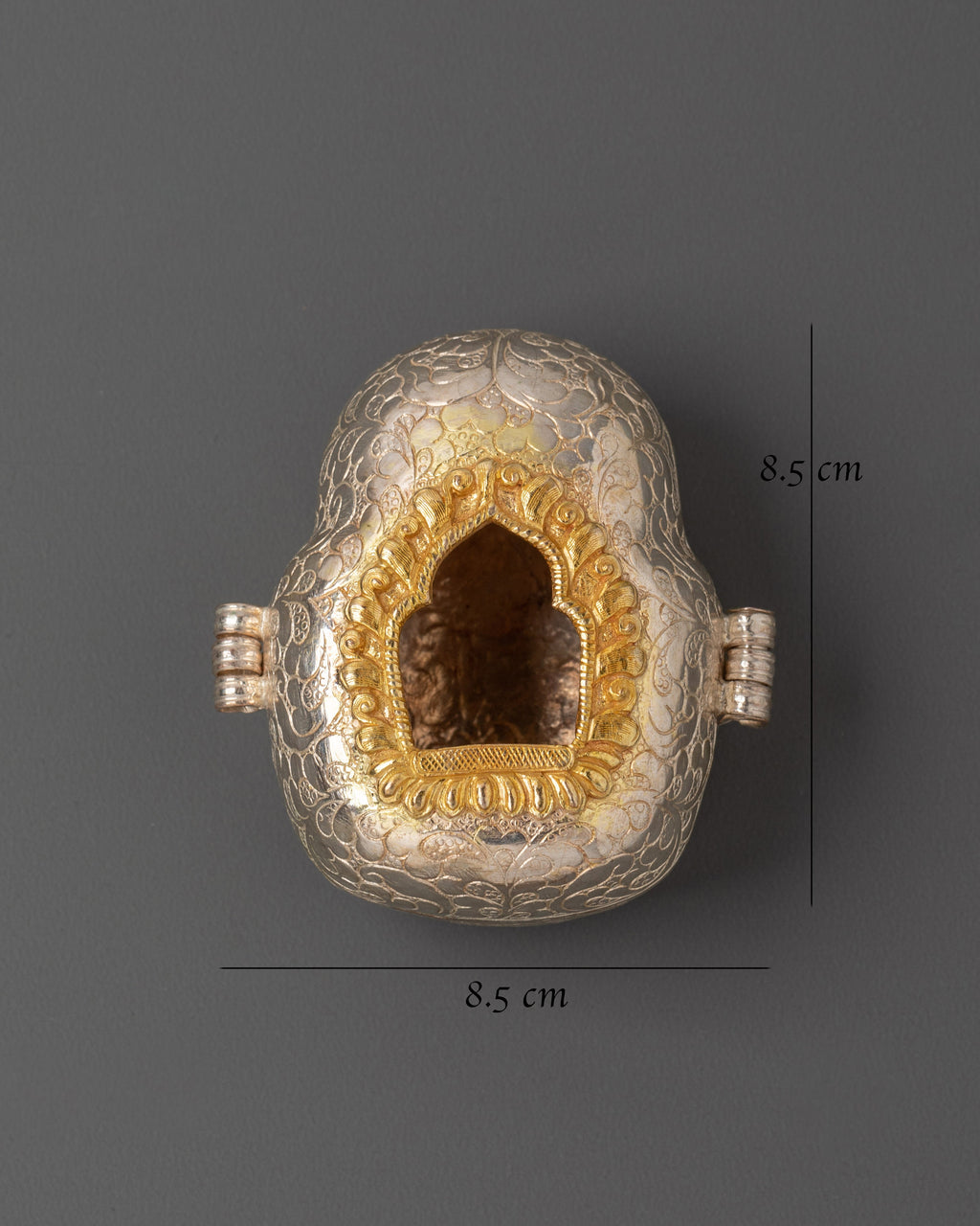 Ideal for your altar or meditation space, this Spiritual Ghau Box combines functionality with striking decorative appeal. Perfect for storing sacred items, prayer beads, or offerings, it helps cultivate a sense of tranquility and spiritual focus in your practice. The expert craftsmanship, highlighted by the harmonious blend of gold and silver gilding on copper, elevates its aesthetic and symbolic value. This exquisite box not only enhances the beauty of your sacred space but also serves as a meaningful vessel that supports mindfulness, devotion, and spiritual connection. Its timeless design makes it a treasured addition to any spiritual collection.