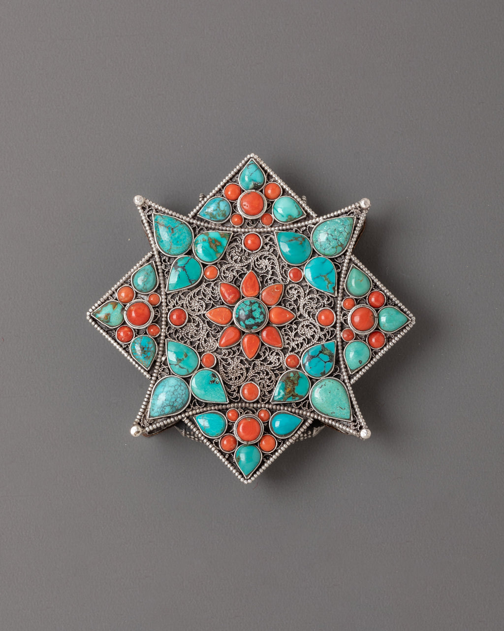 In Tibetan Buddhist symbolism, flowers symbolize the blossoming of enlightenment and the unfolding of spiritual consciousness, with each petal representing virtues cultivated along the path to awakening. This Buddhist amulet jewelry serves as a sacred container for blessed objects, mantras, or deity images, transforming personal devotion into wearable spiritual protection. The eight-pointed star configuration reflects the Noble Eightfold Path, while the radiating flower design symbolizes the spreading of compassion and wisdom in all directions. The combination of turquoise and coral creates a powerful energy balance, with turquoise representing heavenly protection and healing, while coral embodies life force and earthly vitality.