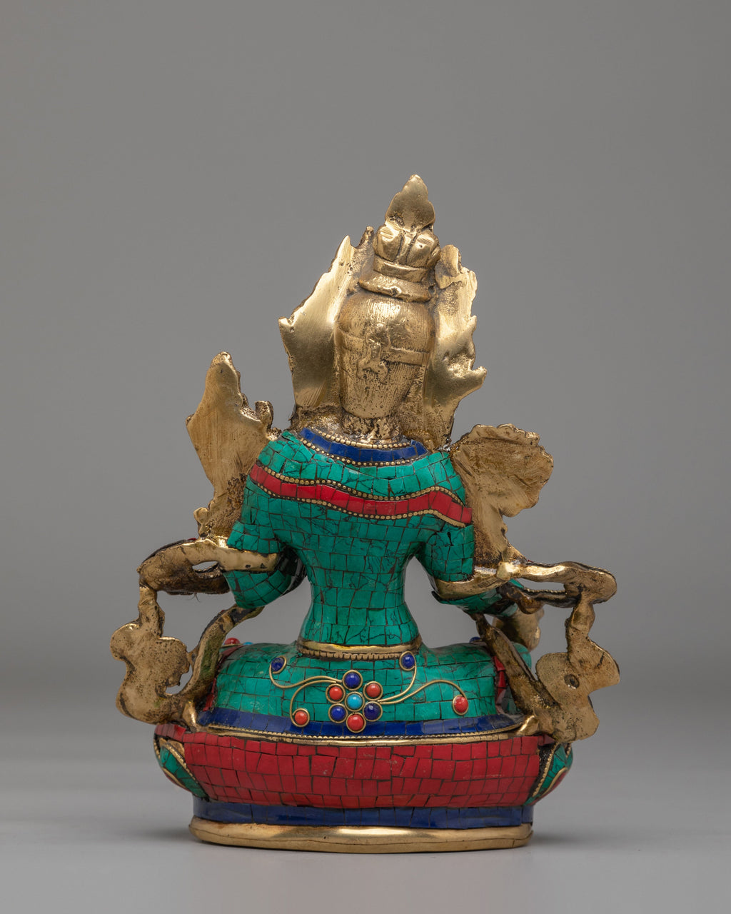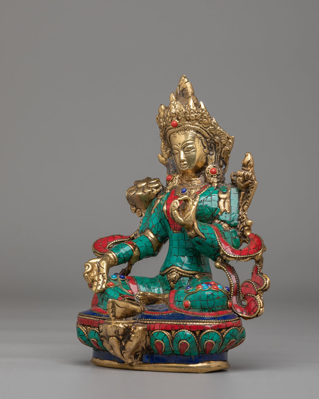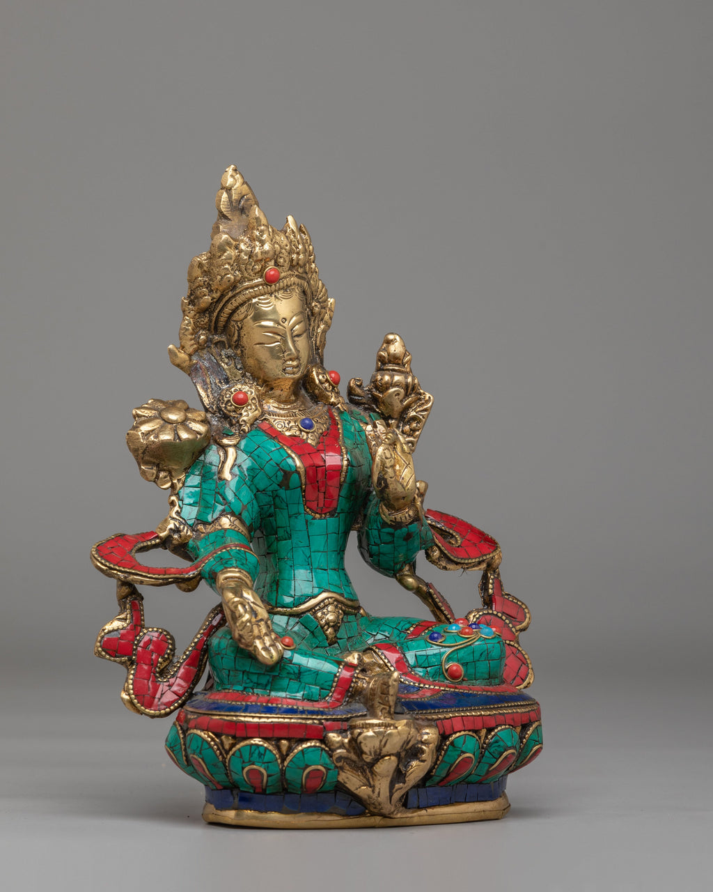 This Spiritual Green Tara Buddhist Deity Statue is a beautifully handcrafted Himalayan artwork, created from brass and richly adorned with turquoise, lapis lazuli, and coral inlays. The figure of Green Tara is depicted seated in a graceful posture, with one leg extended, symbolizing her readiness to act swiftly to help those in need. The intricate inlay work forms vibrant patterns across her robes, while her serene facial expression reflects compassion, calmness, and divine presence.