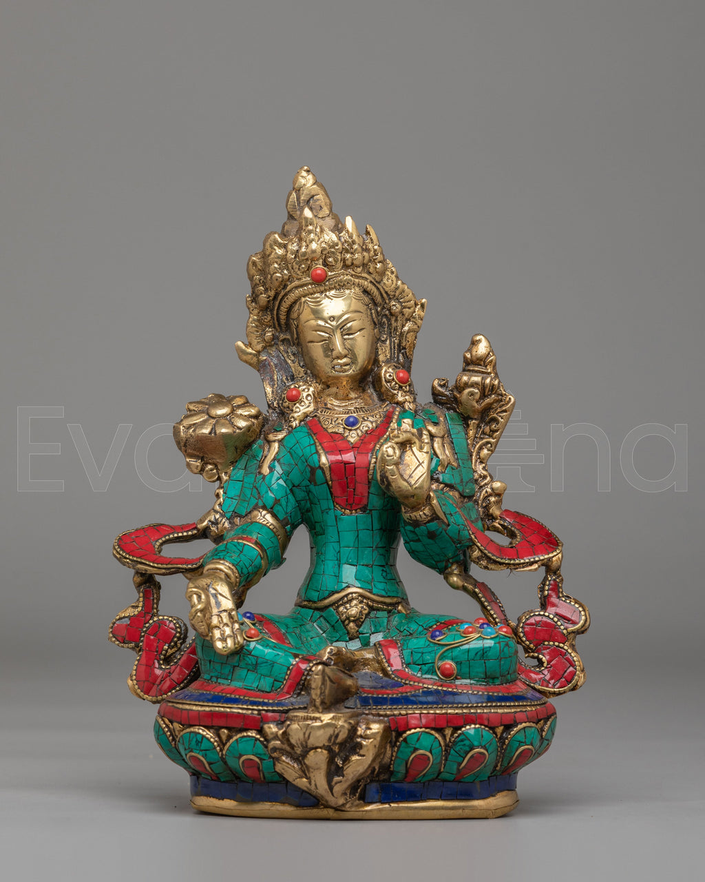 Green Tara is one of the most beloved deities in Tibetan Buddhism, known as the Goddess of Compassion and Swift Protection. Her right hand is extended in a gesture of generosity and blessing, while her left hand holds a lotus, representing purity and spiritual awakening. The detailed craftsmanship highlights her crown, ornaments, and flowing attire, each element symbolizing wisdom, protection, and enlightened activity. The combination of brass with colorful stone inlays enhances both the spiritual and artistic value of the statue.
