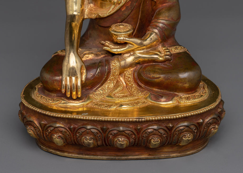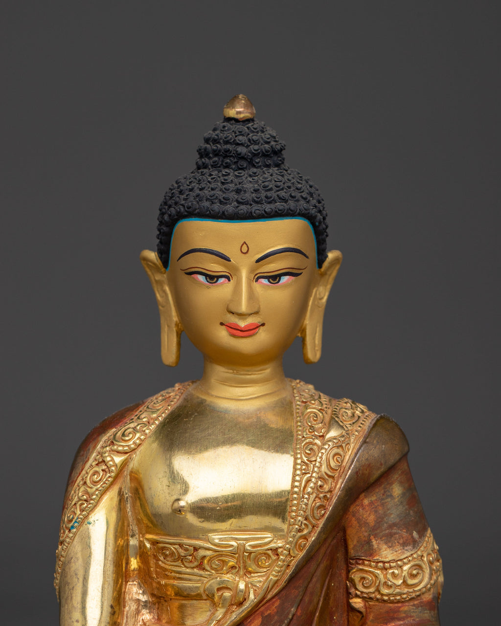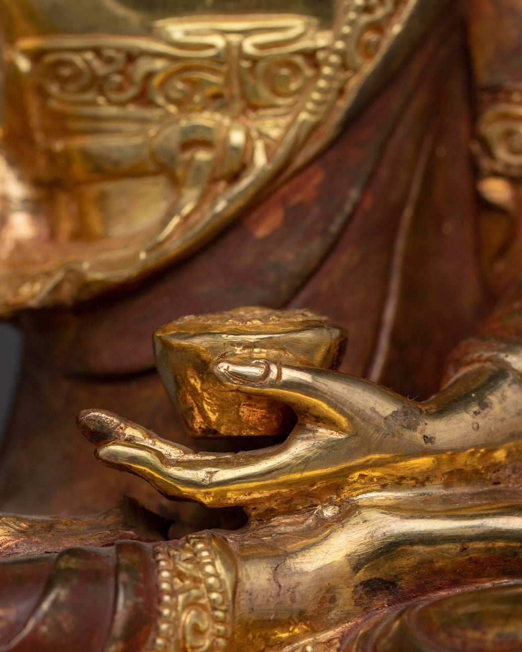 Spiritual guide Shakyamuni Buddha measures 8.5 inches (21.5 cm) in height and 5.9 inches (15 cm) at the base. It weighs 1.90 kilograms and is crafted with 24K gold gilding, gold and acrylic paintings, and an oxidized copper body. This sculpture is handcrafted by expert Nepalese artisans, elegantly symbolizes Himalayan Buddhism's sacred traditions, making it an appropriate addition to altars, meditation places, or sacred collections.