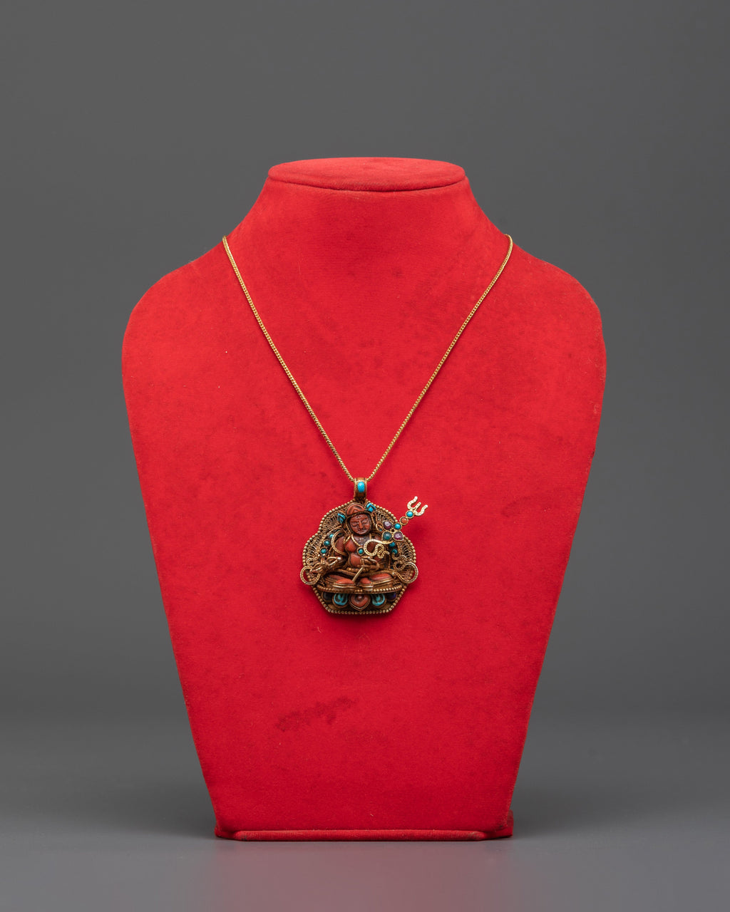 The Tibetan Buddhist jewelry piece showcases extraordinary craftsmanship, featuring detailed relief work that depicts Guru Rinpoche's serene expression and elaborate robes. Traditional iconography features the lotus throne, representing purity and spiritual rebirth. At the same time, coral and turquoise stones hold profound spiritual significance: coral symbolizes life force energy, and turquoise signifies protection and healing. The gold plating adds divine luminescence, making it both a powerful spiritual tool and exquisite wearable art.