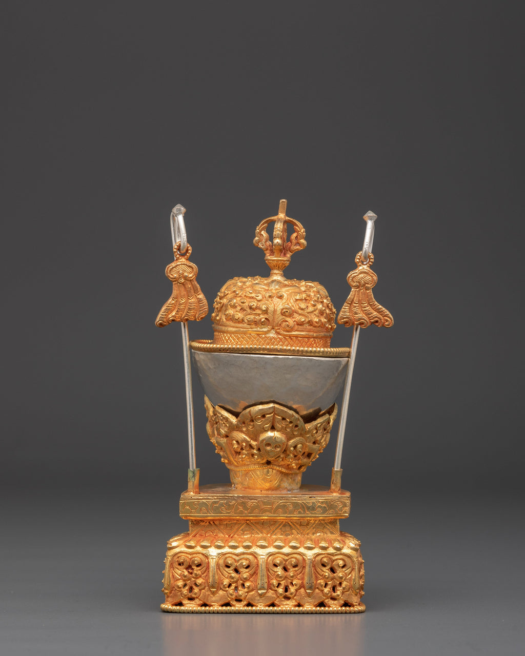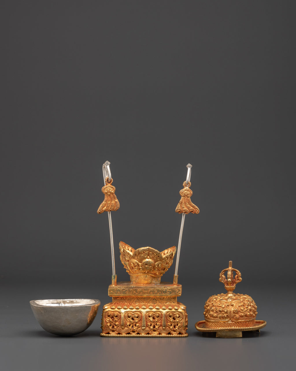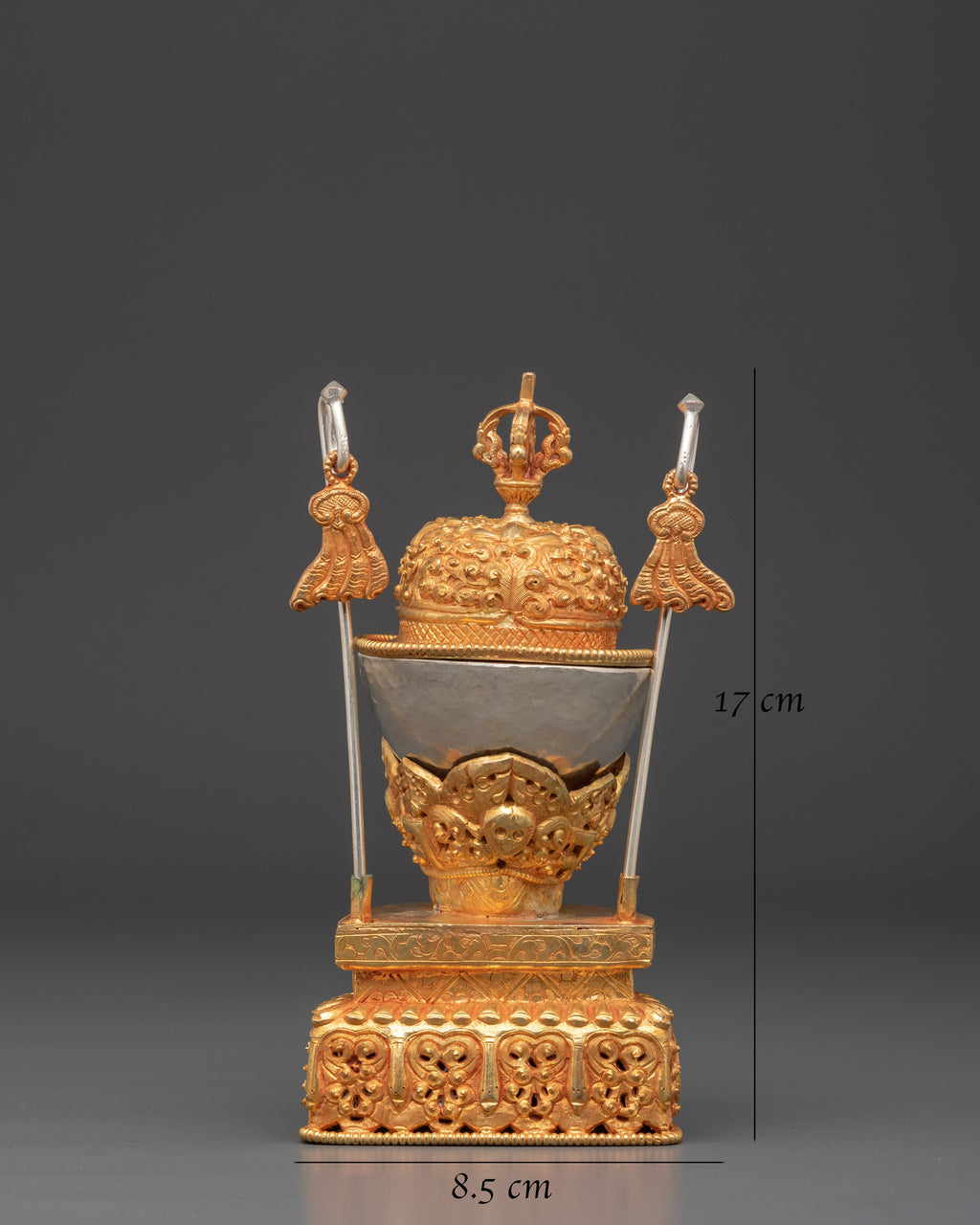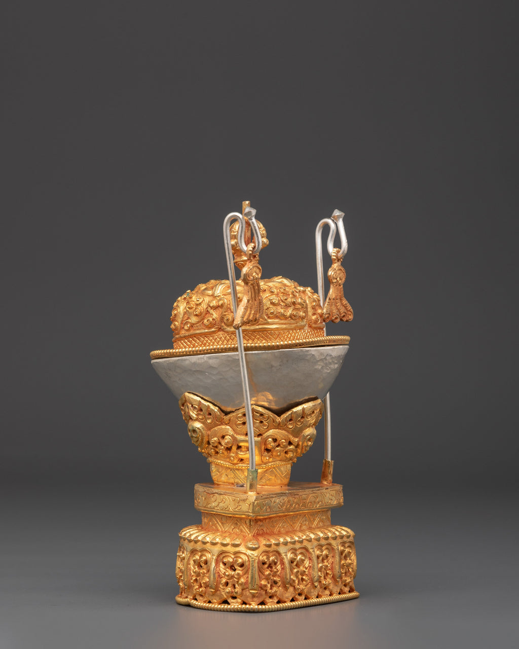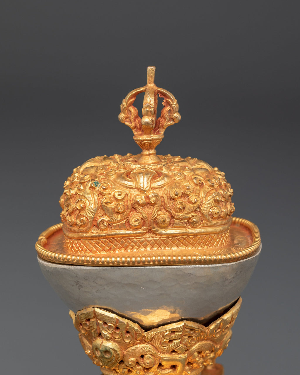 The Kapala set holds the nectar used in higher esoteric rituals. It offers liberation to gods and deities, ensuring their devotion. The offerings are said to be transformed into the Wisdom Nectar, a liquid form of the deity's Enlightened Mind.