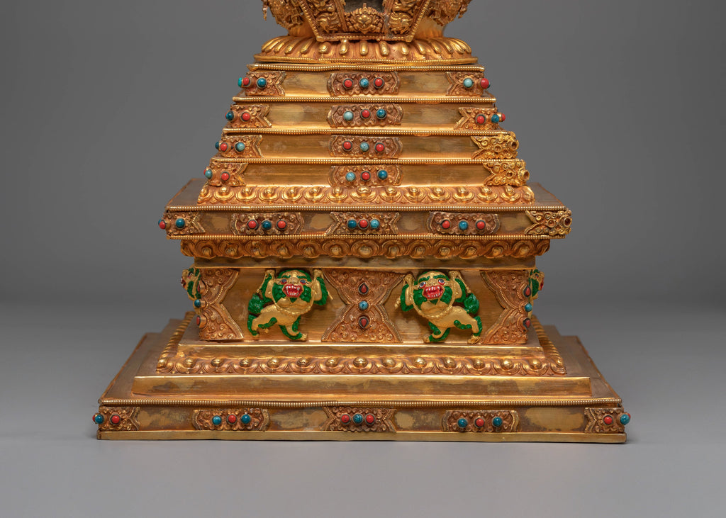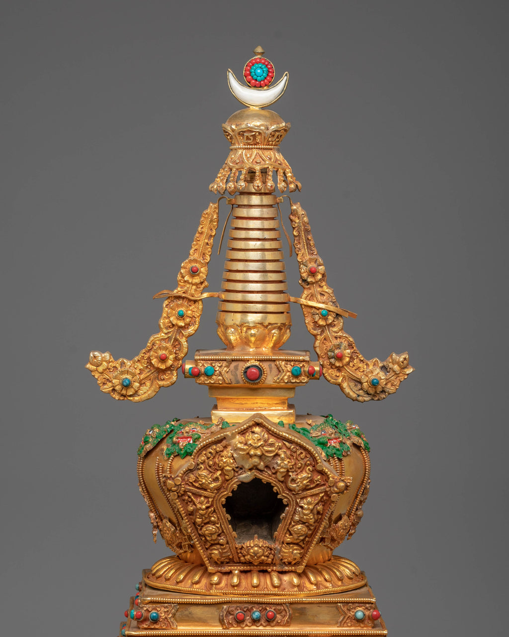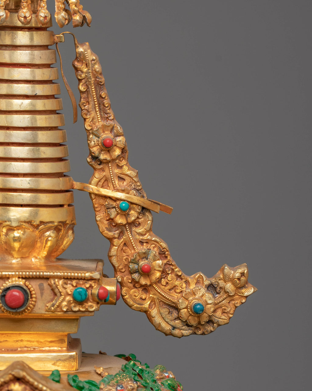 The copper body provides a solid foundation for the stupa, which is then adorned with electro-gold plating for a radiant, divine finish. The acrylic colors add a lively contrast to the gold, creating an elegant and eye-catching effect. The turquoise and coral stones, carefully placed around the stupa, enhance its spiritual power. Turquoise is known for promoting wisdom, balance, and healing, while coral is believed to offer protection and positive energy. The intricate motifs and the spiritual symbolism woven throughout the design reflect the sacred teachings of Tibetan Buddhism, encouraging practitioners to meditate on the nature of enlightenment.