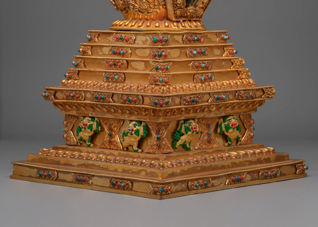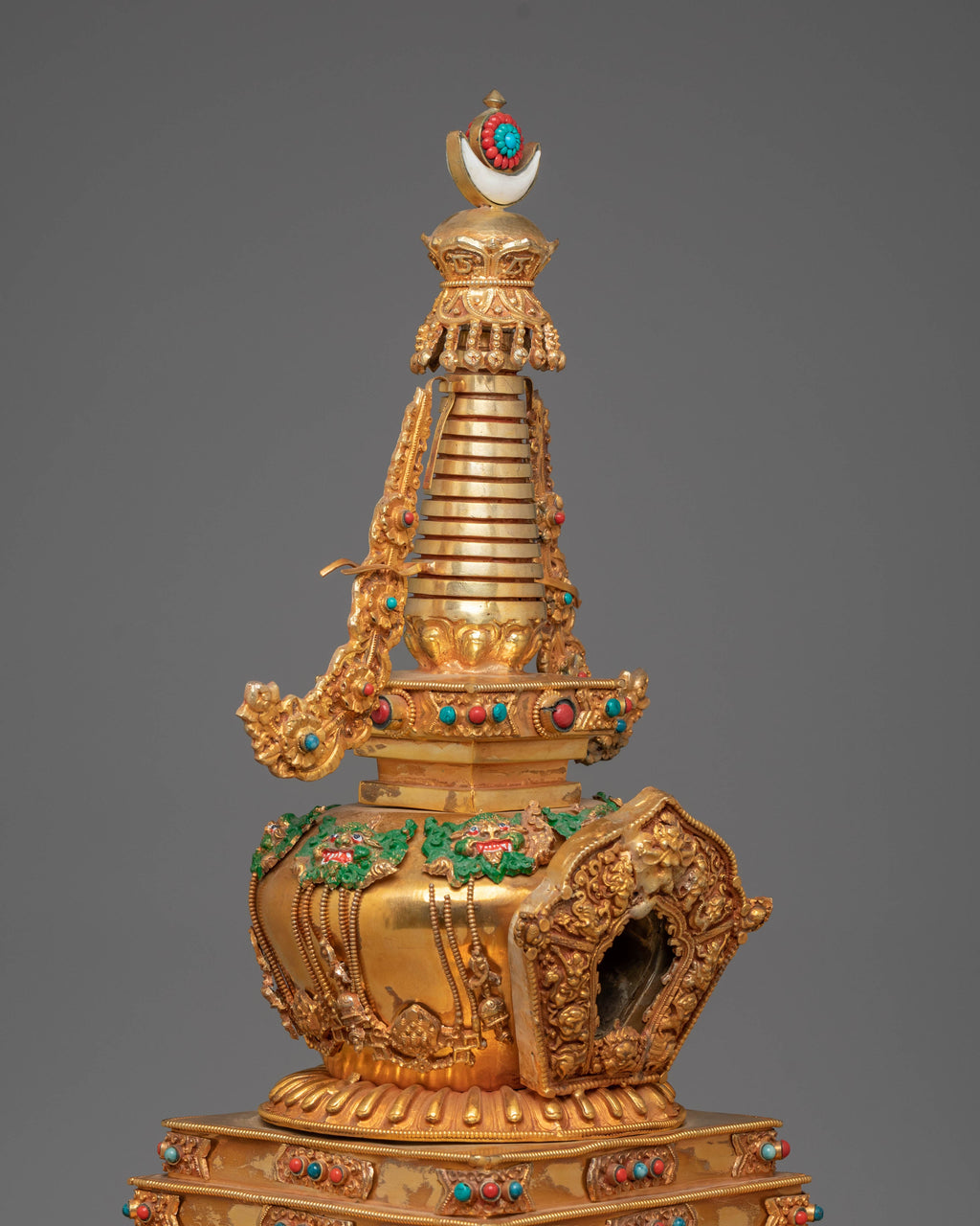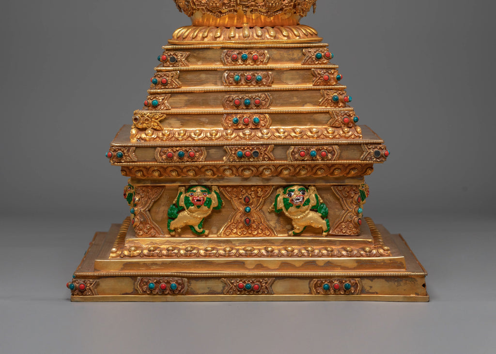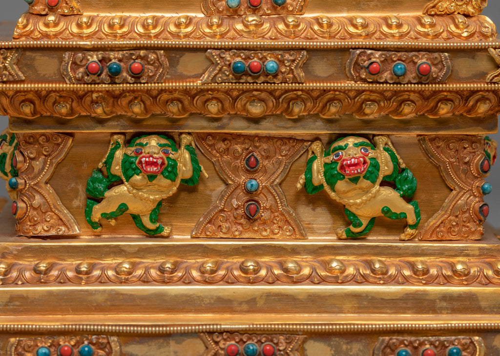 The copper body provides a solid foundation for the stupa, which is then adorned with electro-gold plating for a radiant, divine finish. The acrylic colors add a lively contrast to the gold, creating an elegant and eye-catching effect. The turquoise and coral stones, carefully placed around the stupa, enhance its spiritual power. Turquoise is known for promoting wisdom, balance, and healing, while coral is believed to offer protection and positive energy. The intricate motifs and the spiritual symbolism woven throughout the design reflect the sacred teachings of Tibetan Buddhism, encouraging practitioners to meditate on the nature of enlightenment.