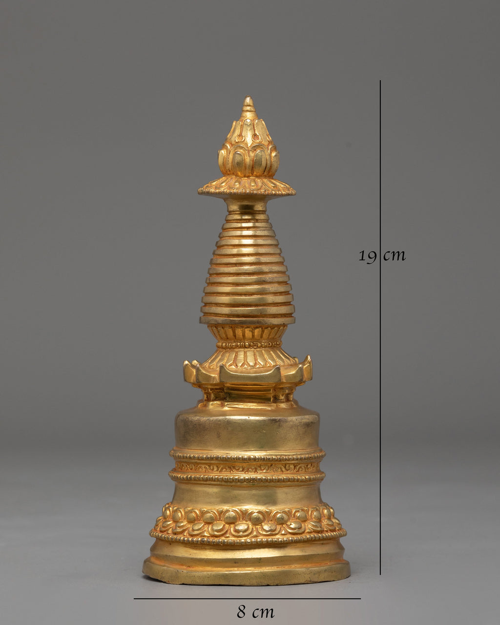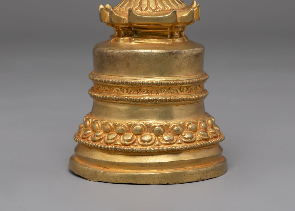 The Spiritual Handmade Stupa, measuring 19cm in height and 8cm in width, and weighing 0.67kg, is exquisitely handcrafted from a copper body and beautifully gold-plated to radiate divine brilliance. This sacred stupa is a profound representation of the Buddha's enlightened mind, embodying peace, wisdom, and spiritual awakening. Its detailed lotus base and ascending dome symbolize the cosmic harmony of the universe, while the golden finish evokes purity and enlightenment. This meticulously designed piece reflects the artistry and devotion of traditional Tibetan craftsmanship.