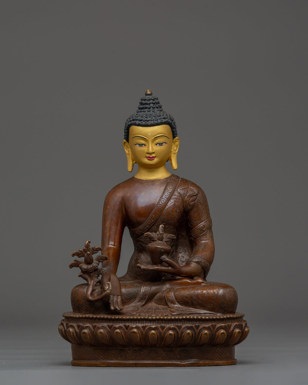 The Medicine Buddha is traditionally depicted seated in the vajrasana, or diamond posture, on a moon disc lotus base, which signifies stability, purity, and spiritual elevation. In his left hand, he gently holds an alms bowl believed to contain a healing nectar that has the power to cure all suffering and disease. This symbolizes his profound ability to heal not only physical illnesses but also the spiritual afflictions that hinder enlightenment. His right hand carries a myrobalan plant, a revered medicinal herb in Buddhist and Ayurvedic traditions, representing his role as the ultimate healer who restores balance and health to body and mind. The overall imagery of the Medicine Buddha inspires faith in healing and encourages practitioners to cultivate compassion and the aspiration to bring relief to all sentient beings.