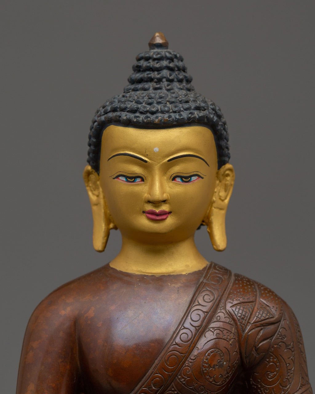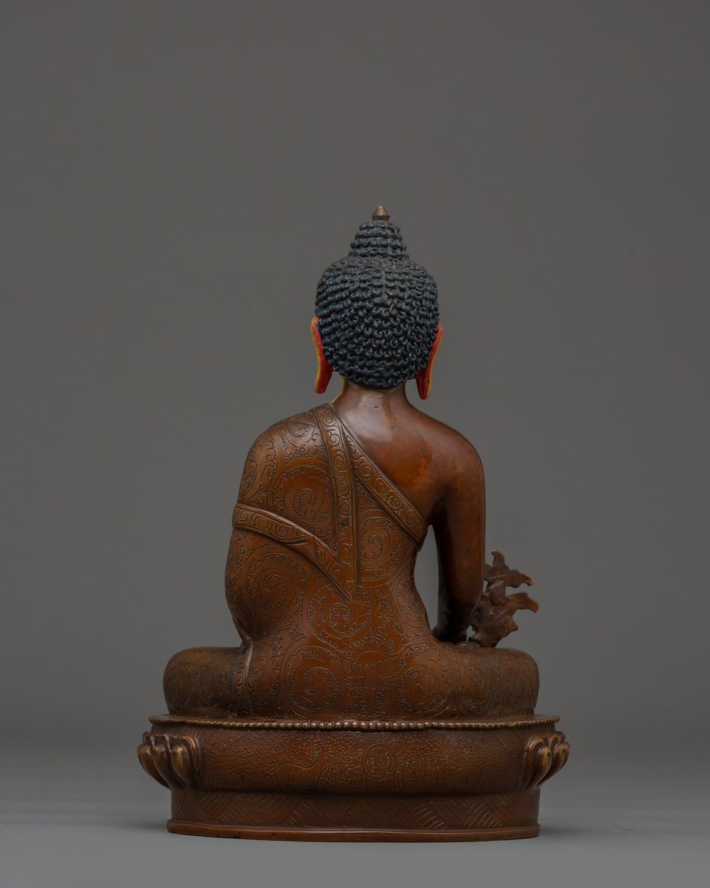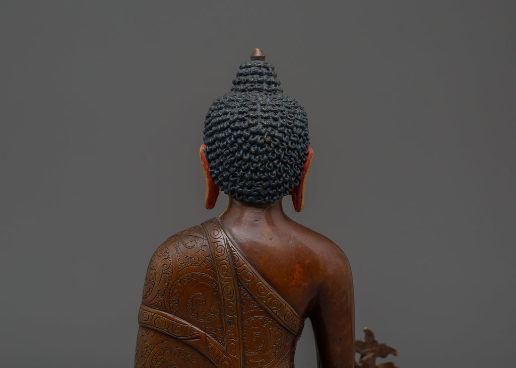 Spiritual Healing Deity Medicine Buddha stands 8.9” (22.5 cm) tall with a base width of 6.1” (15.5 cm) and weighs 1.55 kg. Crafted from an oxidized copper body, it features finely detailed gold and acrylic paintings that highlight its serene and healing presence. Known as Bhaisajyaguru, the Medicine Buddha represents the healing aspect of the Buddha’s wisdom and is revered for bringing physical and spiritual wellness. This statue is a powerful symbol for those seeking health, balance, and inner peace, making it a meaningful addition to meditation spaces or healing altars.
