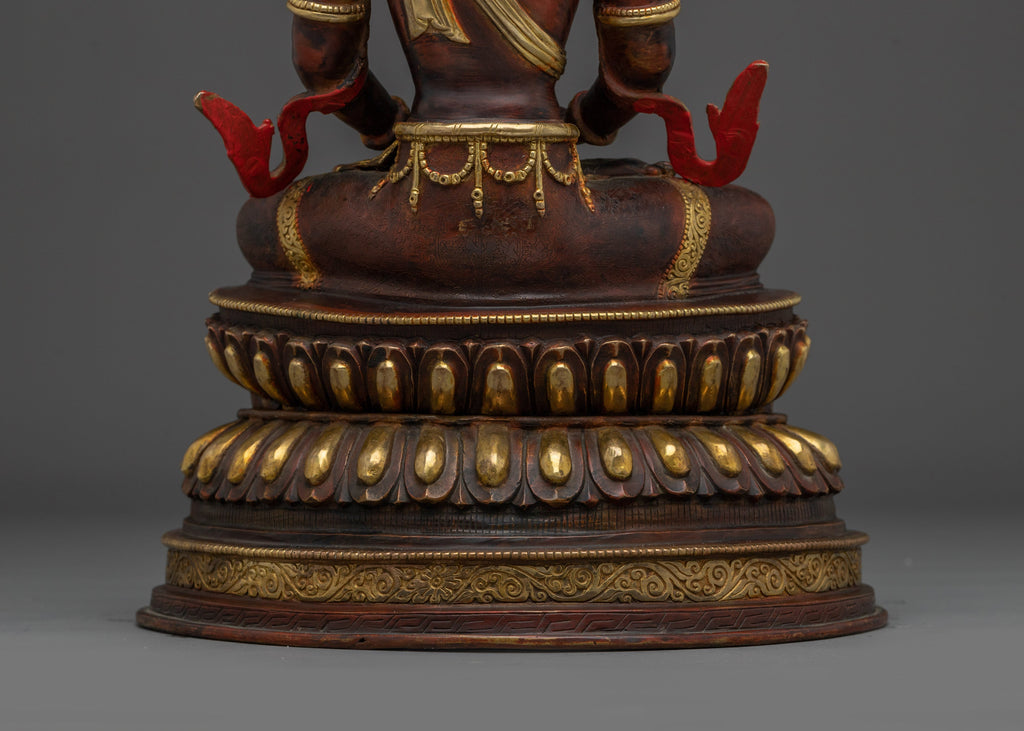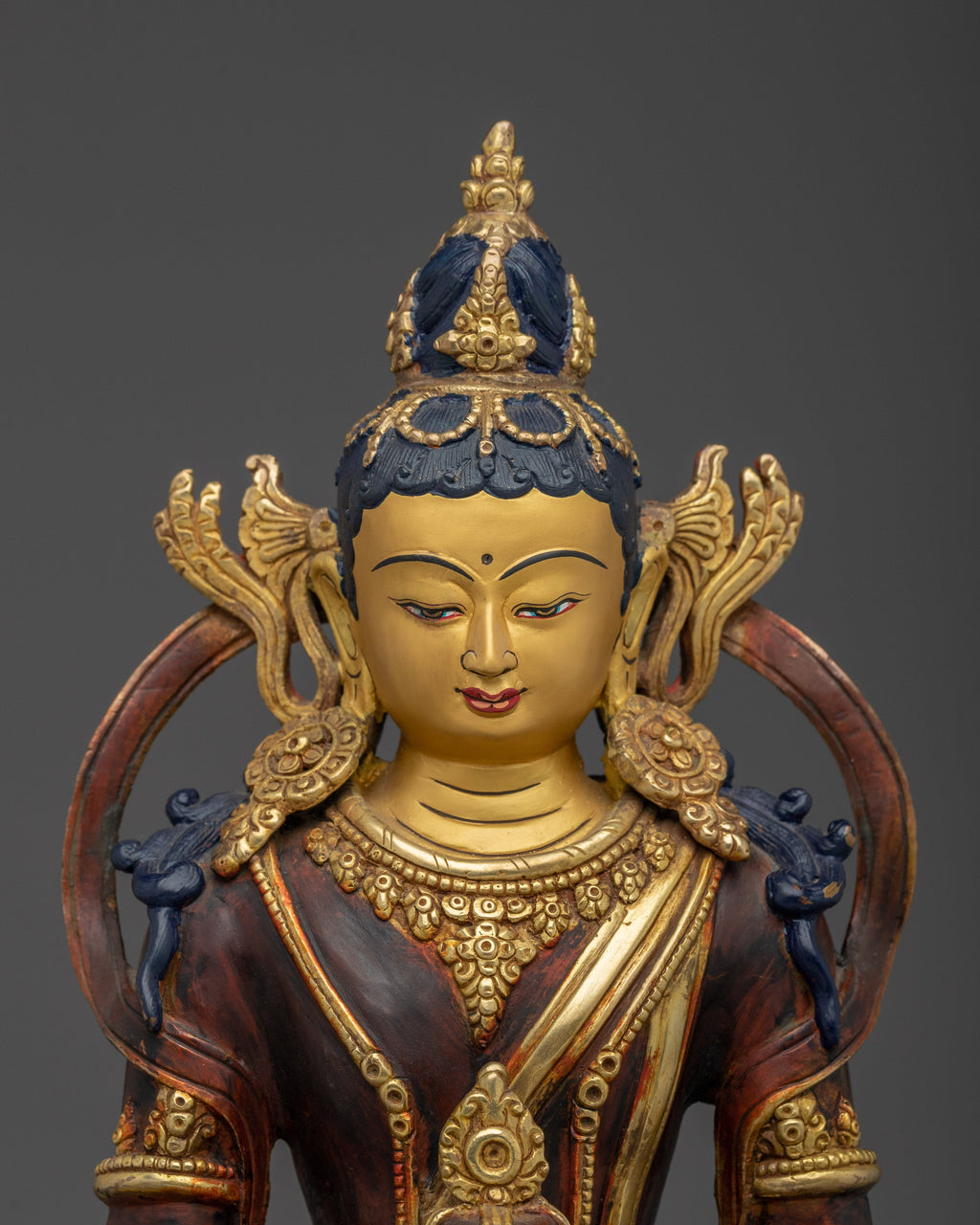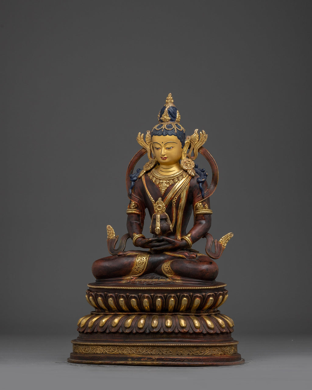 Spiritual longevity of Amitayus stands 15.7” (40 cm) tall with a base width of 10.6” (27 cm) and weighs 6.47 kg. It is handcrafted from an oxidized copper body, 24K gold gilding, and detailed gold and acrylic paintings. Amitayus, the Buddha of Infinite Life, symbolizes longevity, vitality, and spiritual prosperity. This finely detailed statue reflects both artistic mastery and deep spiritual meaning, making it an ideal centerpiece for a meditation space, altar, or sacred collection.