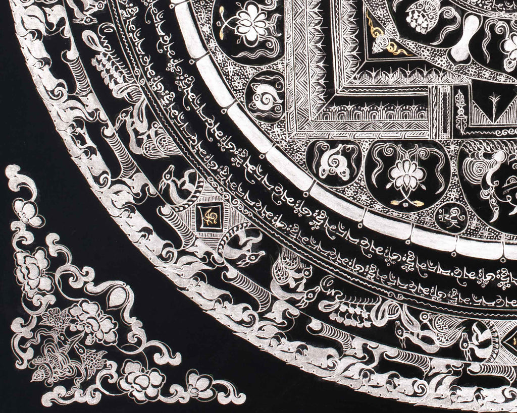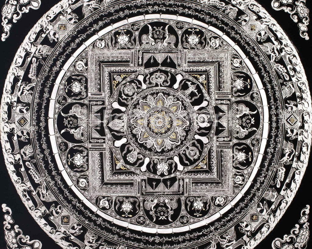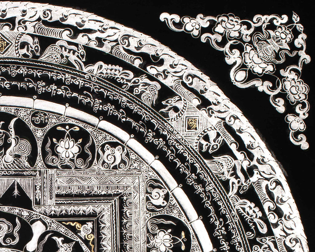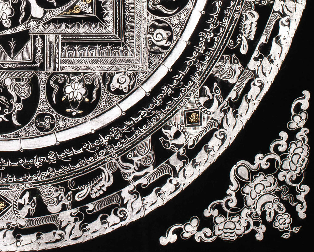 At the core of this mandala resides a potent spiritual symbol, encircled by sacred mantras, including "Om Mani Padme Hum," which radiate outward to invoke wisdom, compassion, and enlightenment. The pristine silver detailing enhances the energy of these mantras, establishing a spiritual ambiance that promotes mindfulness, meditation, and inner tranquility. This thangka is more than just a visual masterpiece; it also serves as a spiritual tool that brings balance, clarity, and serenity to any space. It is especially suitable for those seeking a deeper connection and reflection in their practice.
