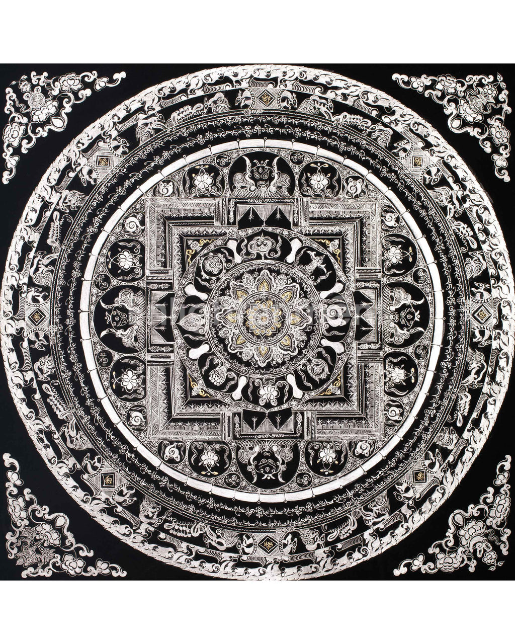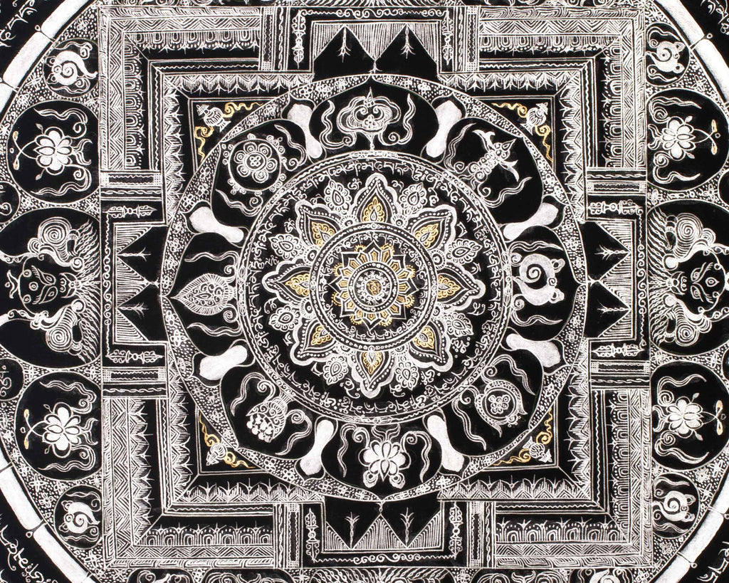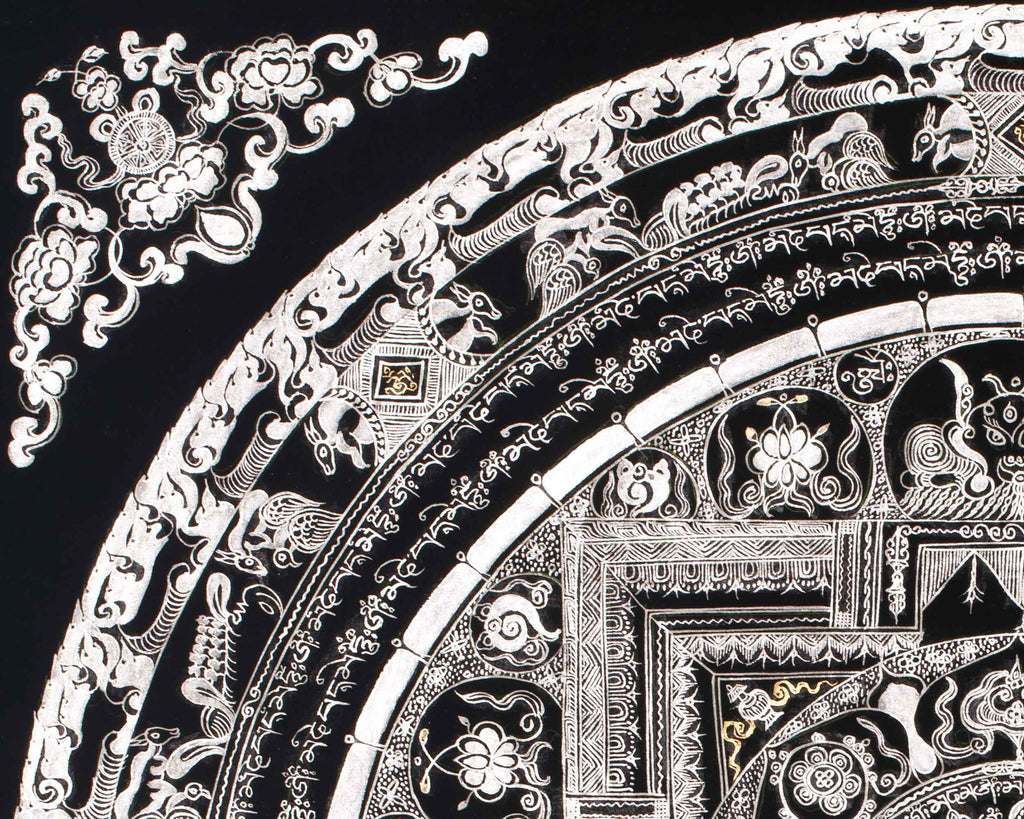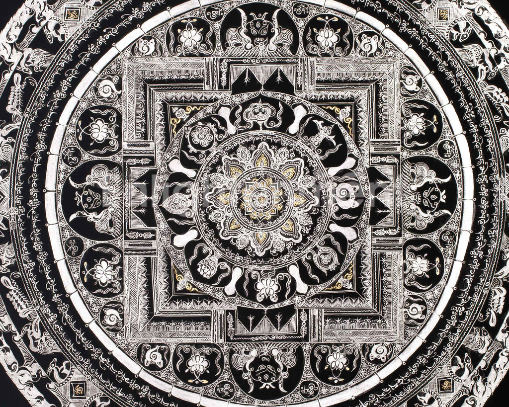At the core of this mandala resides a potent spiritual symbol, encircled by sacred mantras, including "Om Mani Padme Hum," which radiate outward to invoke wisdom, compassion, and enlightenment. The pristine silver detailing enhances the energy of these mantras, establishing a spiritual ambiance that promotes mindfulness, meditation, and inner tranquility. This thangka is more than just a visual masterpiece; it also serves as a spiritual tool that brings balance, clarity, and serenity to any space. It is especially suitable for those seeking a deeper connection and reflection in their practice.