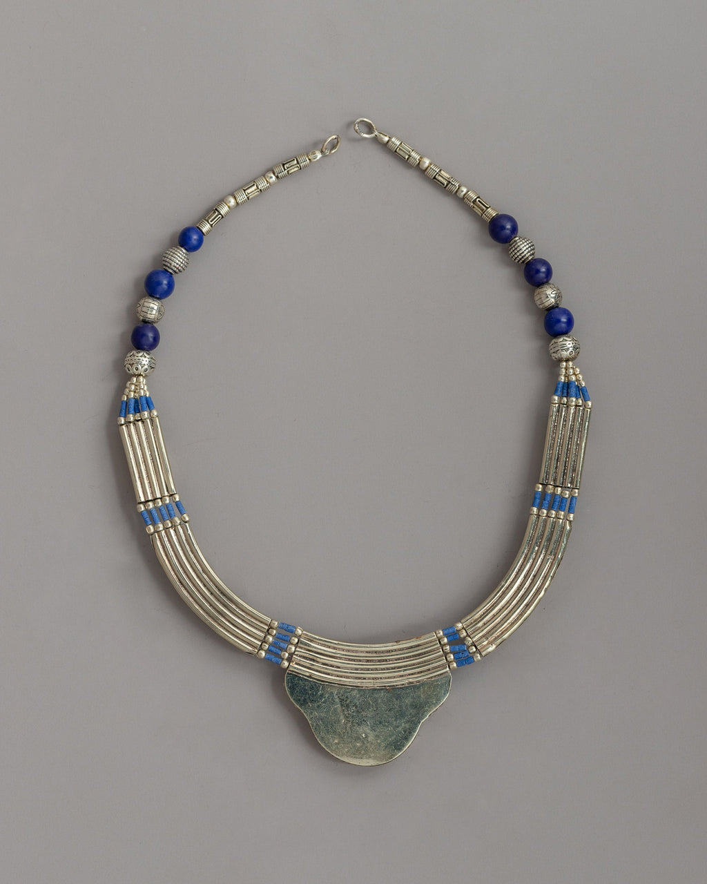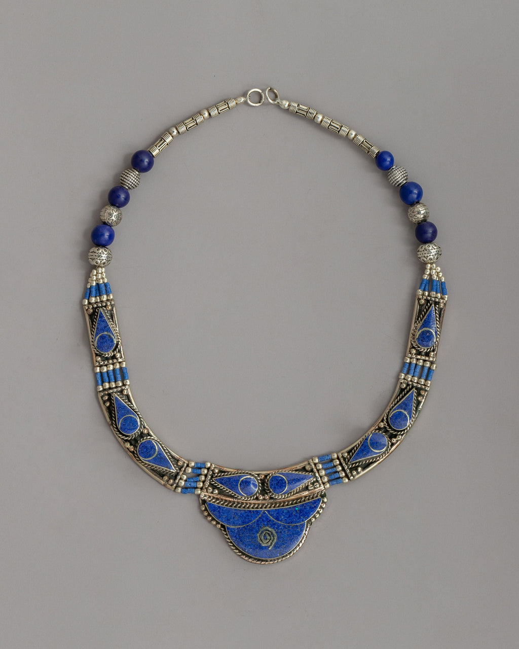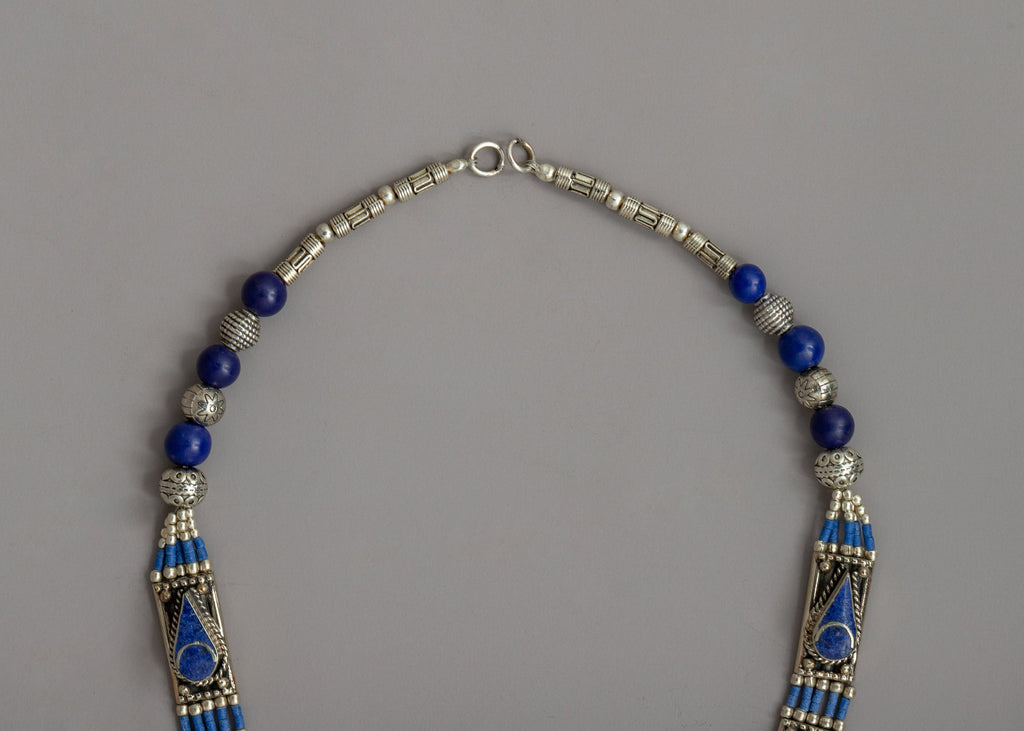 This is an exquisitely crafted spiritual necklace. The necklace is made of white metal and has intricate designs with vibrant blue lapis lazuli (artificial stone) stones set along its length. The design features alternating beads and a central pendant set with lapis lazuli, resulting in a striking visual appeal.