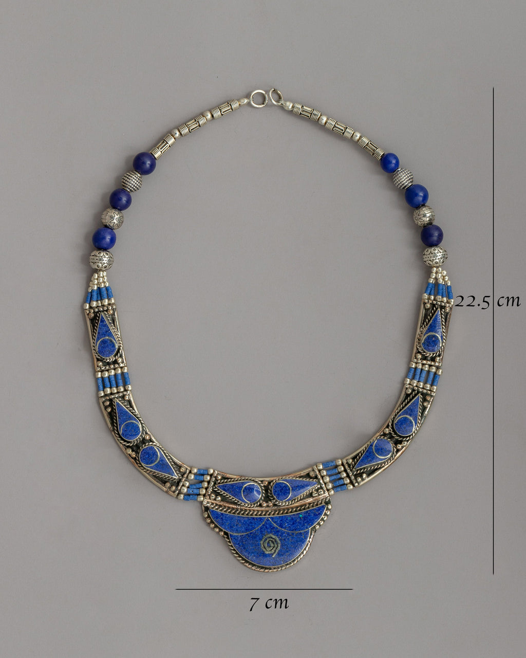 The necklace is 25.5 cm long and 7 cm wide, making it suitable for casual and formal outfits. It weighs just 0.118 kg, making it comfortable for long periods. The lapis lazuli, known for its deep blue color, adds elegance and is a popular stone in spiritual jewelry due to its purported benefits.