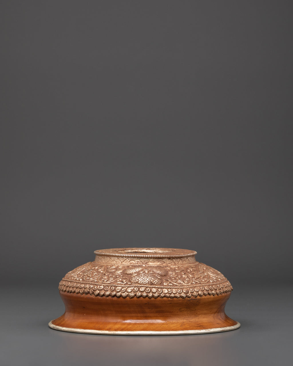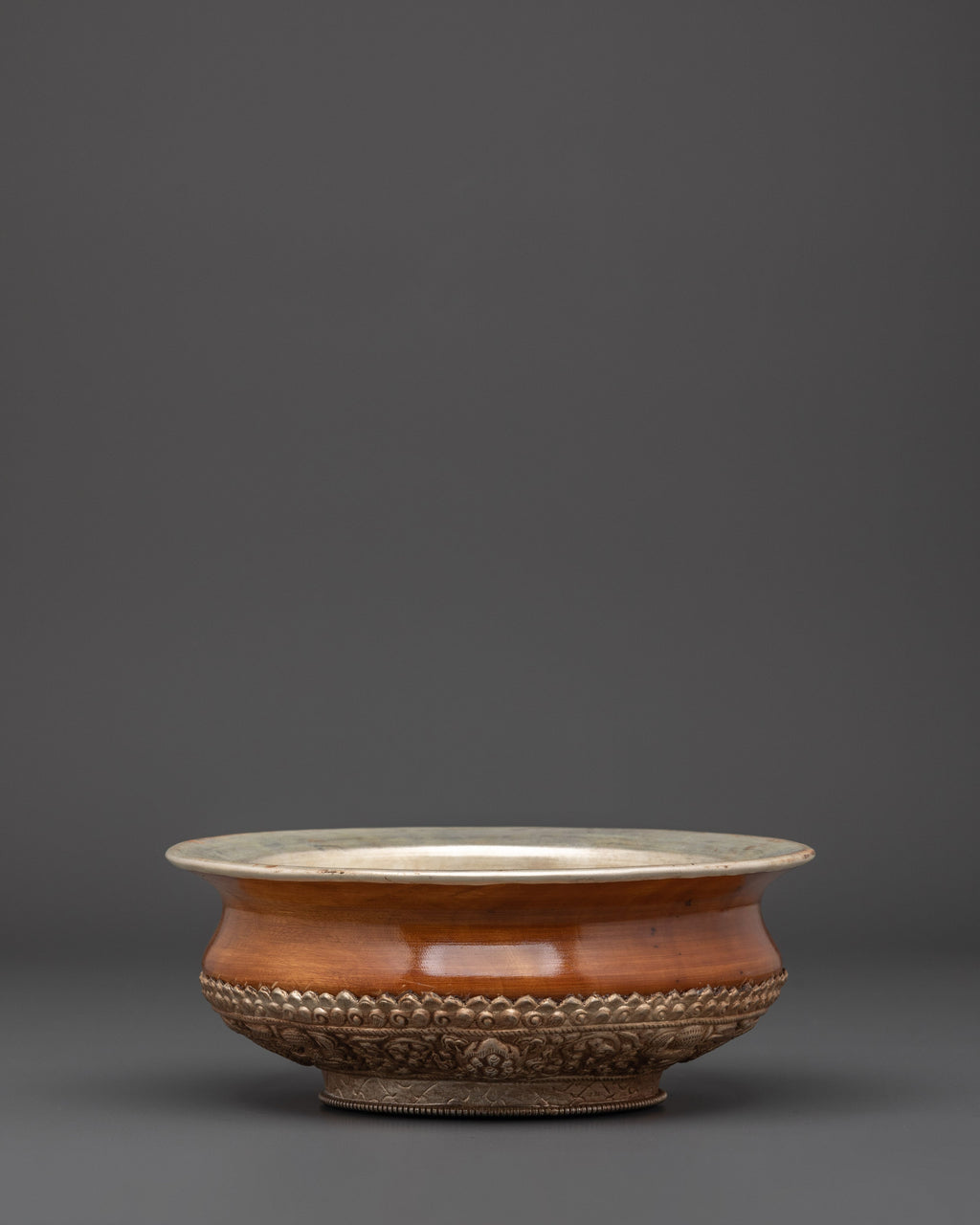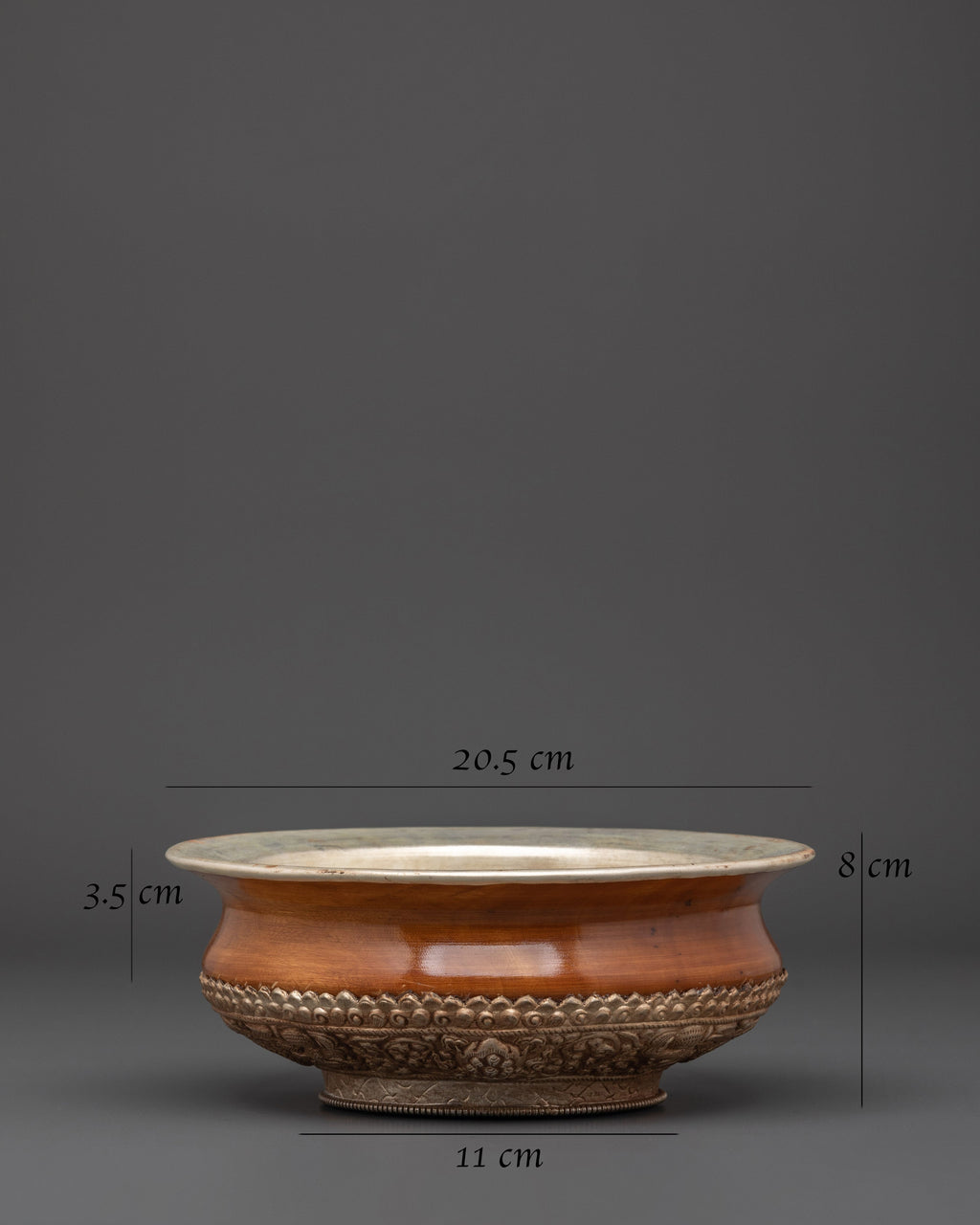 This offering vessel, crafted from wood and white metal, exemplifies traditional workmanship and sacred geometry. The polished white metal rim and inner lining symbolize purity, while the wooden base represents anchoring and earth energy. This altar bowl is more than just decoration; it serves as an effective spiritual instrument for enhancing prayer, increasing awareness, and conducting holy ceremonies. Use this elegant bowl as a Buddhist offering vessel, meditation decor, or sacred dish in your ritual space. Its size and design make it ideal for home shrines, temples, or yoga studios.