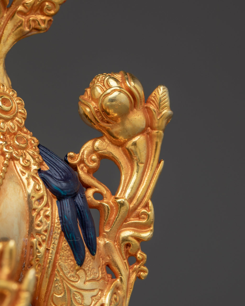 As depicted, Green Tara is shown seated on a lotus throne with her right leg typically extended forward, signifying her active compassion and willingness to help. Her hands express profound meaning through their gestures; the right hand is displayed in the "gesture of giving" (Varada Mudra), symbolizing her boundless generosity and willingness to provide blessings. Meanwhile, her left hand delicately holds a blue lotus (Utpala), a symbol of purity and spiritual awakening, offering protection and reassurance to those who seek her guidance.