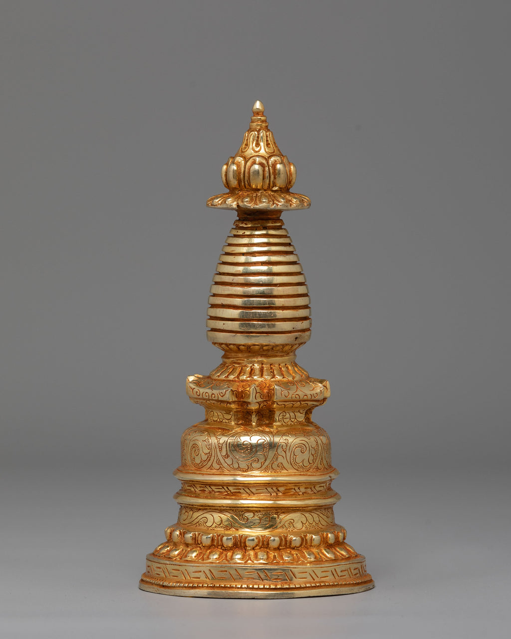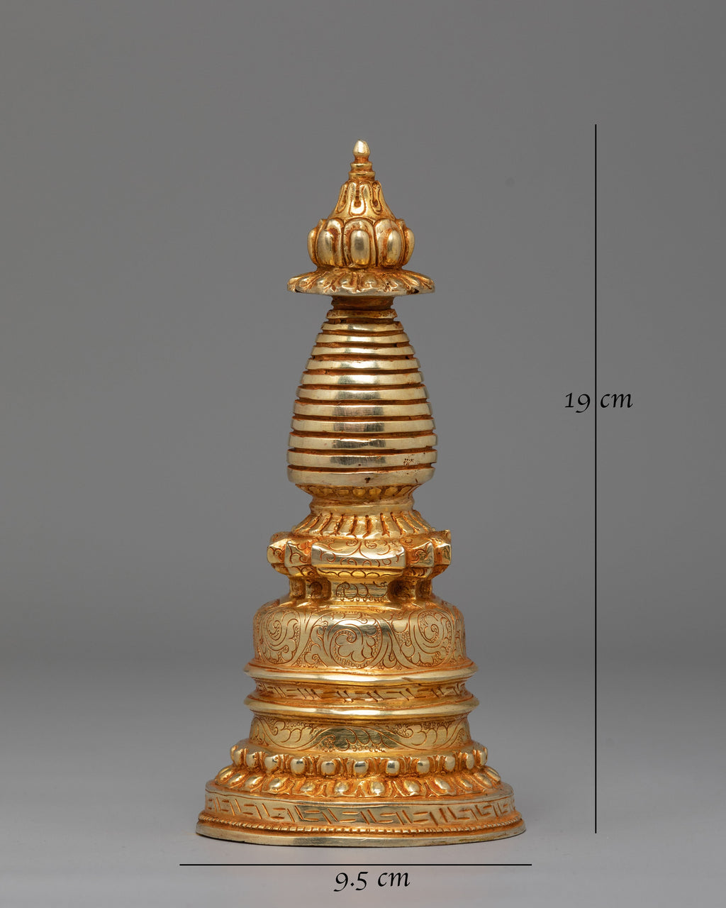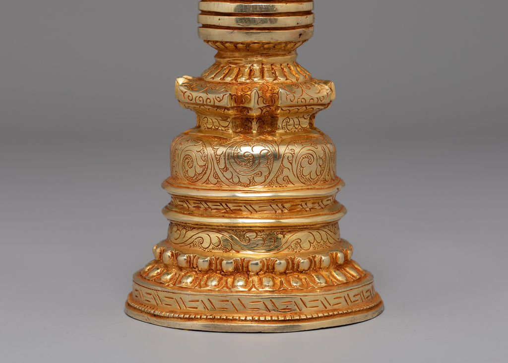 The Spiritual Protection Stupa is a sacred representation of peace, purity, and divine energy. Expertly handcrafted from copper with a radiant gold-plated finish, this elegant piece stands 7.5 inches high and 3.75 inches wide, weighing 0.65kg. The stupa’s golden hue reflects light beautifully, symbolizing enlightenment and the awakened mind. Traditionally used in Buddhist practice, it is believed to bring protection, harmony, and spiritual strength to any space, making it an ideal addition to meditation rooms or sacred home altars.